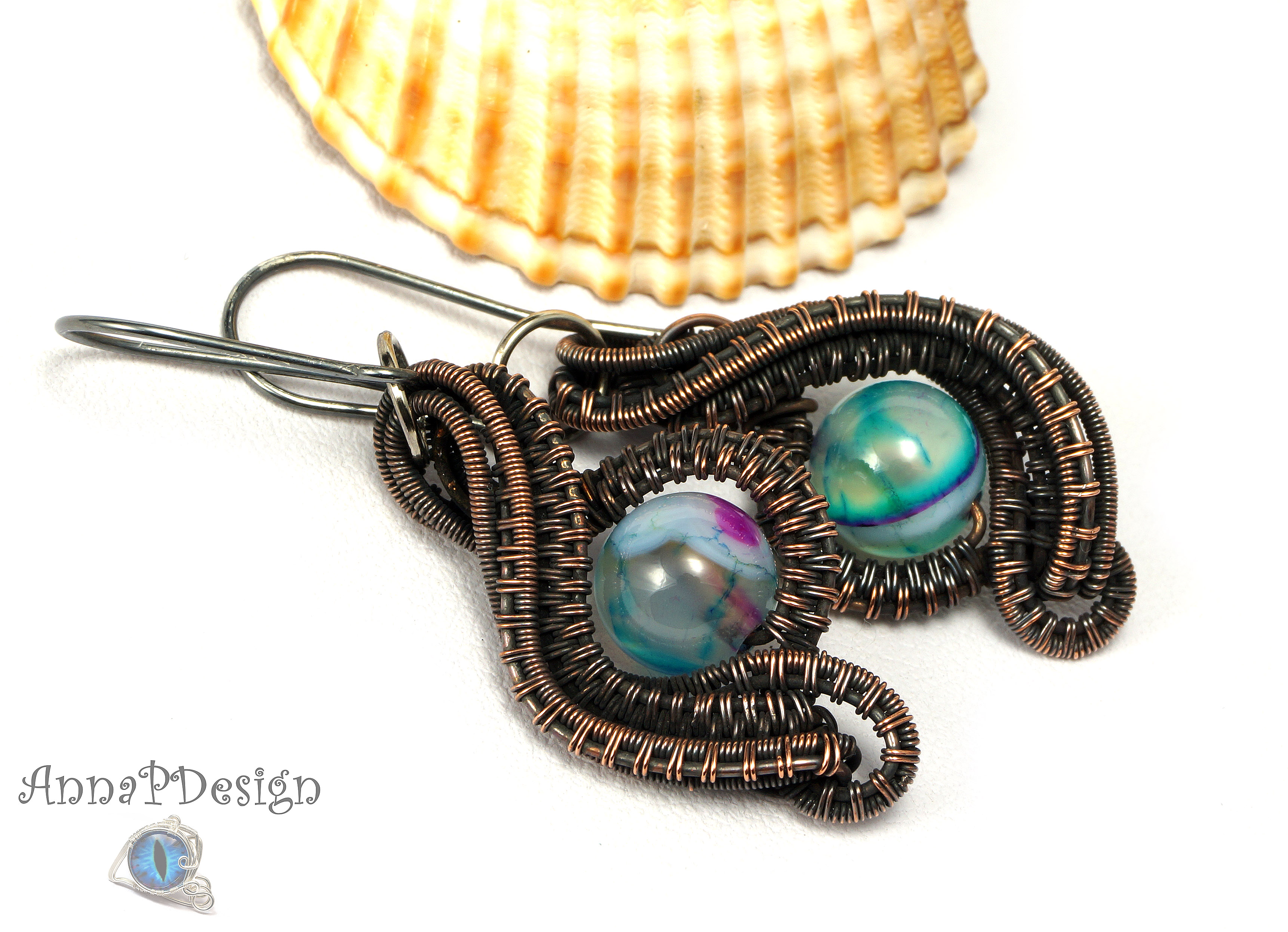 Agat dragon veins, miedziane kolczyki z agatem oko, evil eye, ręcznie wykonane na prezent dla niej