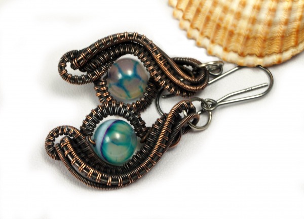 Biżuteria wykonana patynowanej miedzi, w kolczykach wykorzystane zostały srebrne bigle.