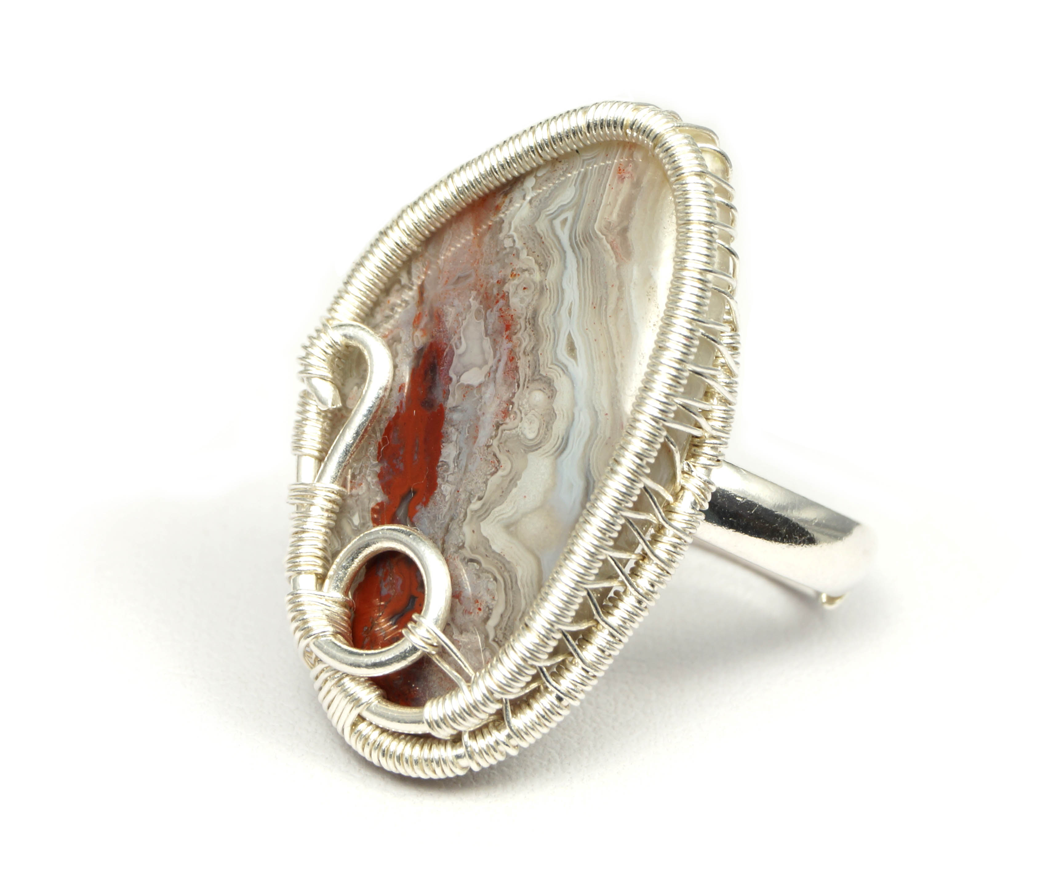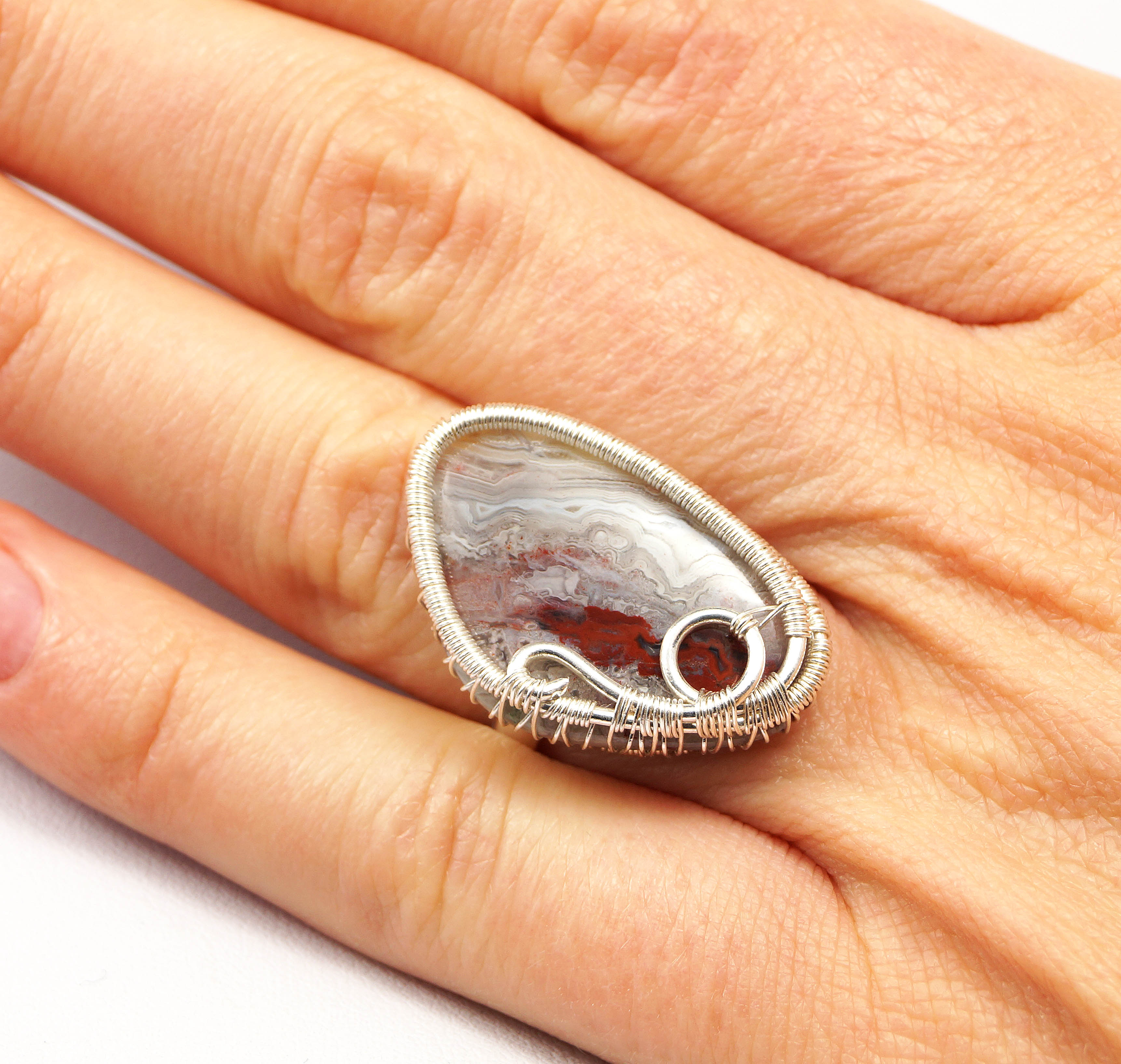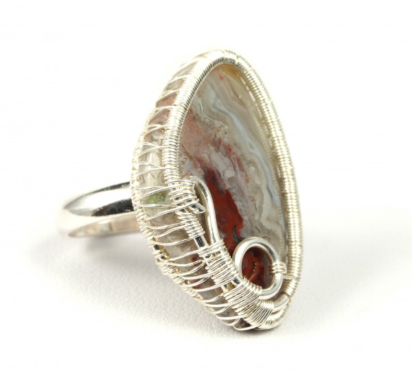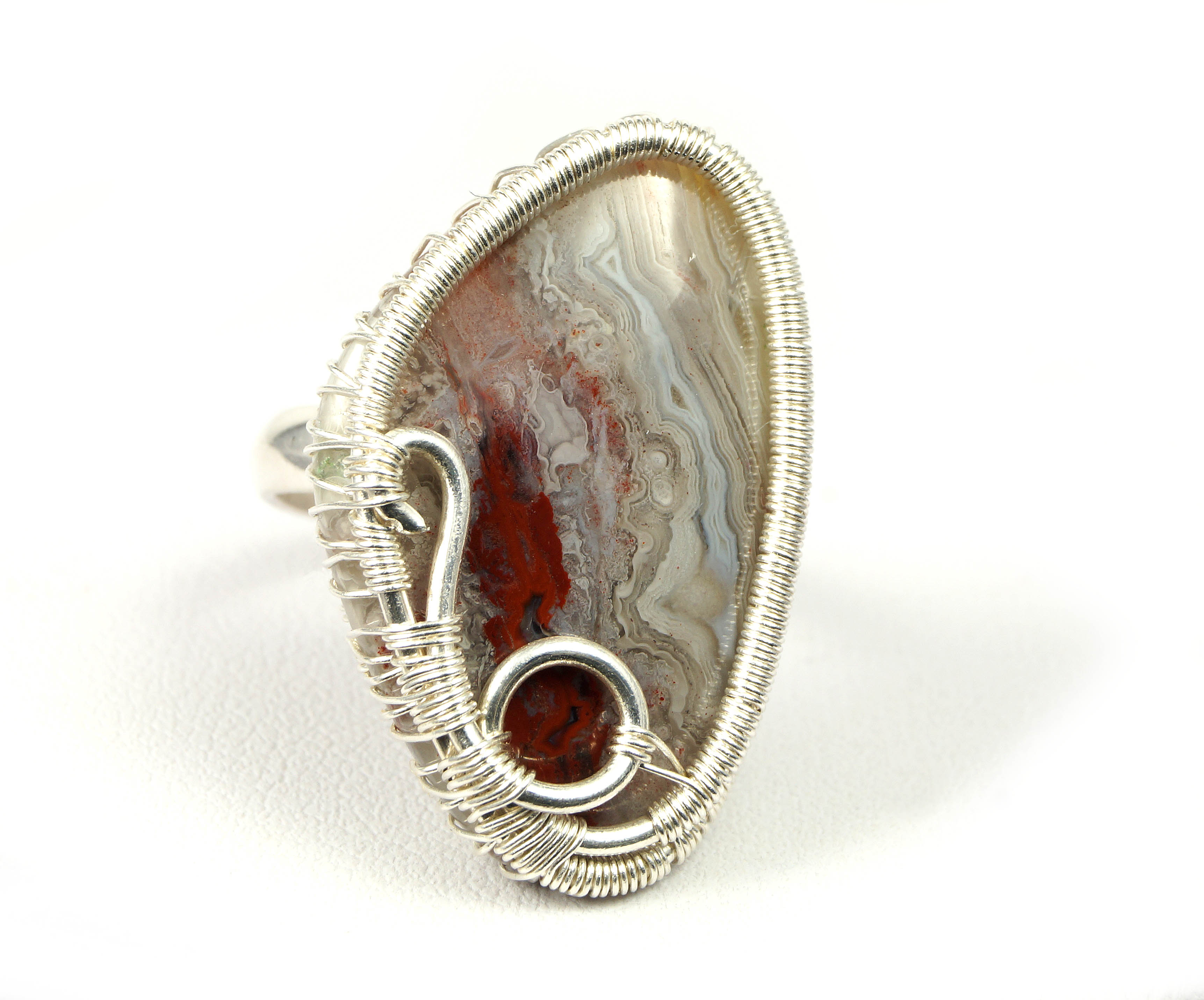 Misternie wykonany pierścionek z kaboszonem agatu koronkowego, crazy lace.