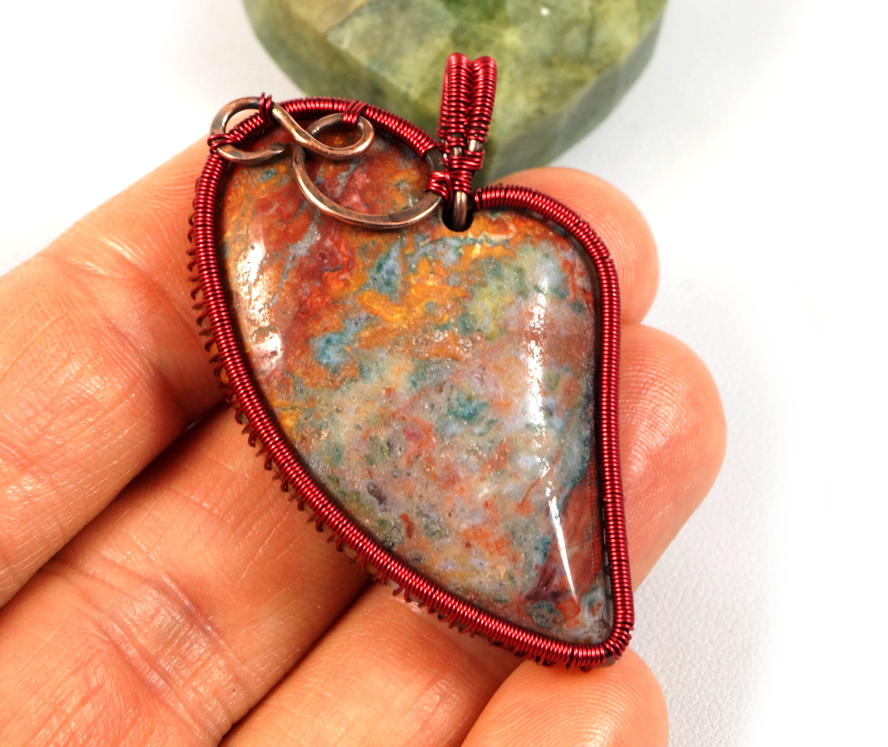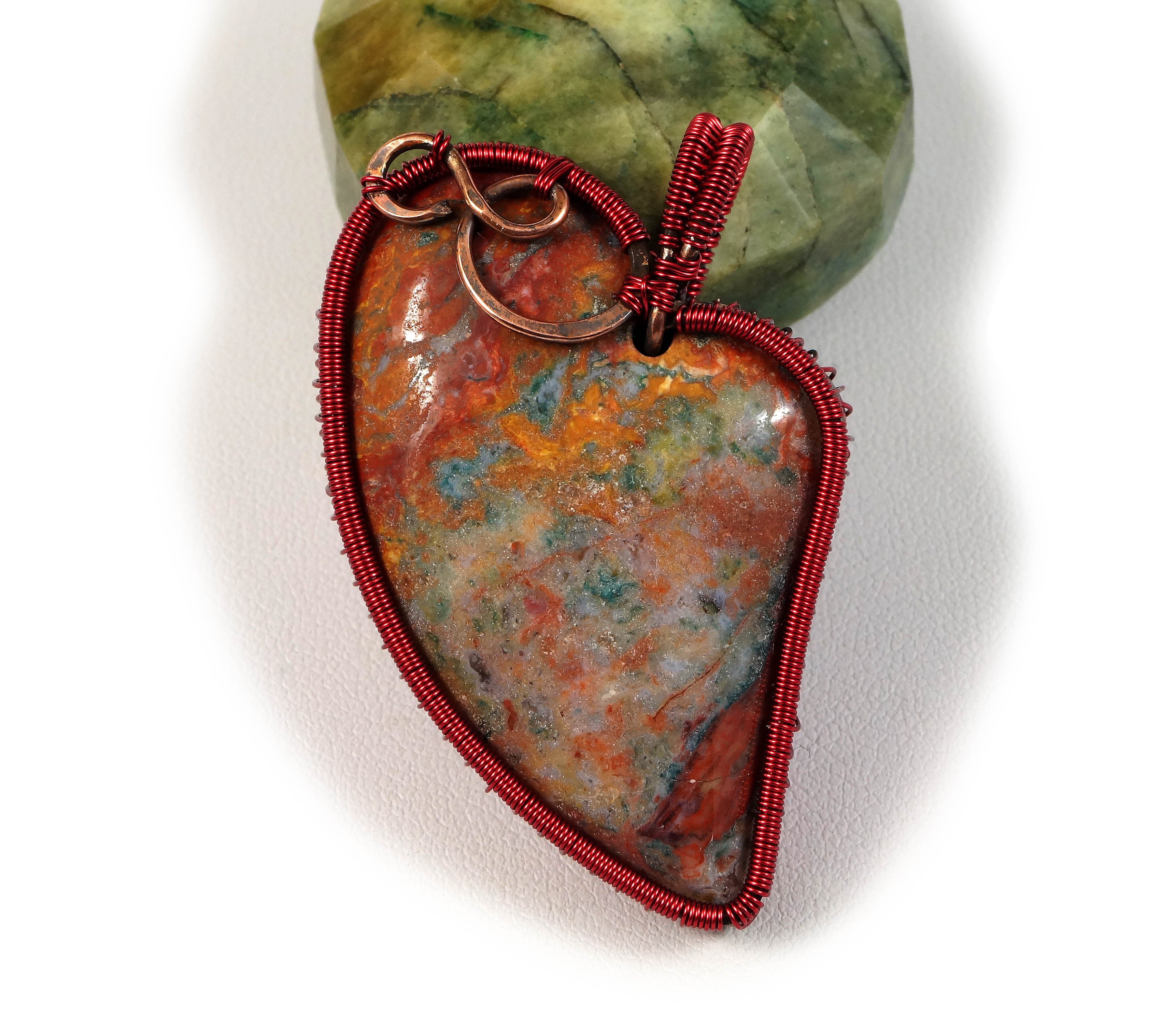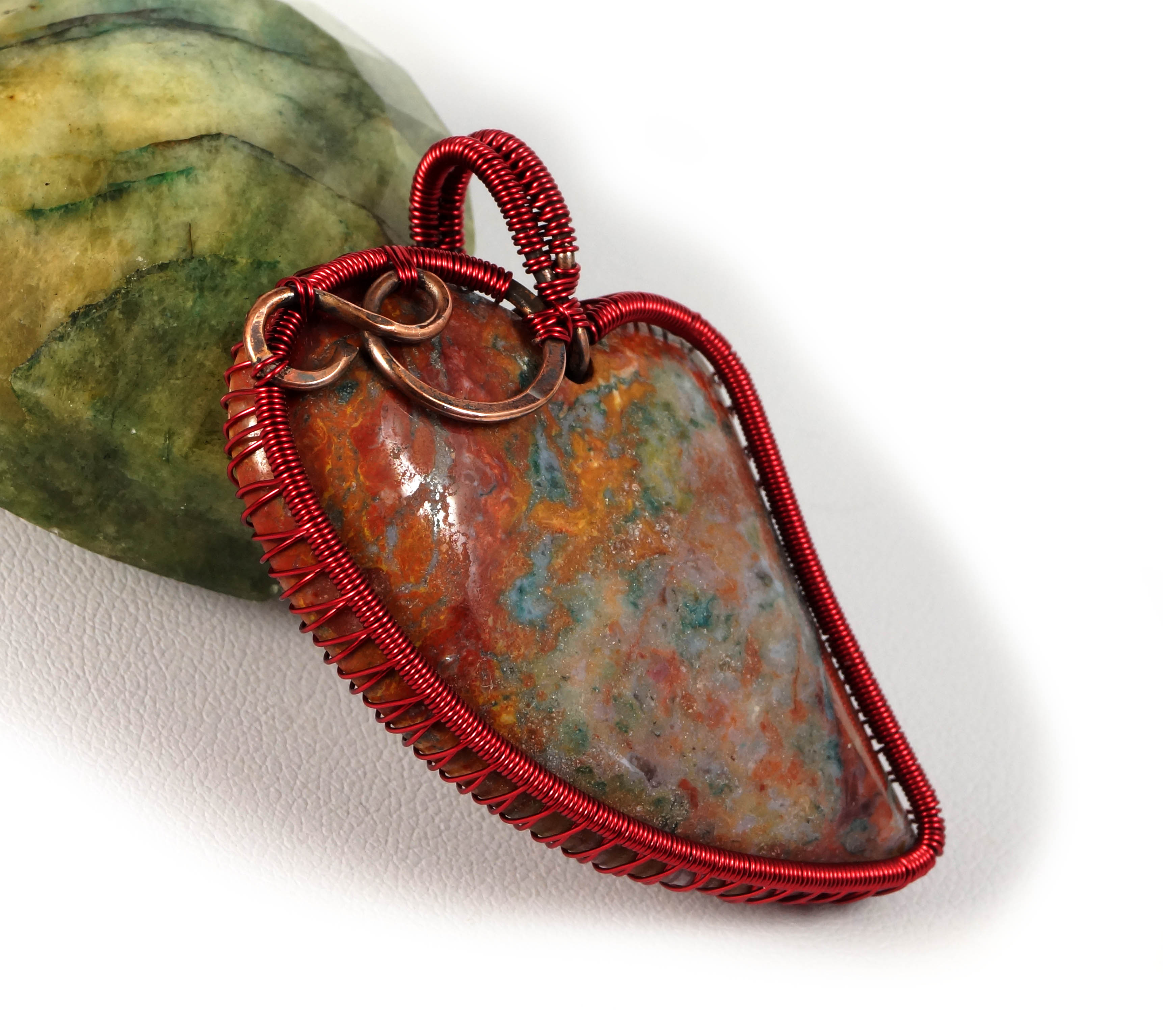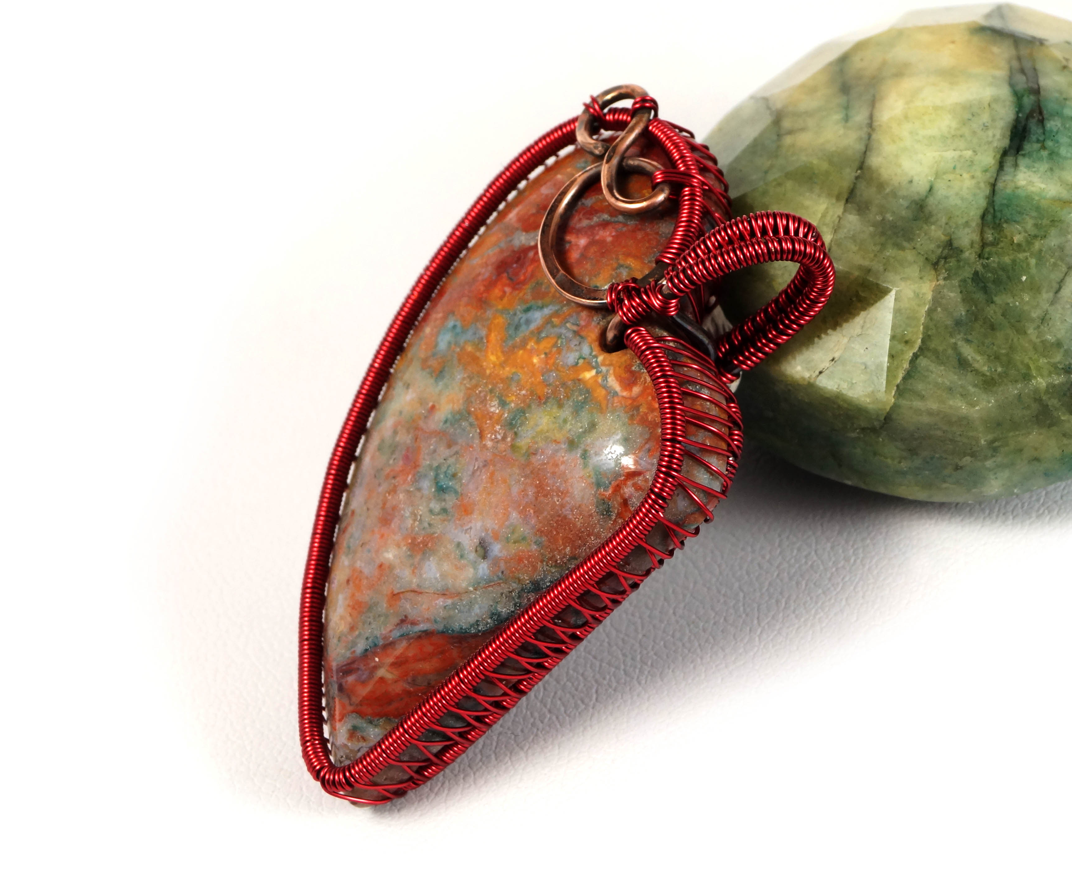 Bajeczny, misternie pleciony wisior z agatem szaro czerwonym. Wisior zaprojektowany i wykonany przeze mnie od podstaw bardzo pracochłonną i precyzyjną techniką wire-wrapping z patynowanej, emaliowanej miedzi.