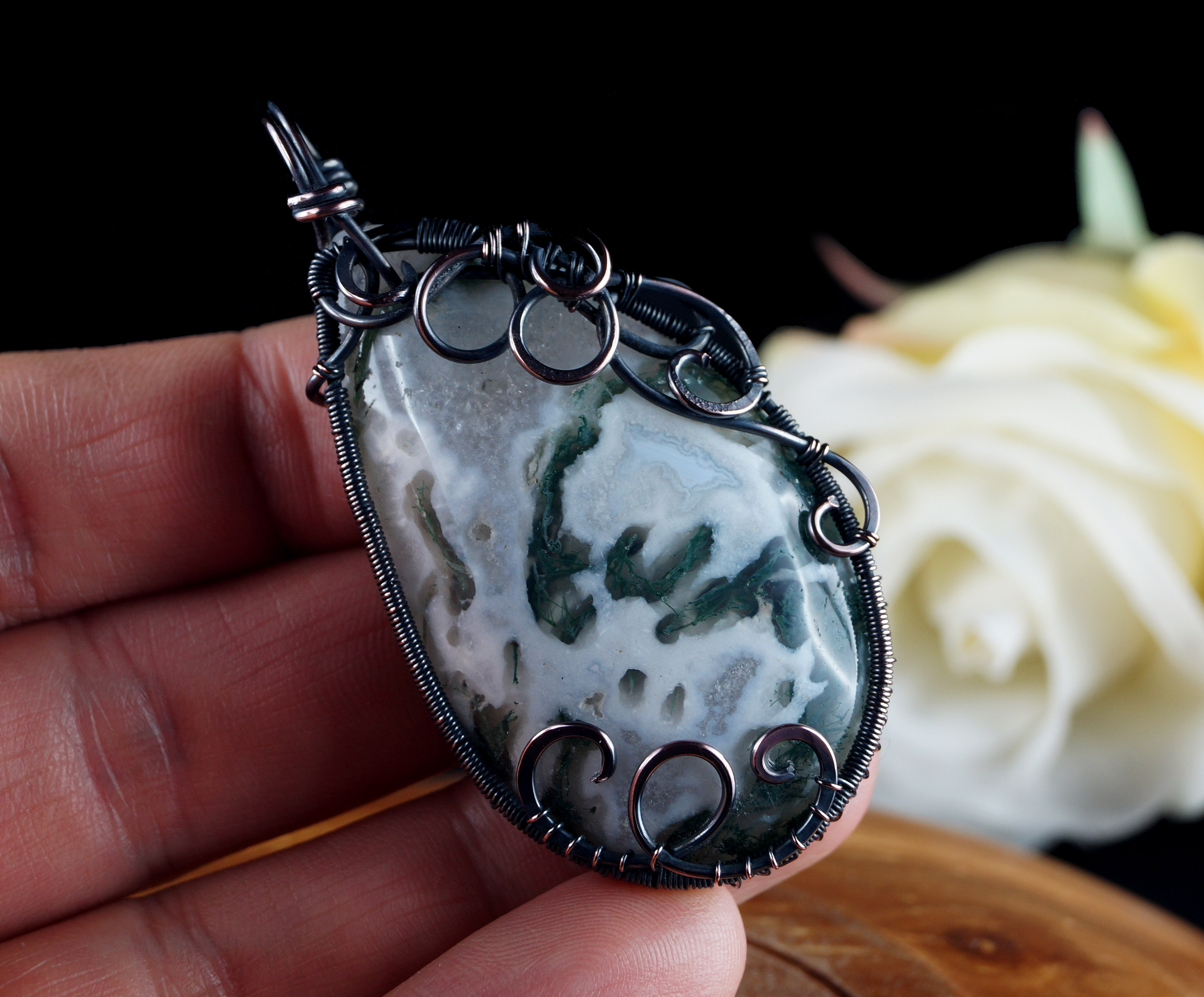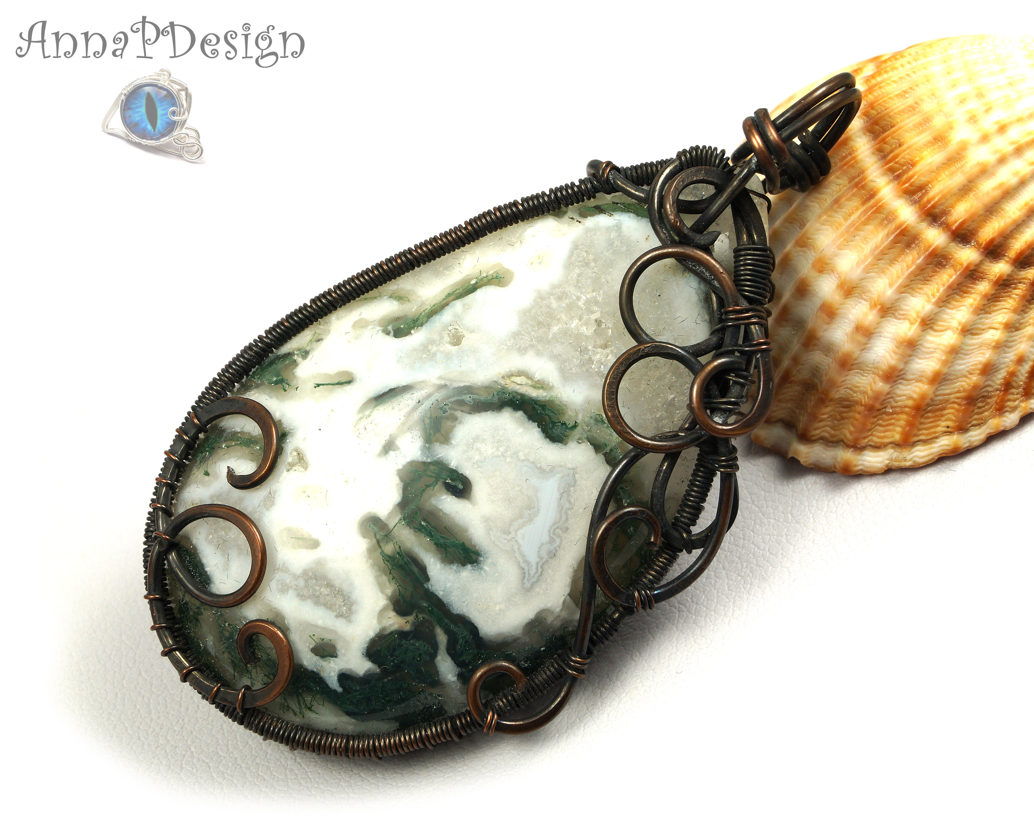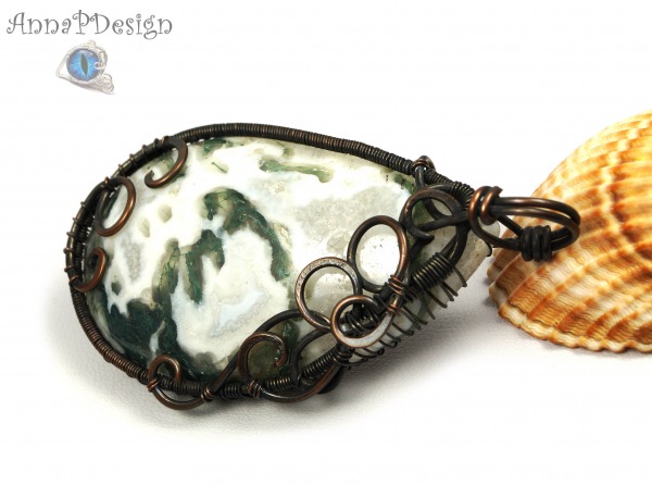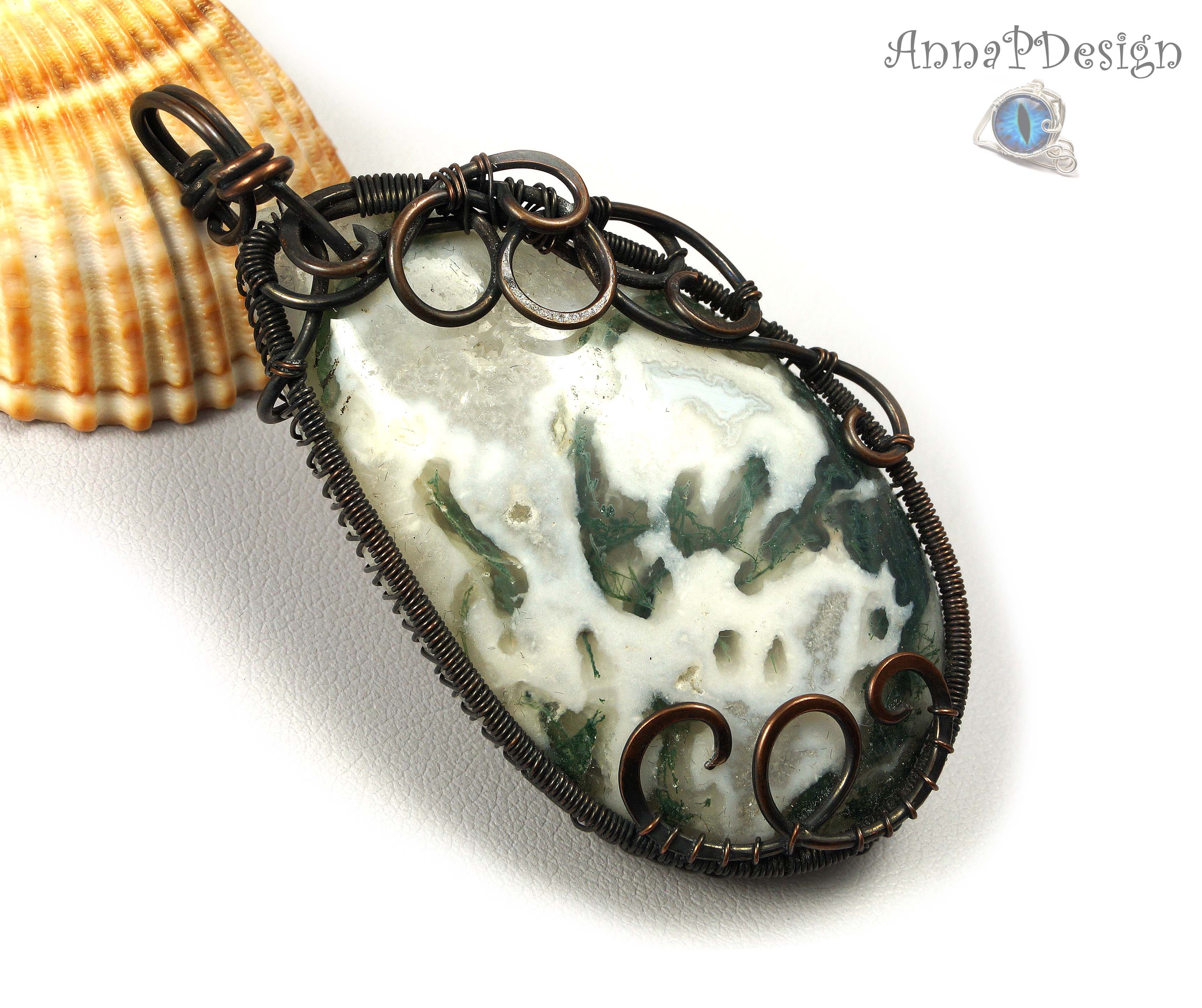 Agat, wisior z miedzi z agatem mszystym, ręcznie wykonany na prezent dla niej