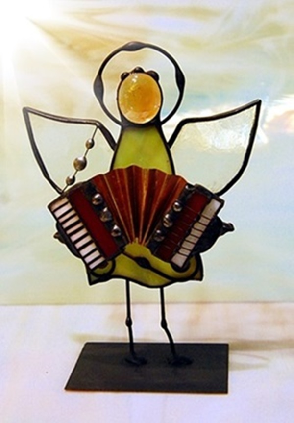 Aniołek witrażowy wykonany z wysokiej jakości szkła witrażowego spectrum (USA) i metali kolorowych (miedź, mosiądz, cyna). Wykonanie technika Tiffany. Patynowany na czarno. Wysokość aniołka 13 cm, podstawka 6 x 6 cm. Możliwy wybór różnej kolorystyki przez kupującego.