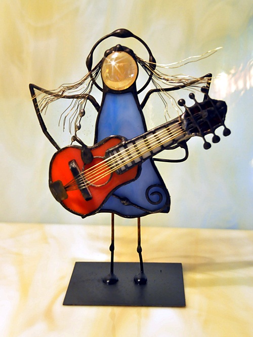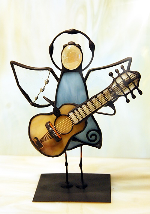 Aniołek witrażowy wykonany z wysokiej jakości szkła witrażowego spectrum (USA) i metali kolorowych (miedź, mosiądz, cyna). Wykonanie technika Tiffany. Patynowany na czarno. Wysokość aniołka 13 cm, podstawka 6 x 6 cm. Możliwy wybór różnej kolorystyki przez kupującego.