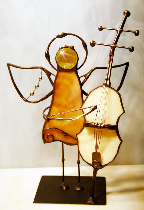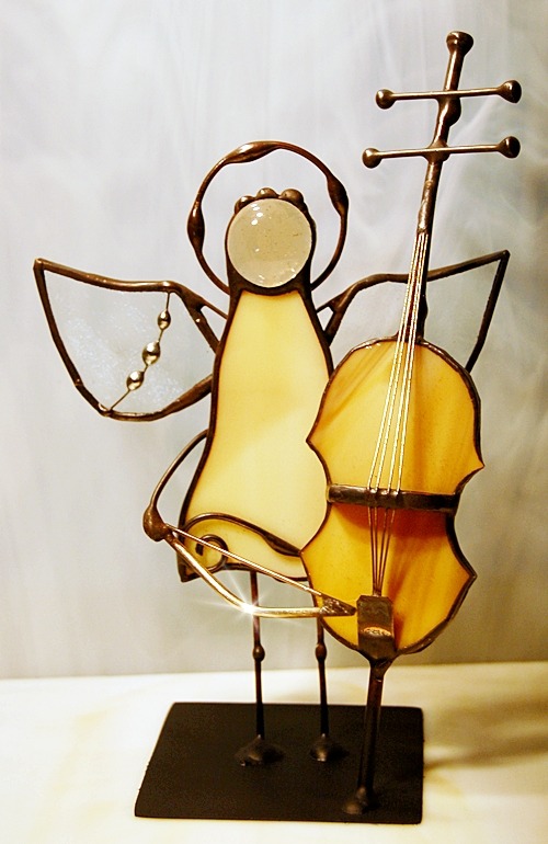 Aniołek witrażowy wykonany z wysokiej jakości szkła witrażowego spectrum (USA) i metali kolorowych (miedź, mosiądz, cyna). Wykonanie technika Tiffany. Patynowany na czarno. Wysokość aniołka 13 cm, podstawka 6 x 6 cm. Możliwy wybór różnej kolorystyki przez kupującego.