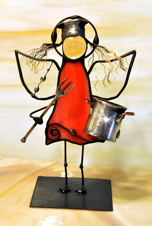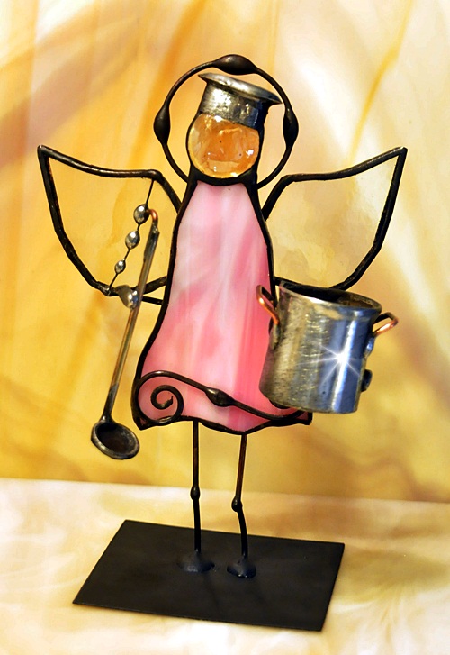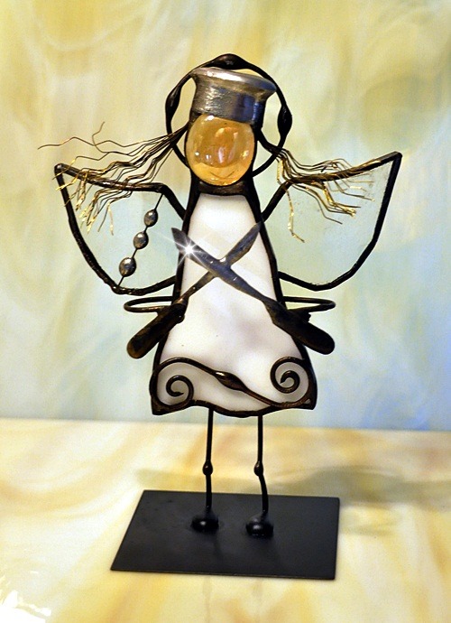 Aniołek witrażowy wykonany z wysokiej jakości szkła witrażowego spectrum (USA) i metali kolorowych (miedź, mosiądz, cyna). Wykonanie technika Tiffany. Patynowany na czarno. Wysokość aniołka 13 cm, podstawka 6 x 6 cm. Możliwy wybór różnej kolorystyki przez kupującego.