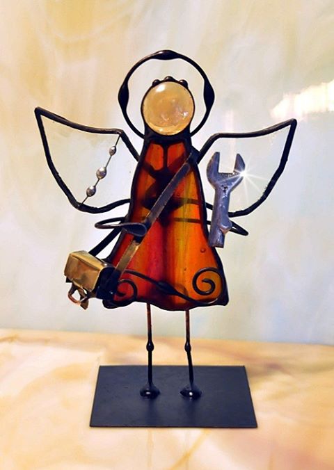 Aniołek witrażowy wykonany z wysokiej jakości szkła witrażowego spectrum (USA) i metali kolorowych (miedź, mosiądz, cyna). Wykonanie technika Tiffany. Patynowany na czarno. Wysokość aniołka 13 cm, podstawka 6 x 6 cm. Możliwy wybór różnej kolorystyki przez kupującego.