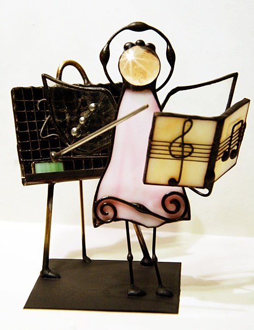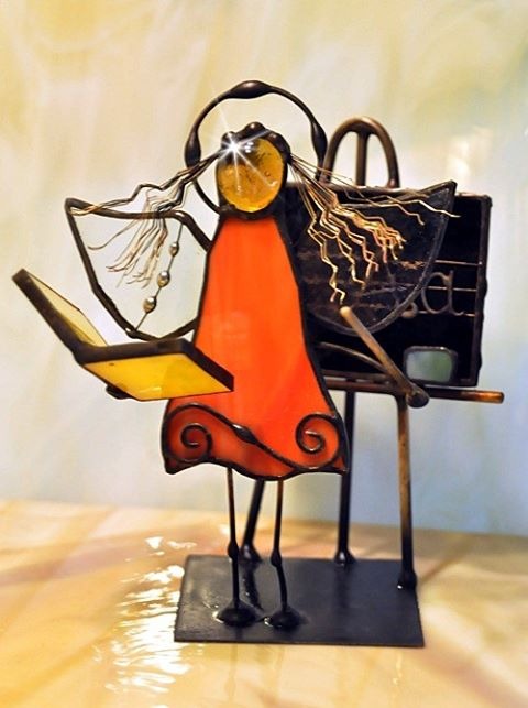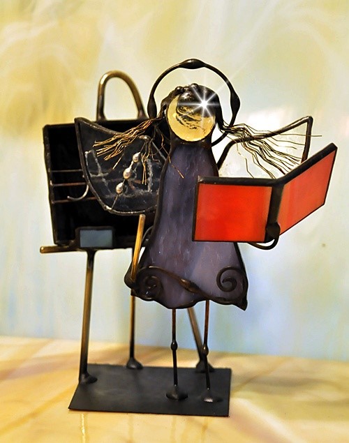 Aniołek witrażowy wykonany z wysokiej jakości szkła witrażowego spectrum (USA) i metali kolorowych (miedź, mosiądz, cyna). Wykonanie technika Tiffany. Patynowany na czarno. Wysokość aniołka 13 cm, podstawka 6 x 6 cm. Możliwy wybór różnej kolorystyki przez kupującego.