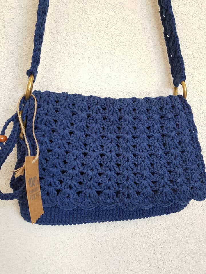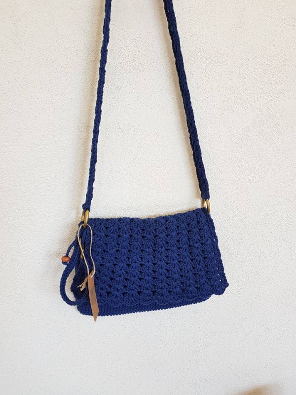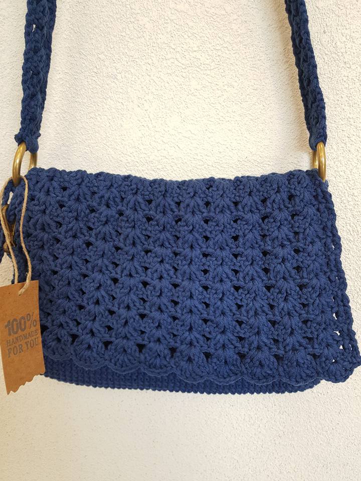 Ażurowa torebka na ramię, ręcznie wykonana z bawełnianego sznurka, kolor dzinsowy niebieski.