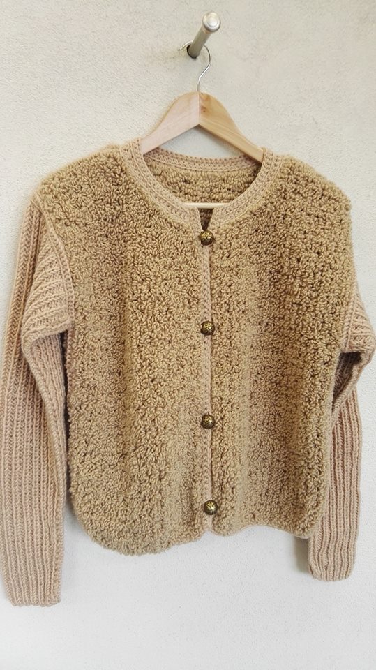 Pomysłowy,ciepły i niezastąpiony tej jesieni - KARDIGAN - BOMBERKA :) wykonany ręcznie z mieszanki wełny typu boucle (przód i tył) i alpaki (rękawy). Świetnie zastąpi żakiet lub sweter. Rozmiar 36. Produkty ręcznie robione pierzemy ręcznie,suszymy na płasko. POLECAM!