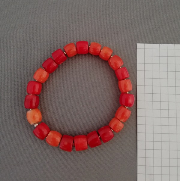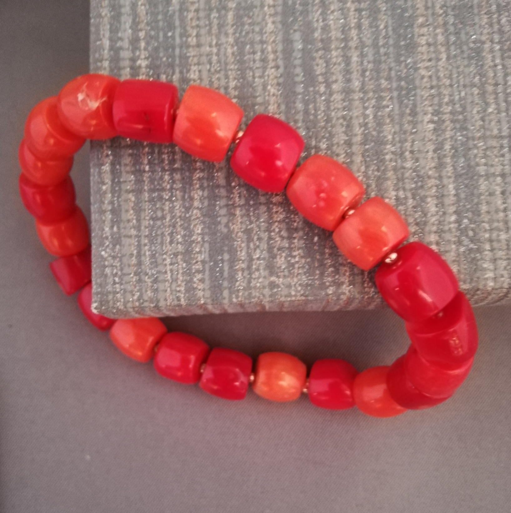 Bransoletka z korala na gumce, wielkość koralików ok 8-9 mm, przekładane kuleczkami srebrnymi . Pasuje na nadgarstek o obwodzie ok. 17 cm.