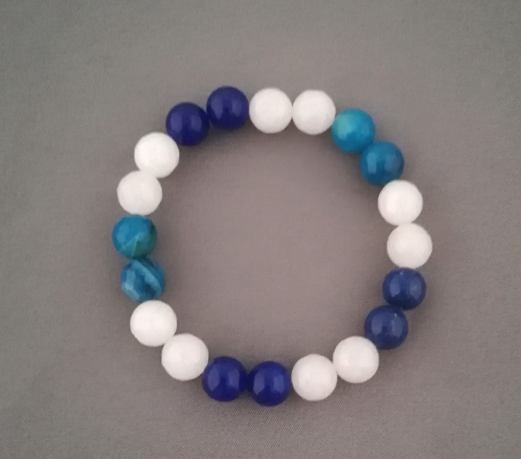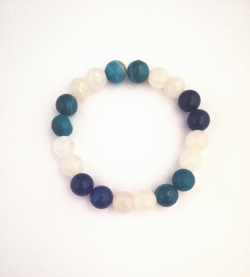 Bransoletka z kulek jadeitu i agatu, 10mm, na gumce. Kulki białe mleczne -fasetowane, granatowe -gładkie i fasetowane.
