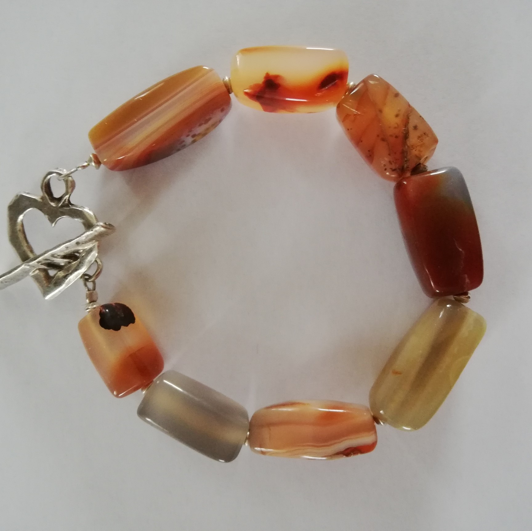 Bransoletka z prostokątów karneolu , kamienie o długości 2-3 cm, przekładane satelitkami ze srebra , zapięcie typu "skobel" z metalu antyalergicznego.