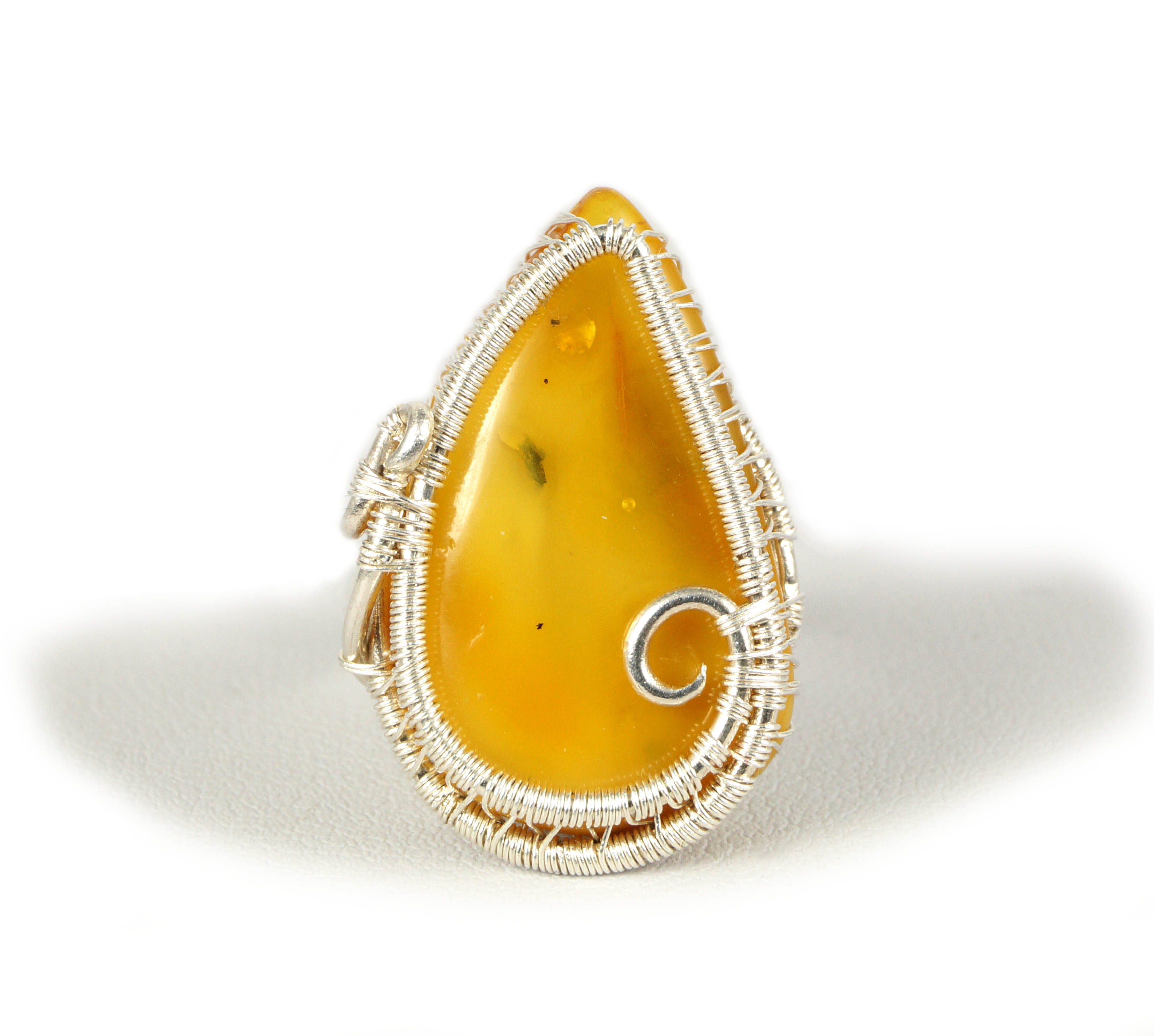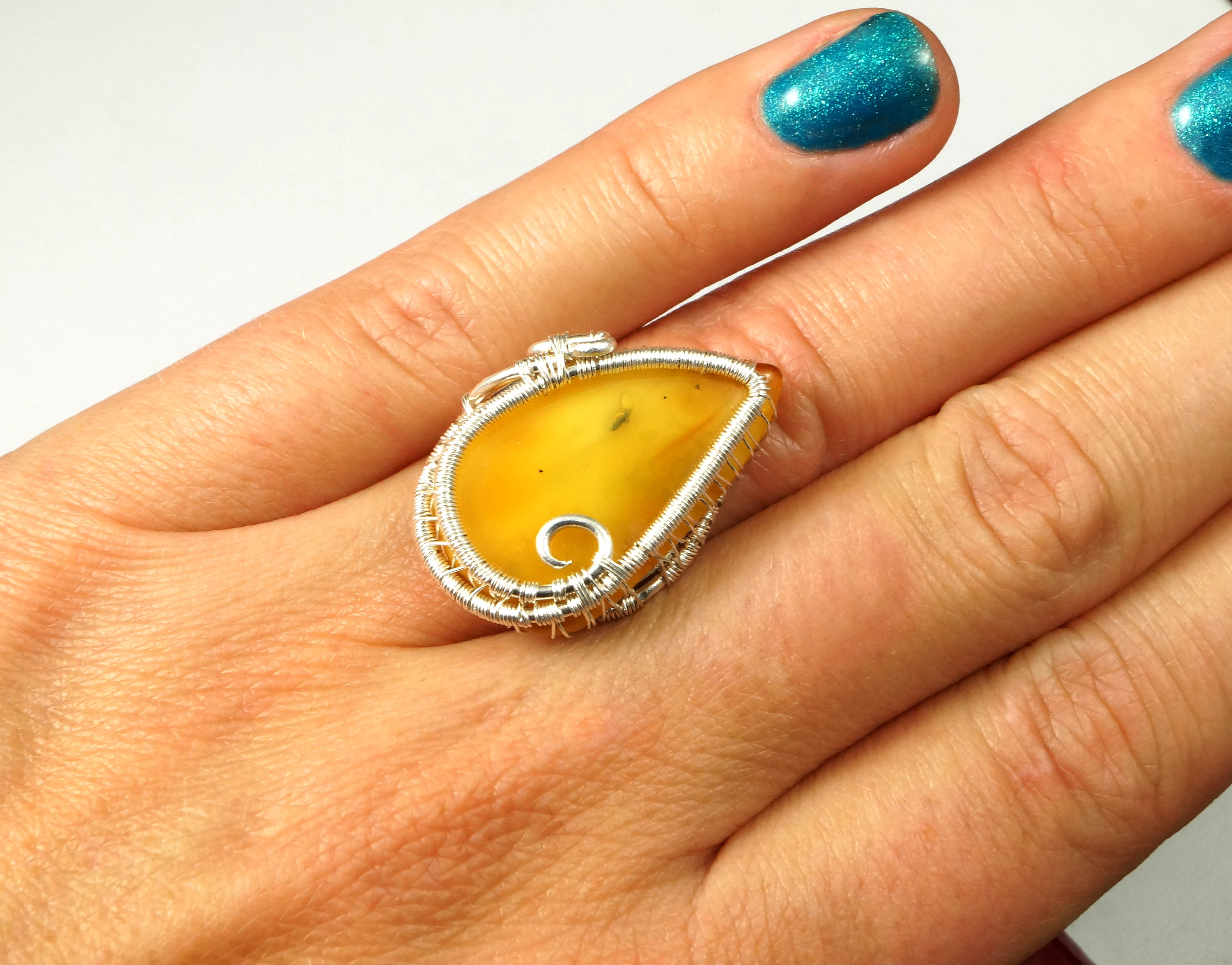 Pierścionek wykonany w bardzo pracochłonnej technice wire-wrapping. . Średnica obrączki wewnętrzna (regulowana): 16 mm - 17.3 mm