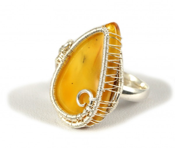 Misternie wykonany pierścionek z kaboszonem bursztynu bałtyckiego.