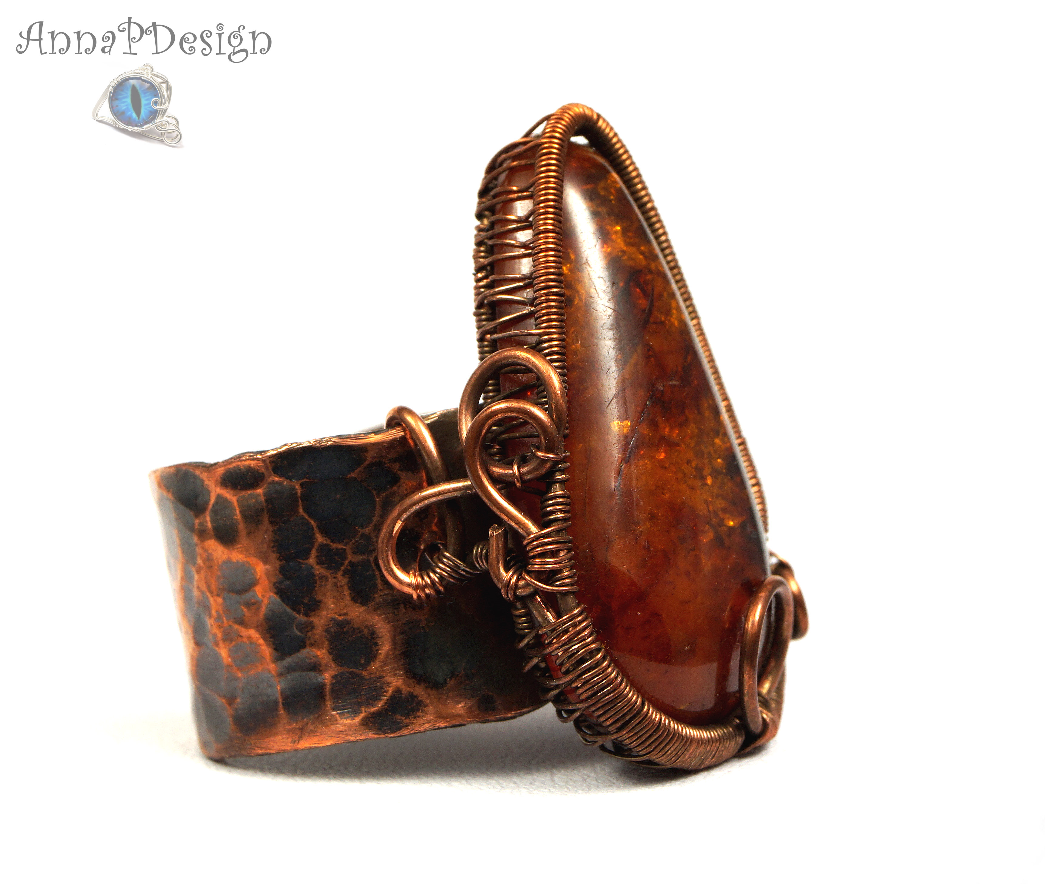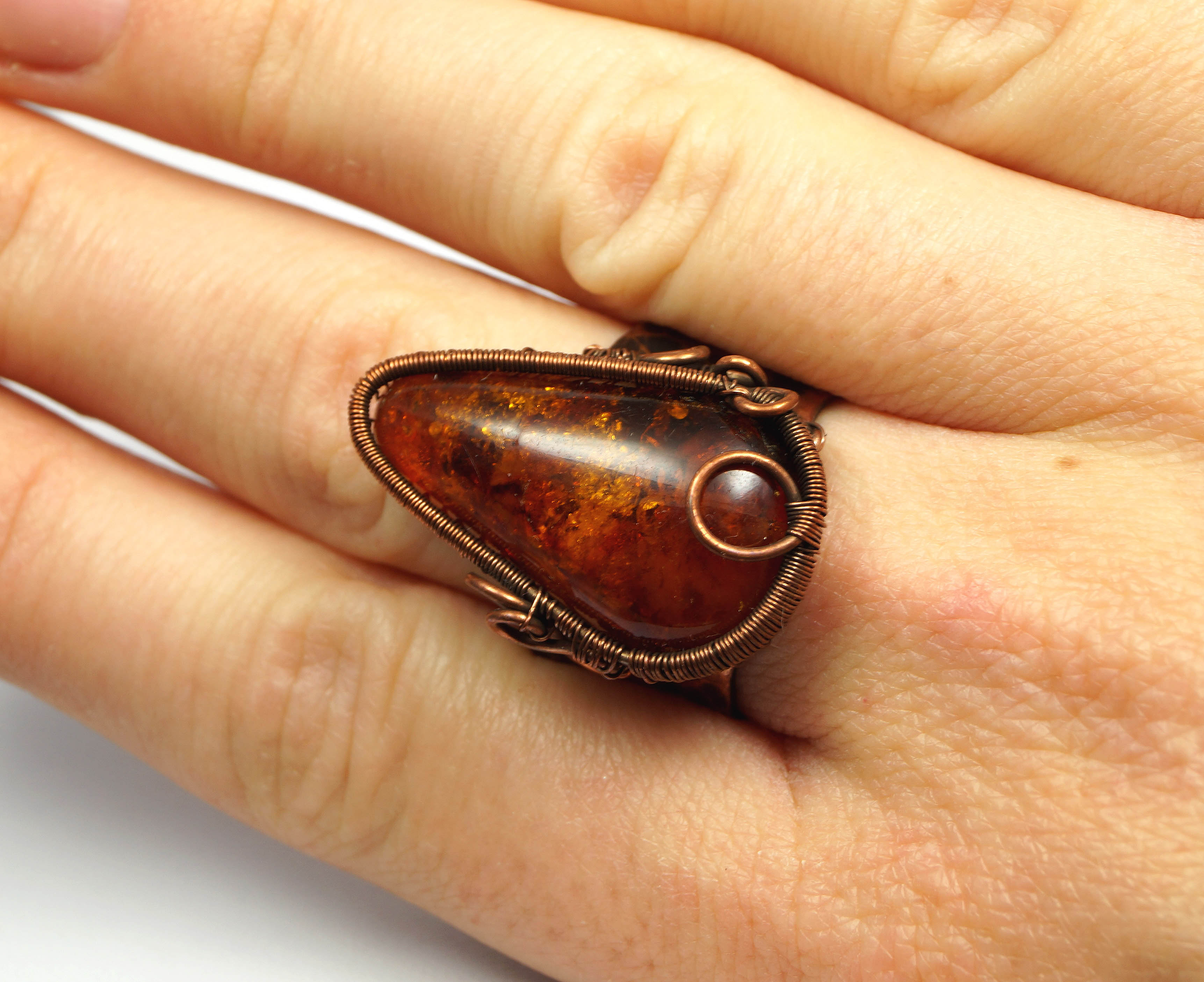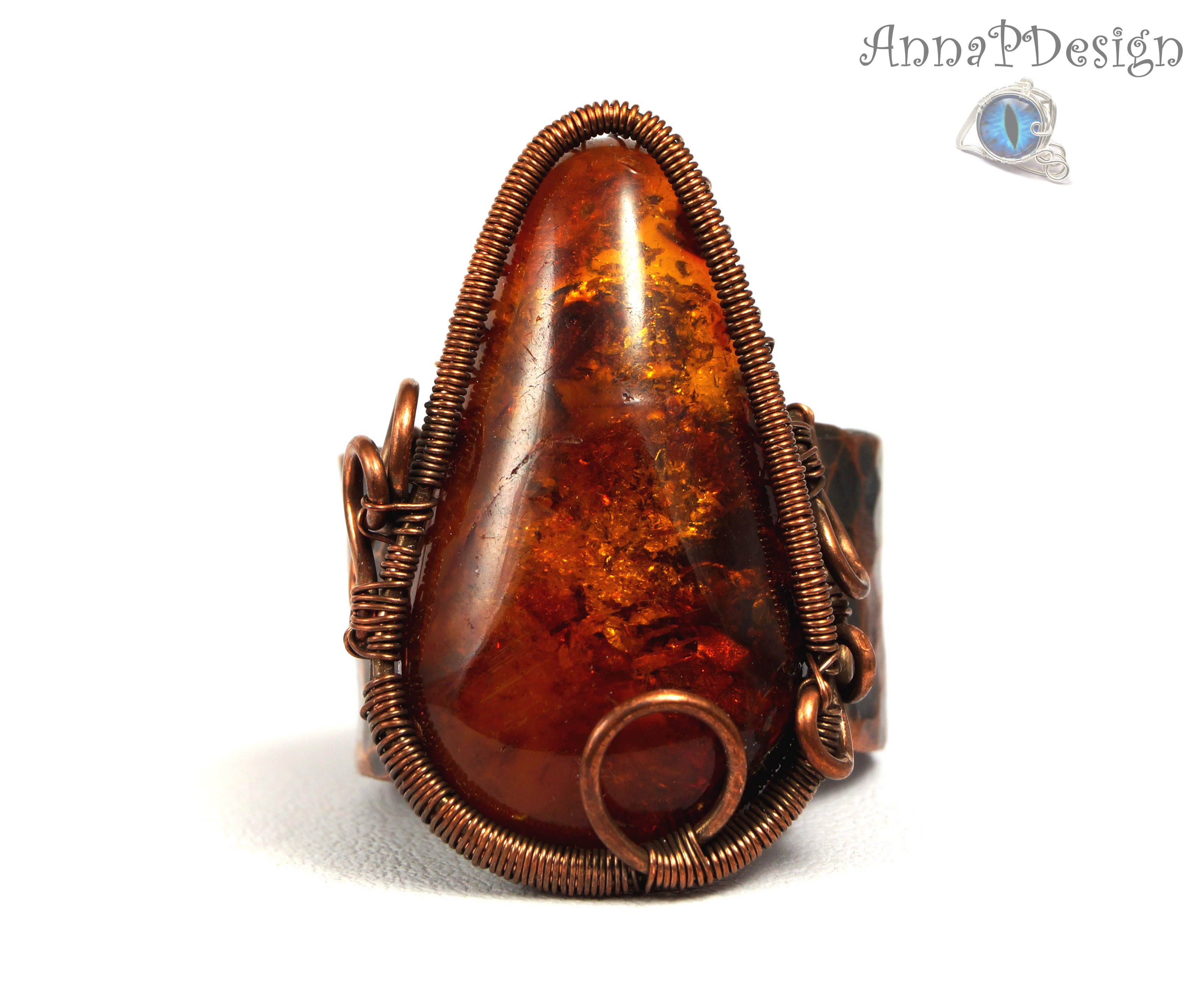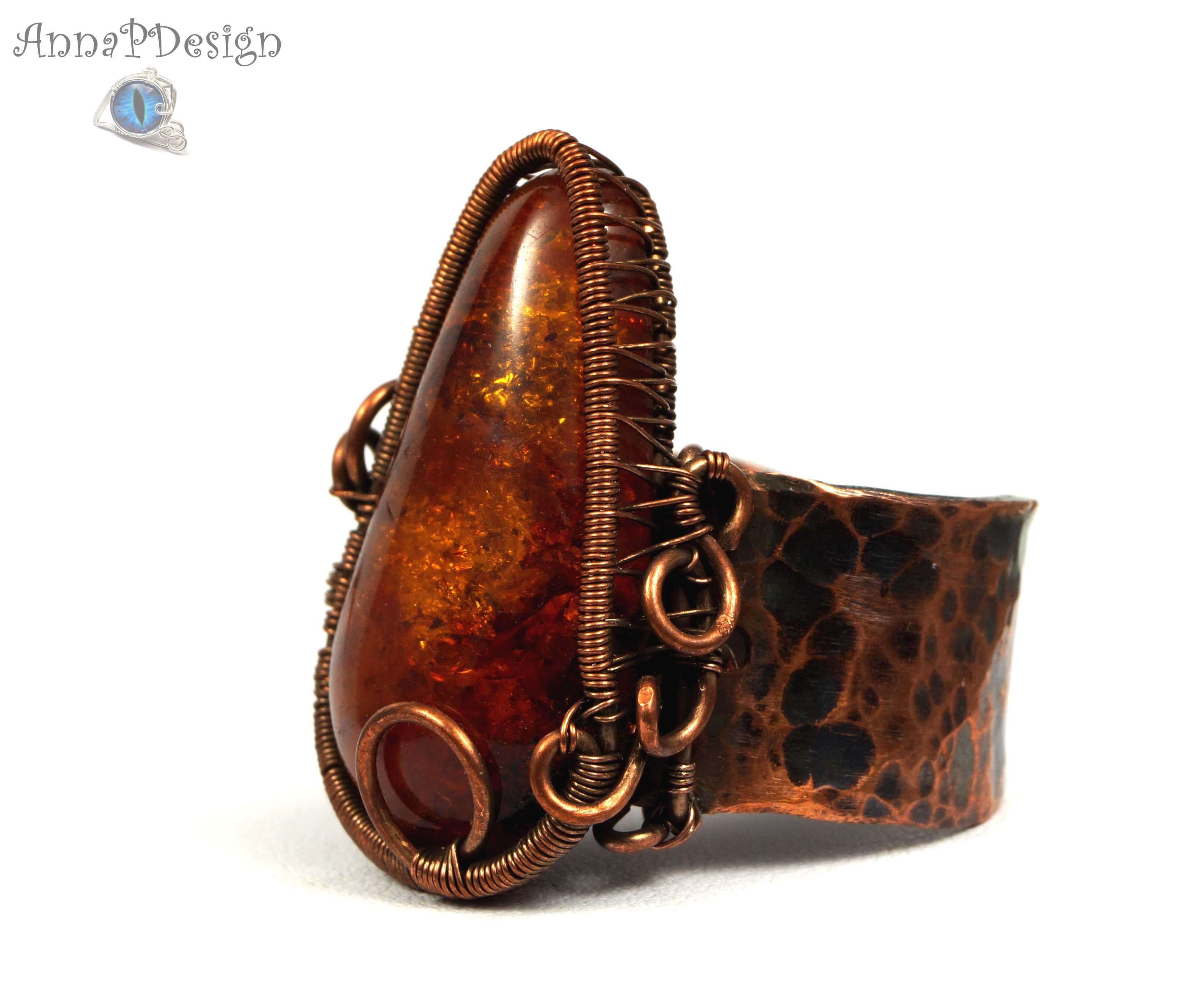 Misternie wykonany pierścionek z bałtyckim bursztynem. Obrączka wykonana z młotkowanej miedzi i z kaboszonem bursztynu osadzonego w technice wire wrapping.