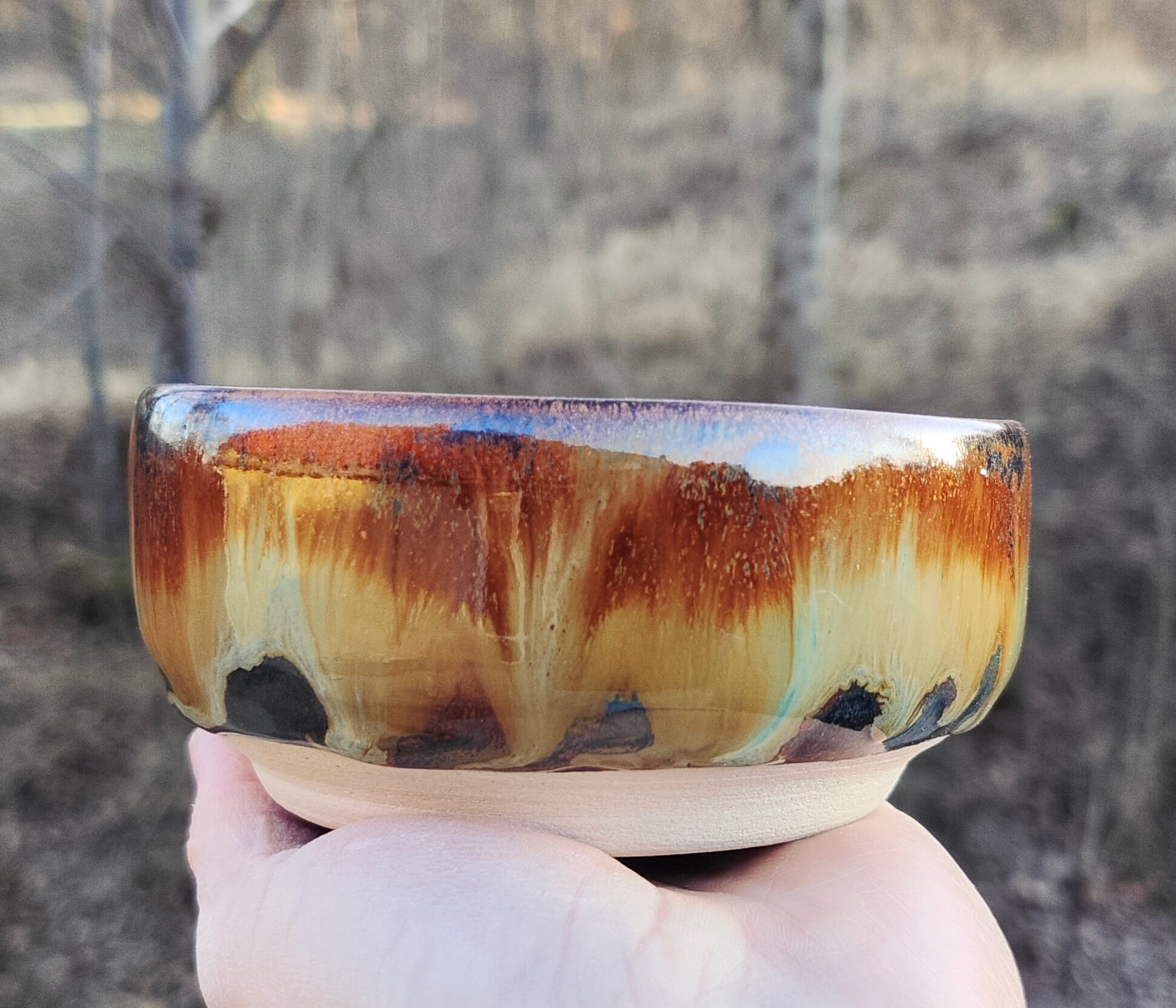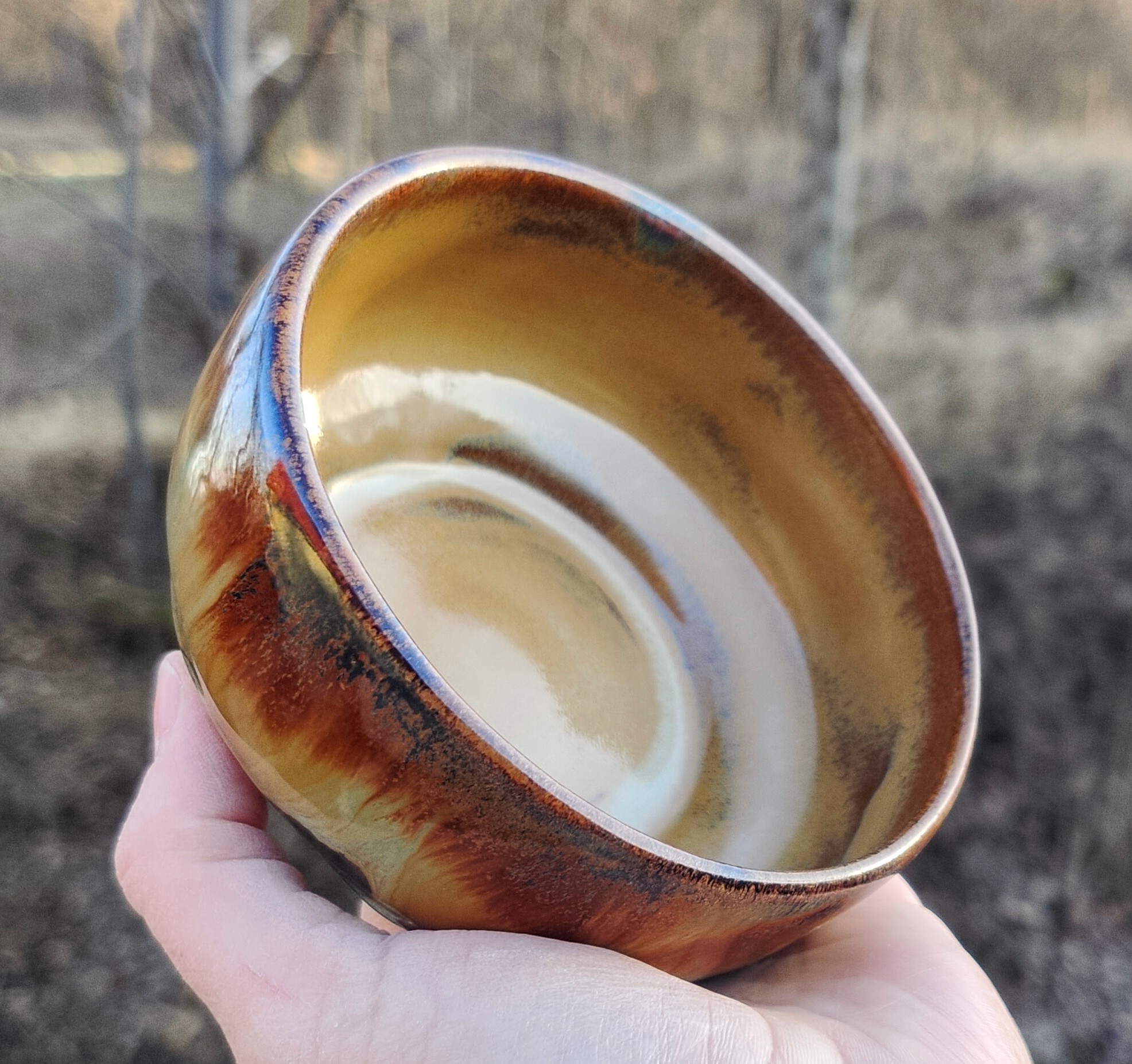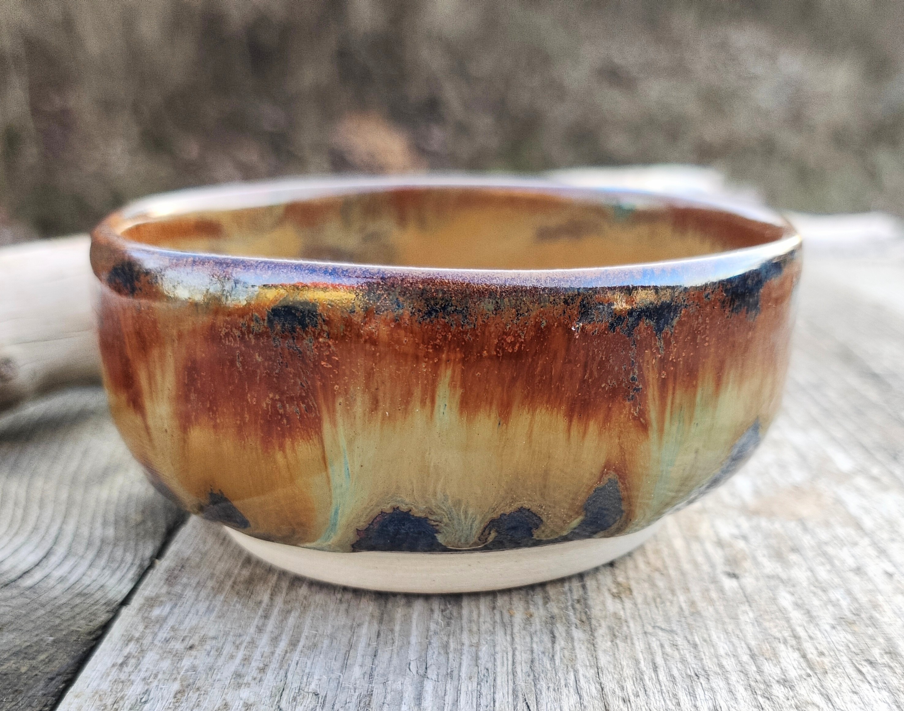 Ceramiczna miseczka wykonana z jasnej gliny. Toczona na kole garncarskim. Wypalana w piecu do ceramiki w temperaturze ponad 1220 stopni na kamionkę. Szkliwa spożywcze w odcieniach brązu i beżu. Piękne efekty kolorystycznego połączenia szkliw. Ceramika użytkowa, idealna na dipy i serwowania małych przekąsek.
