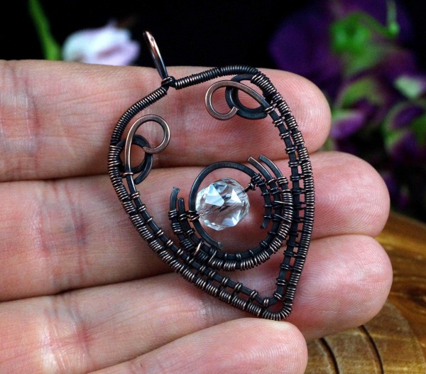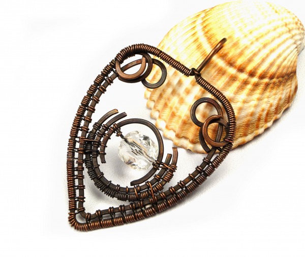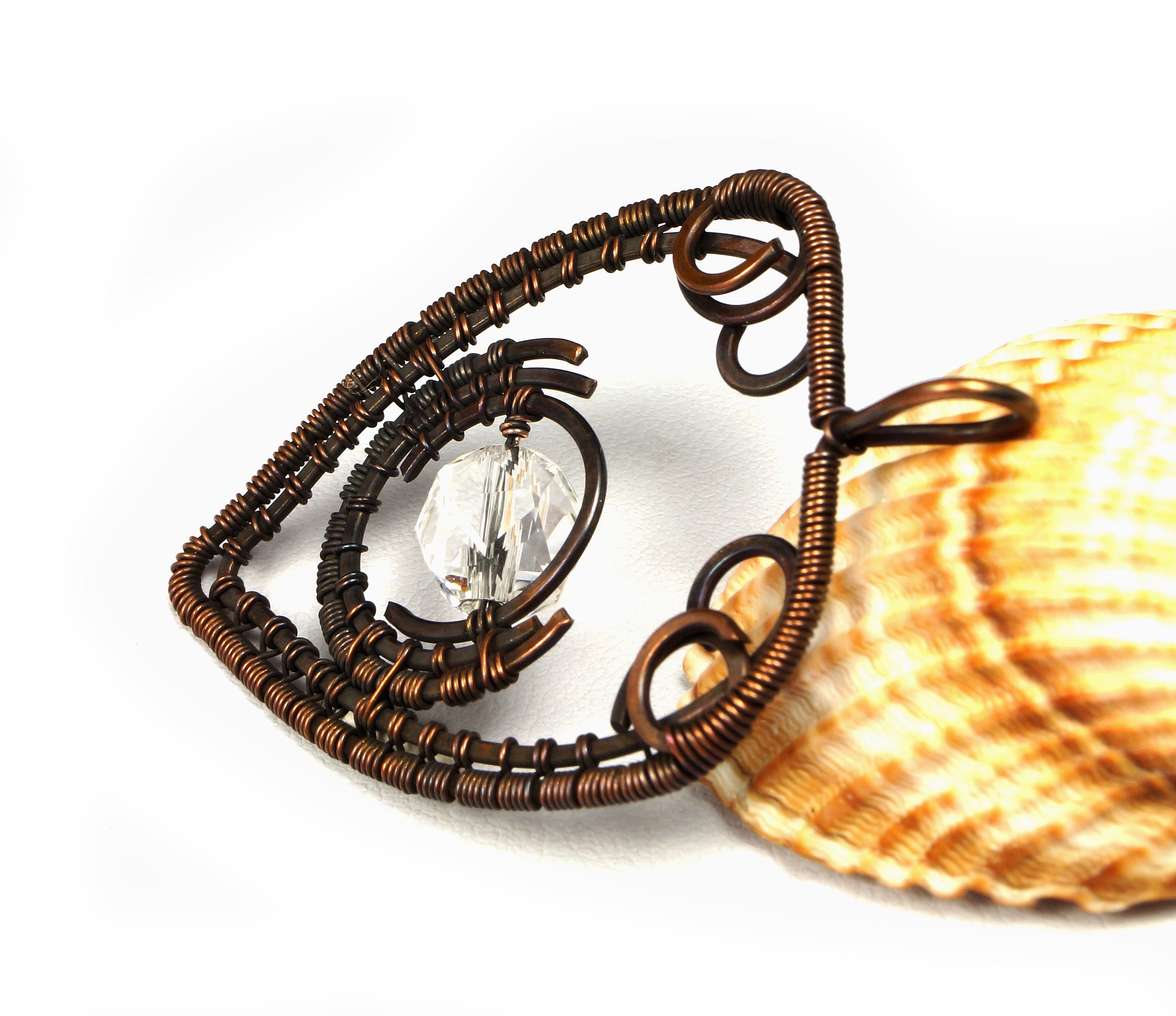 W stylu Boho, misternie pleciony wisior z kuleczką cyrkonii. Wisior zaprojektowany i wykonany przeze mnie od podstaw bardzo pracochłonną i precyzyjną techniką wire-wrapping z patynowanej miedzi.