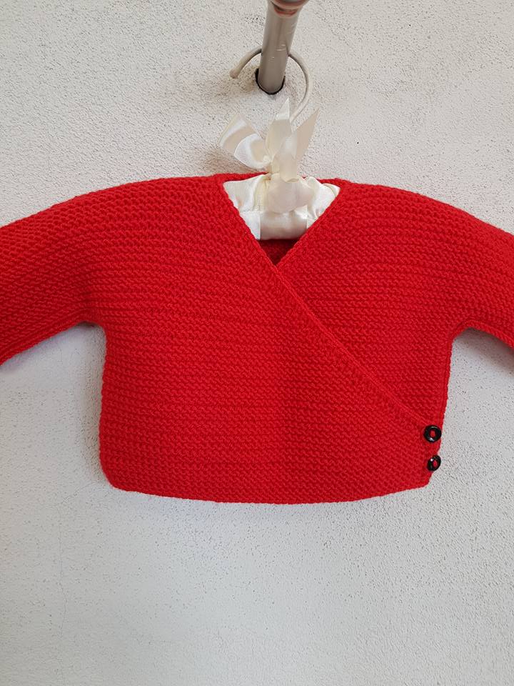 Słodki czerwony sweterek na wzór kaftanika, ręcznie robiony z wełenki przeznaczonej dla niemowląt. Wymiary: długość 18 cm,całkowita szerokość od rękawka lewego do końca prawego 43 cm. POLECAM!