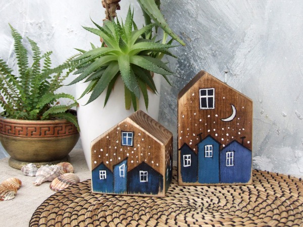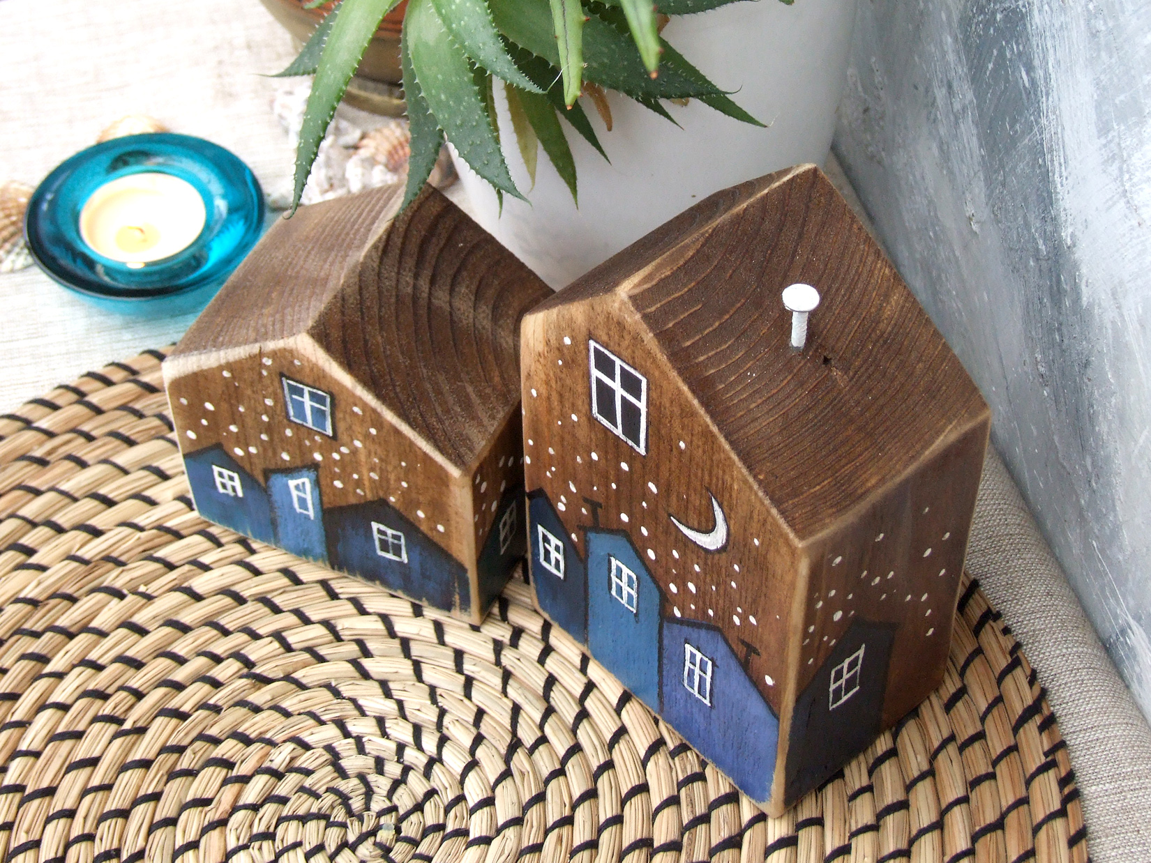 Drewniane domki dekoracyjne - domki można dowolnie aranżować, ustawiać w różnych miejscach - pięknie wyglądają na parapecie wśród kwiatów, można je postawić na stole, na komodzie albo na stoliku nocnym - możliwości jest wiele.