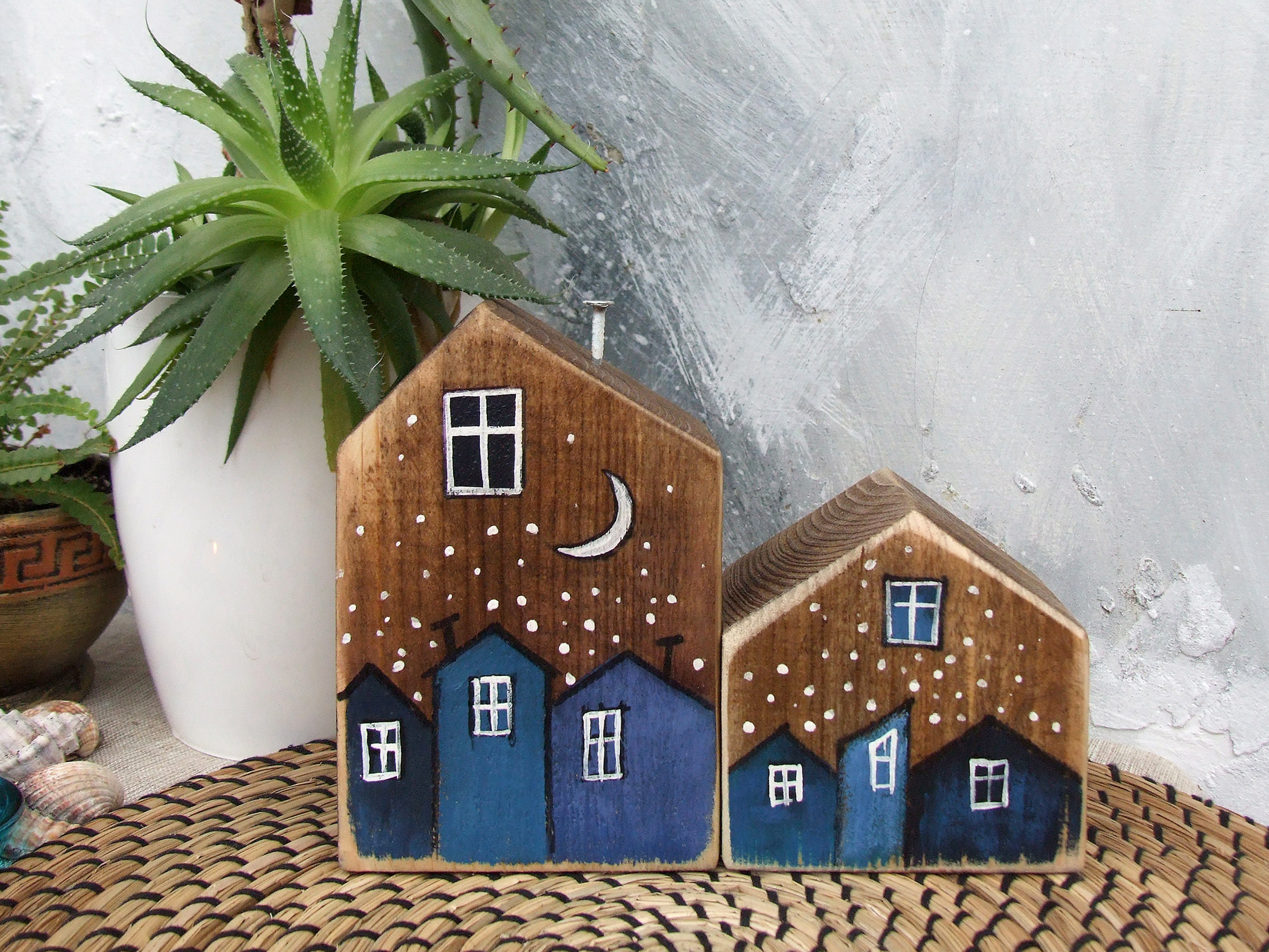 Domki dekoracyjne - 2 sztuki, odcienie niebieskiego i naturalne drewno