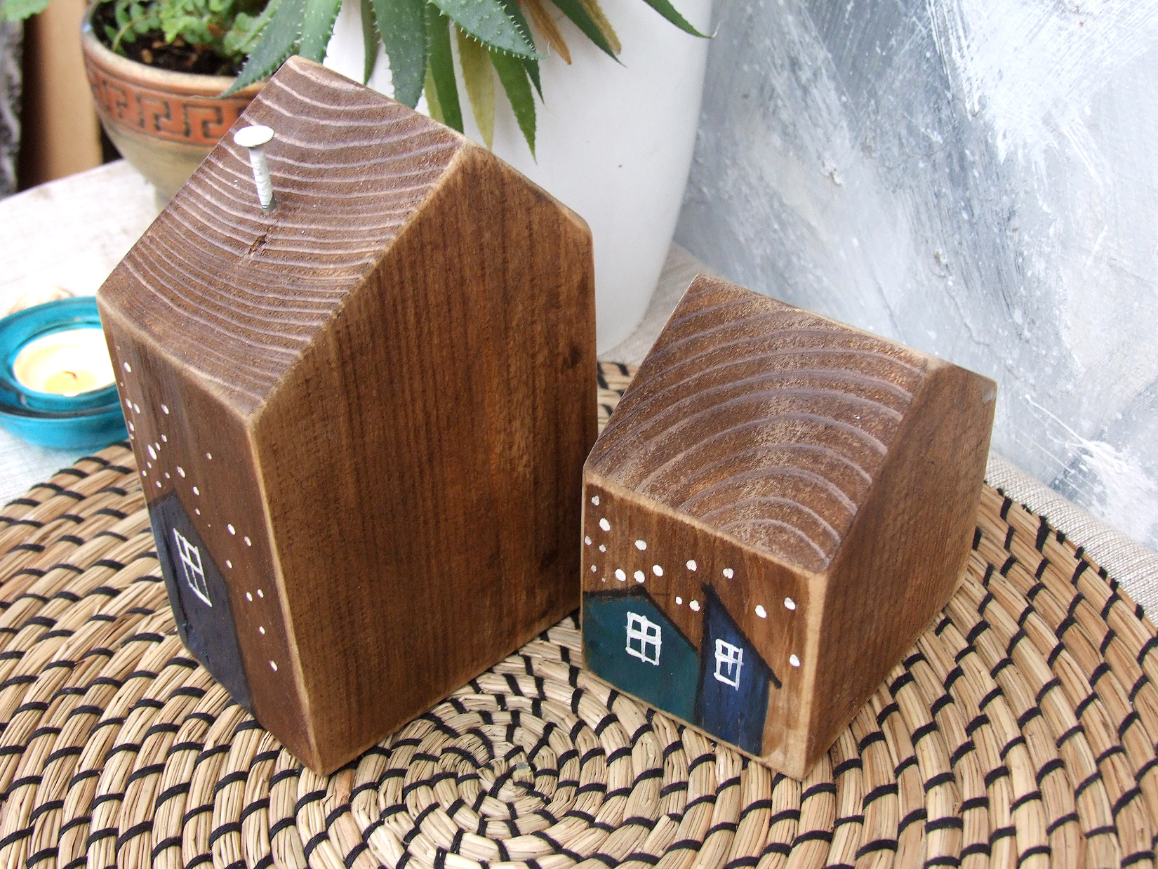 Wykonane z drewna sosnowego, malowane farbami akrylowymi i lakierem akrylowym, matowym. na daszku większego wbity gwóźdź imitujący komin.