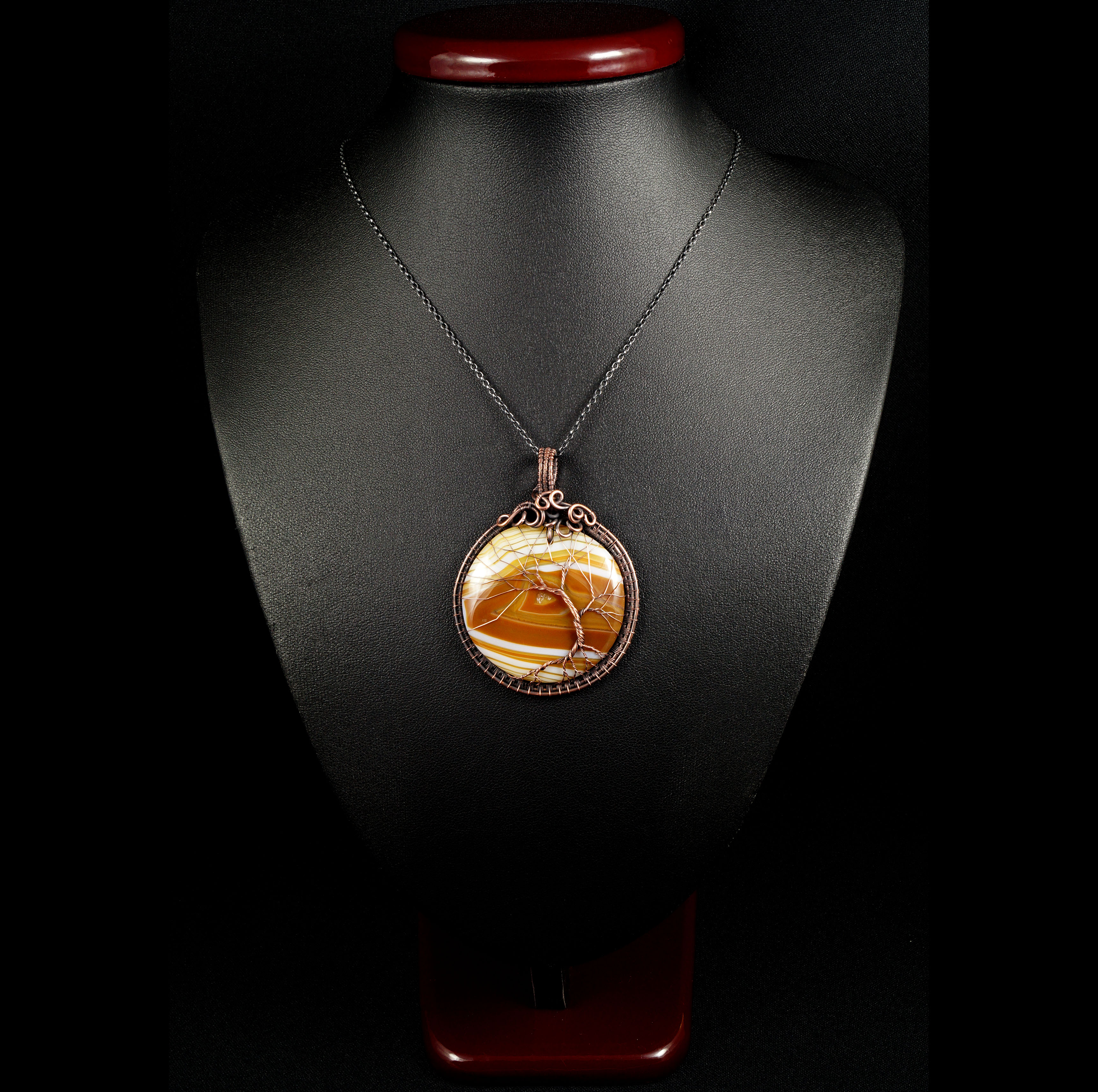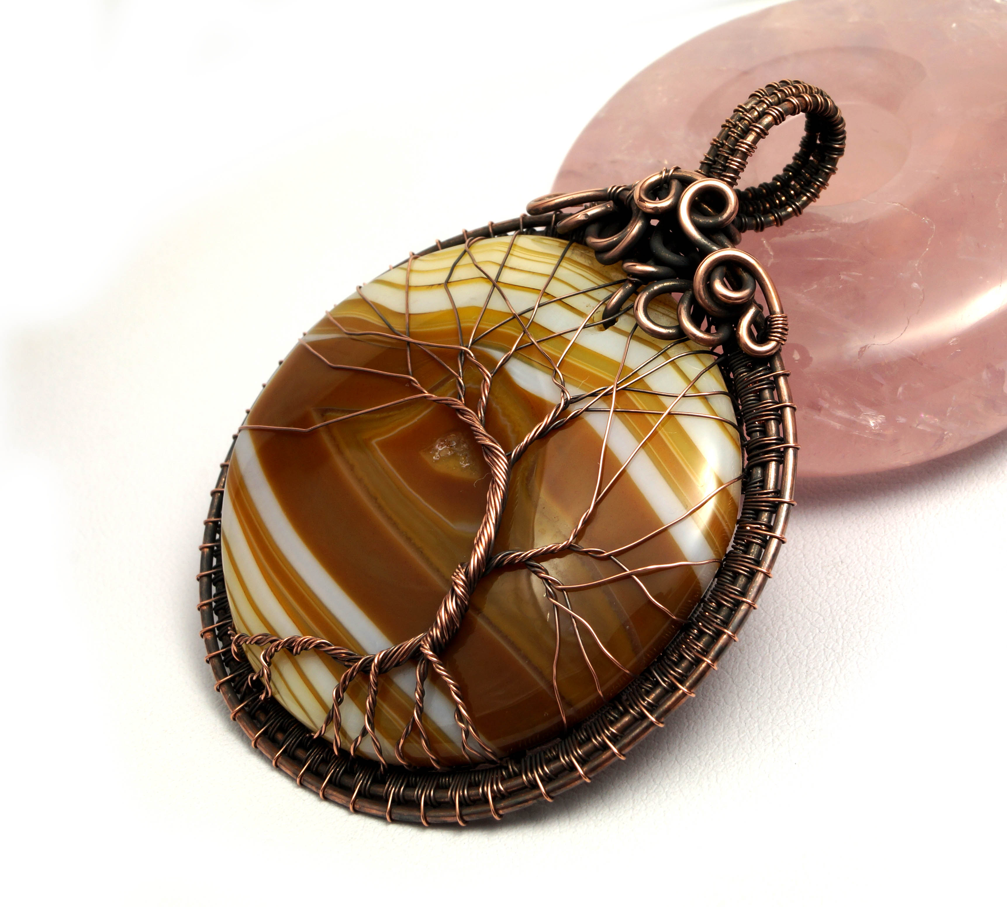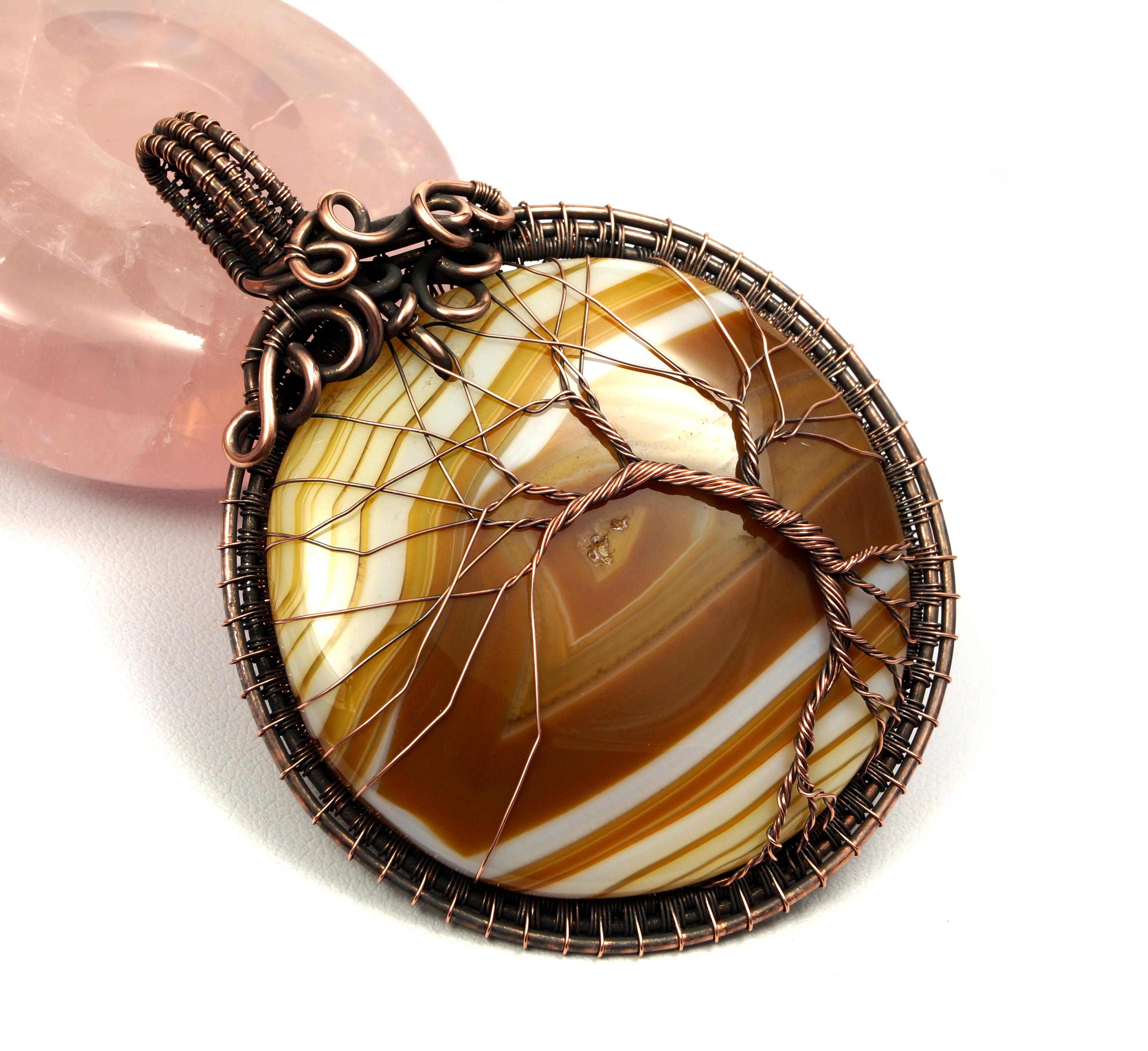 Bajeczny, misternie pleciony wisior z agatem biało brązowym, drzewko szczęścia. Wisior zaprojektowany i wykonany przeze mnie od podstaw bardzo pracochłonną i precyzyjną techniką wire-wrapping z patynowanej miedzi (czernionej). Dzięki procesowi czernienia wszystkie detale są uwypuklone.