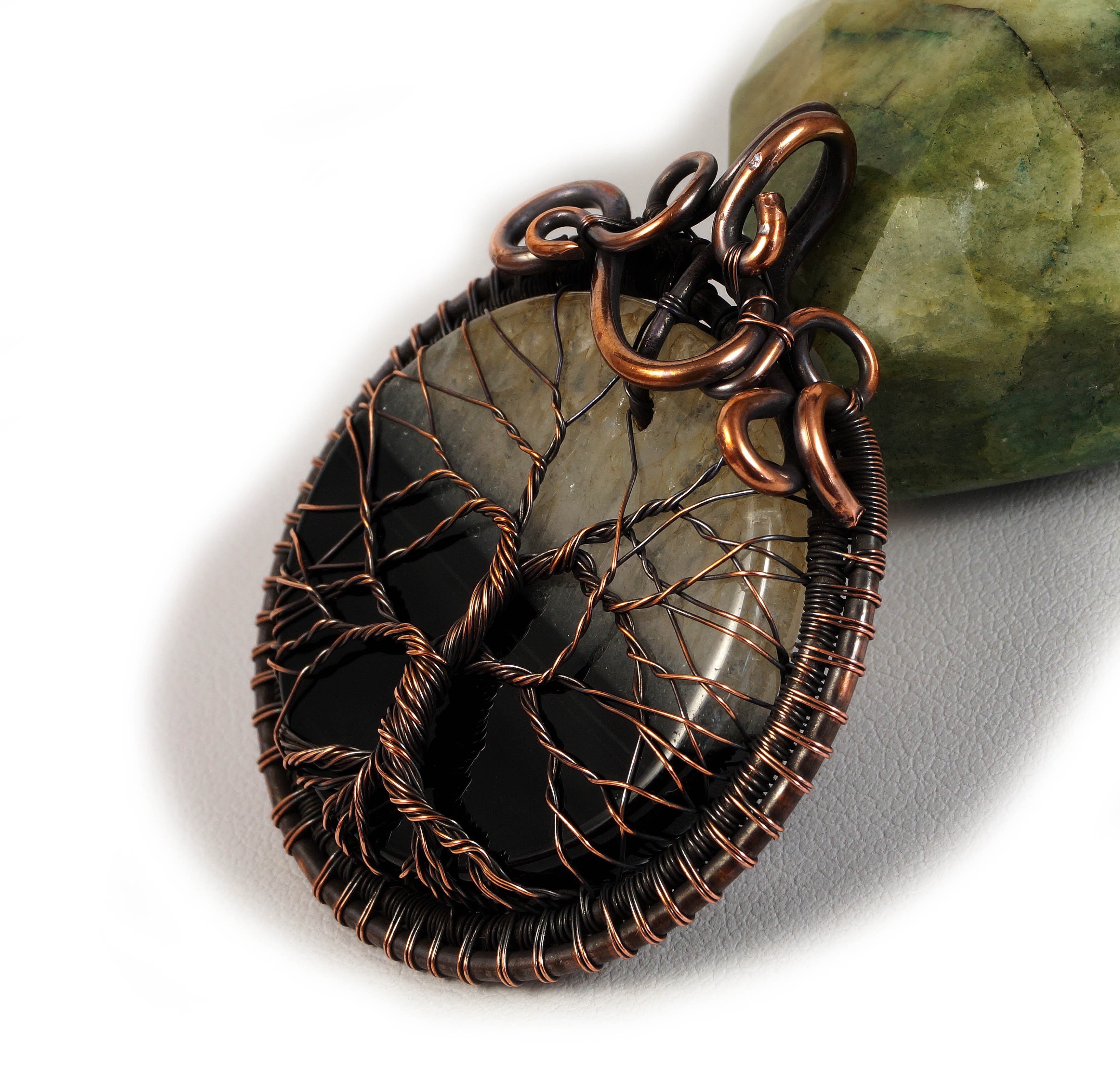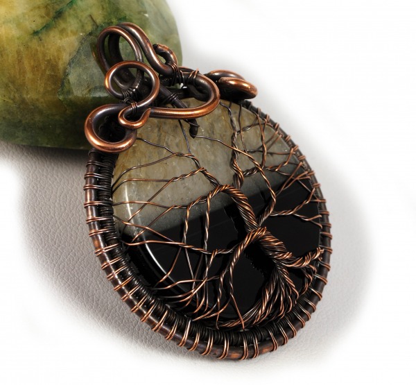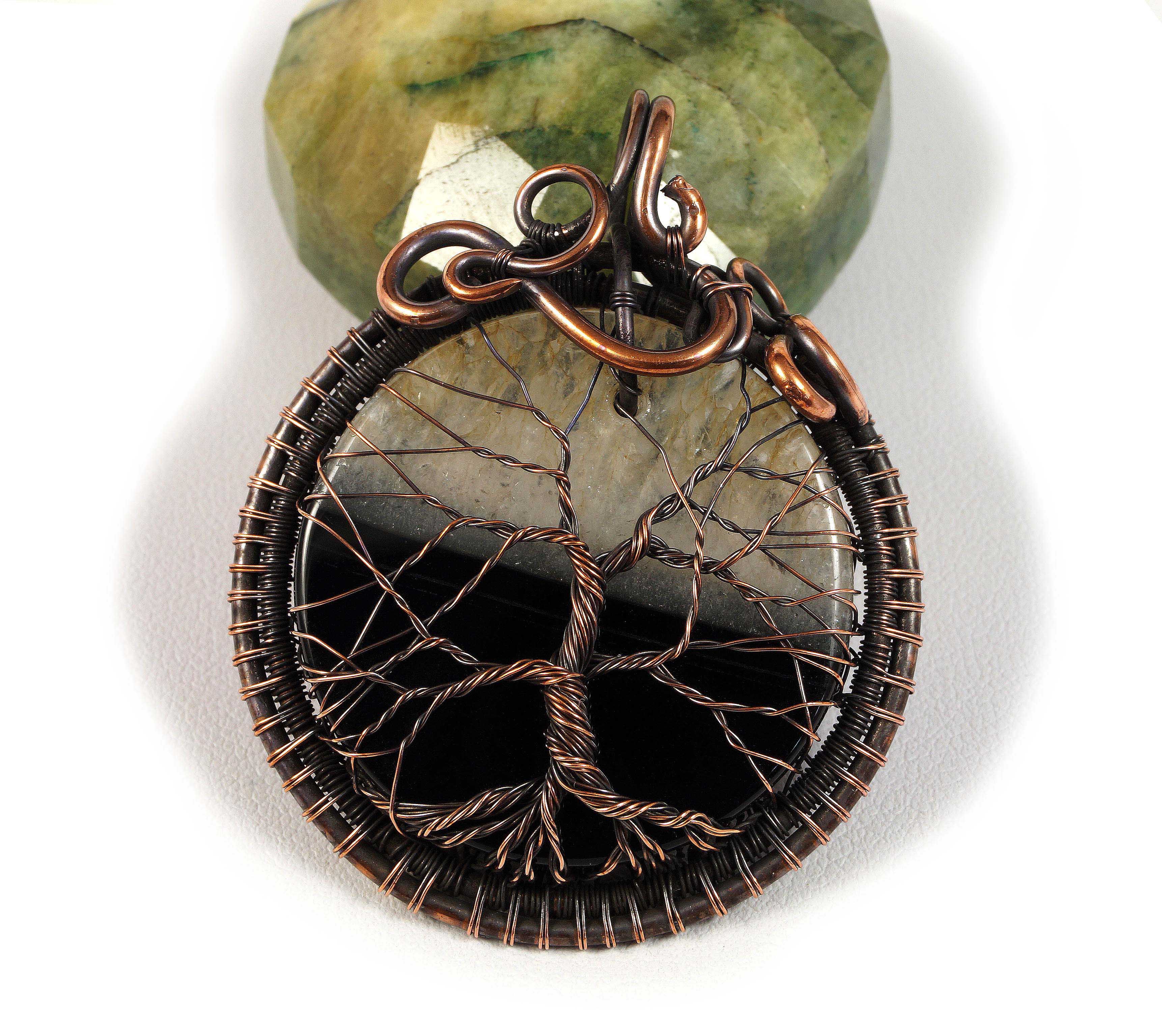 Bajeczny, misternie pleciony wisior z czarno białym plastrem agatu, drzewko szczęścia. Wisior zaprojektowany i wykonany przeze mnie od podstaw bardzo pracochłonną i precyzyjną techniką wire-wrapping z patynowanej miedzi.