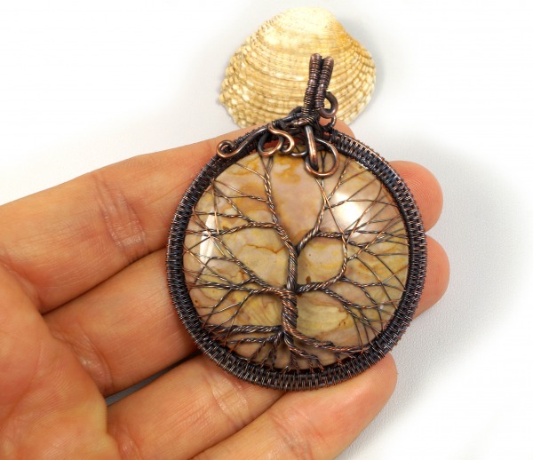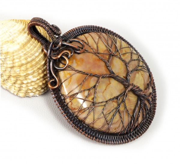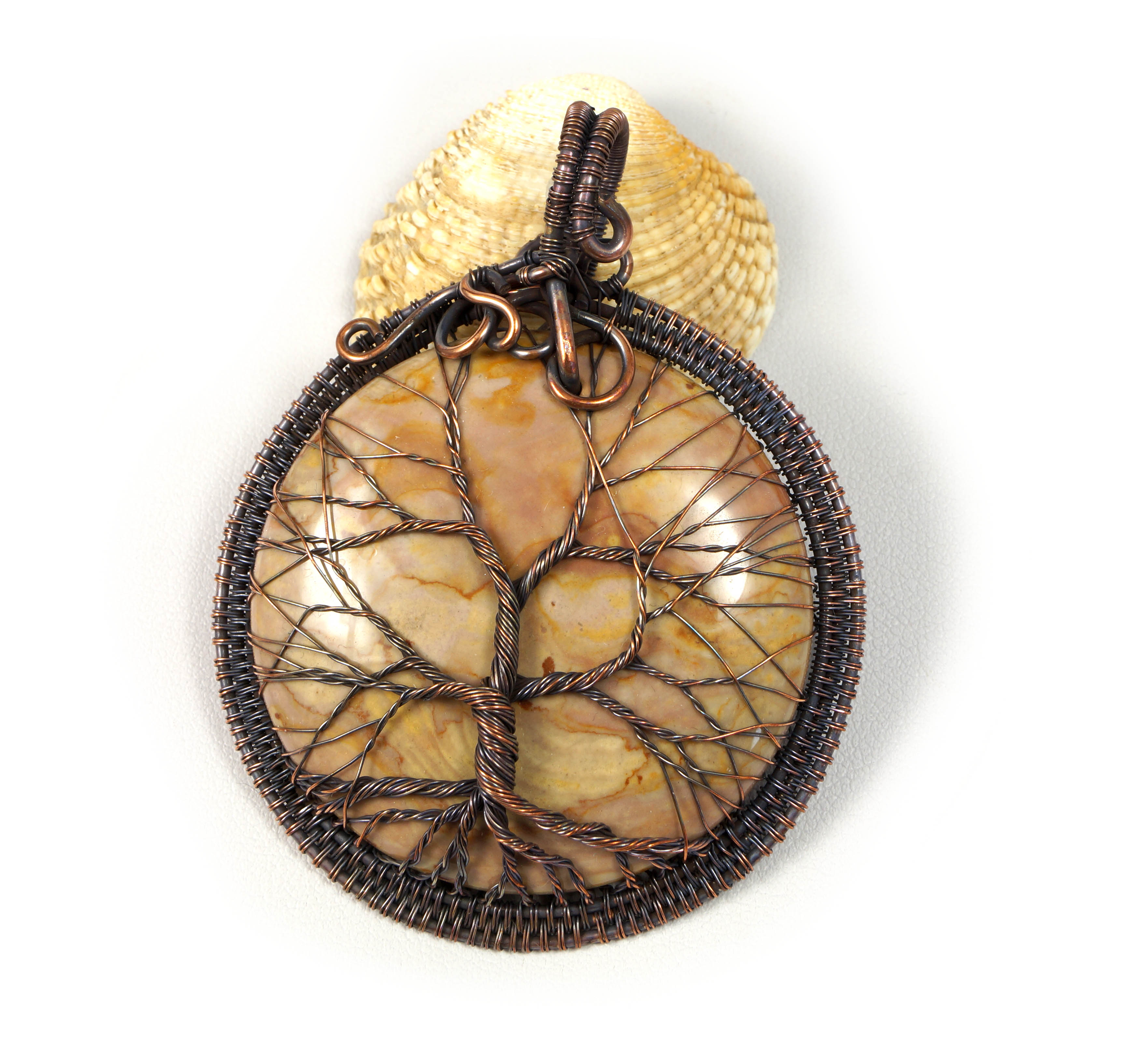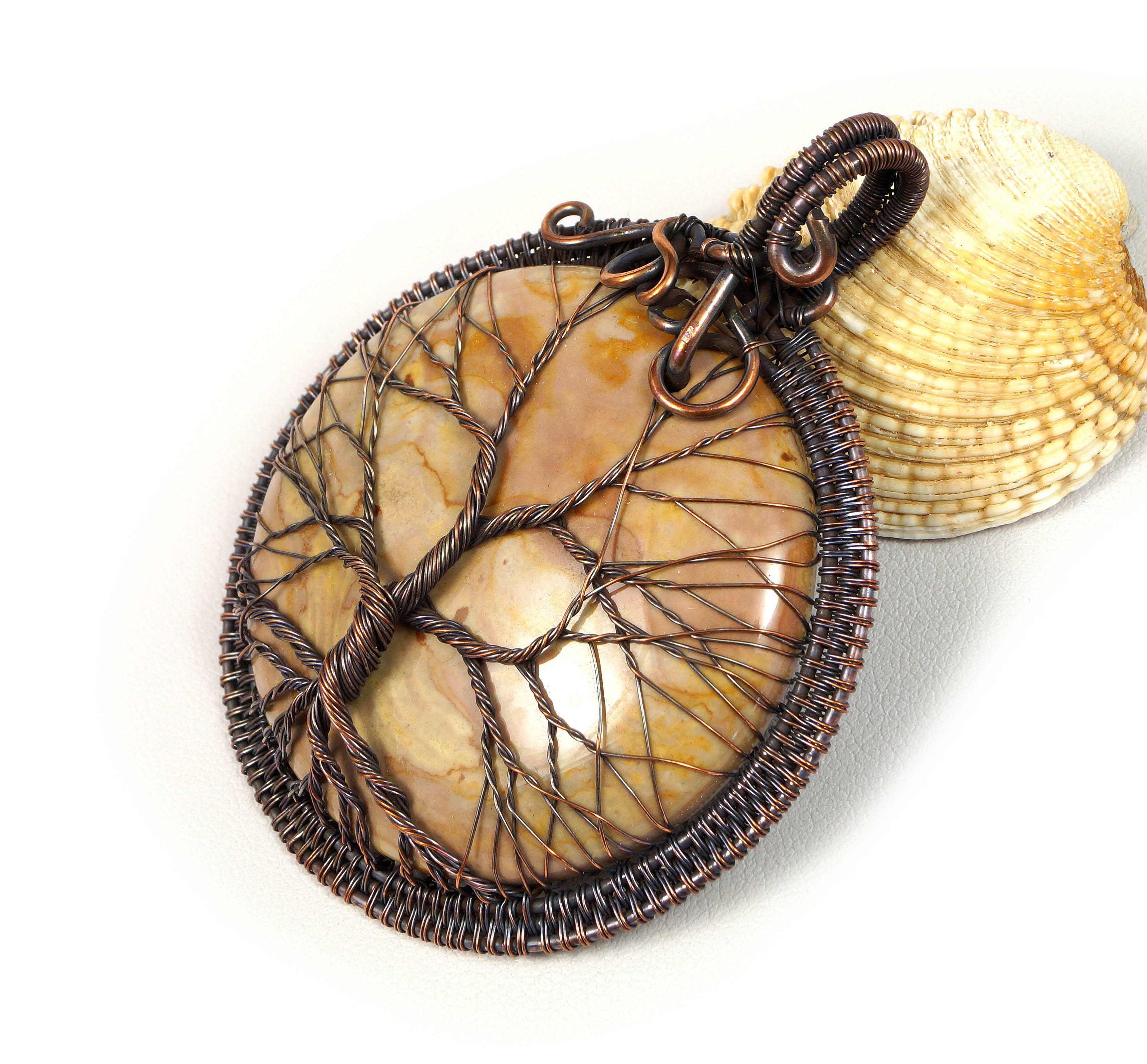 Unikatowy, misternie pleciony wisior z jaspisem biało brązowym, drzewko szczęścia. Wisior zaprojektowany i wykonany przeze mnie od podstaw bardzo pracochłonną i precyzyjną techniką wire-wrapping z patynowanej miedzi (czernionej). Dzięki procesowi czernienia wszystkie detale są uwypuklone.