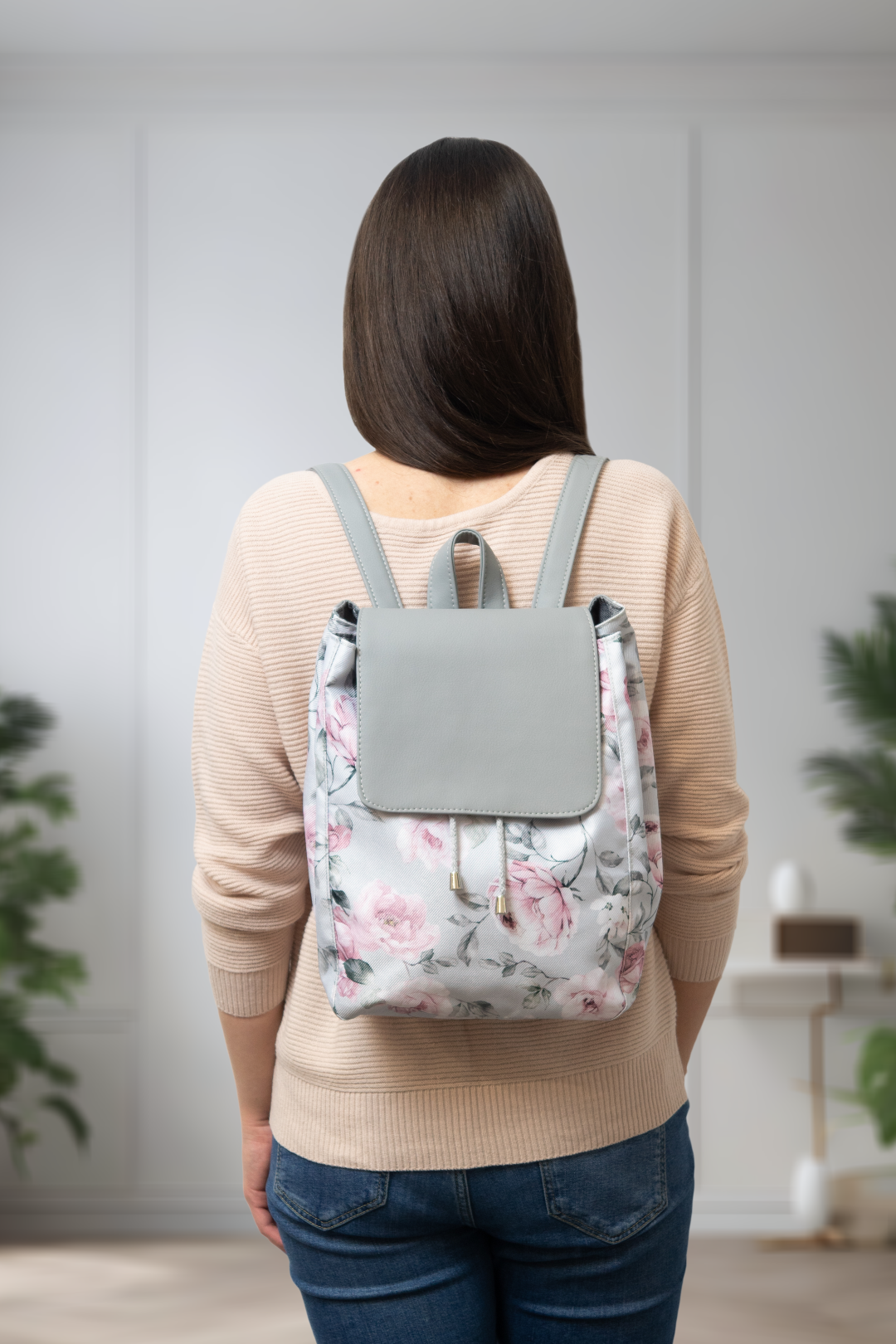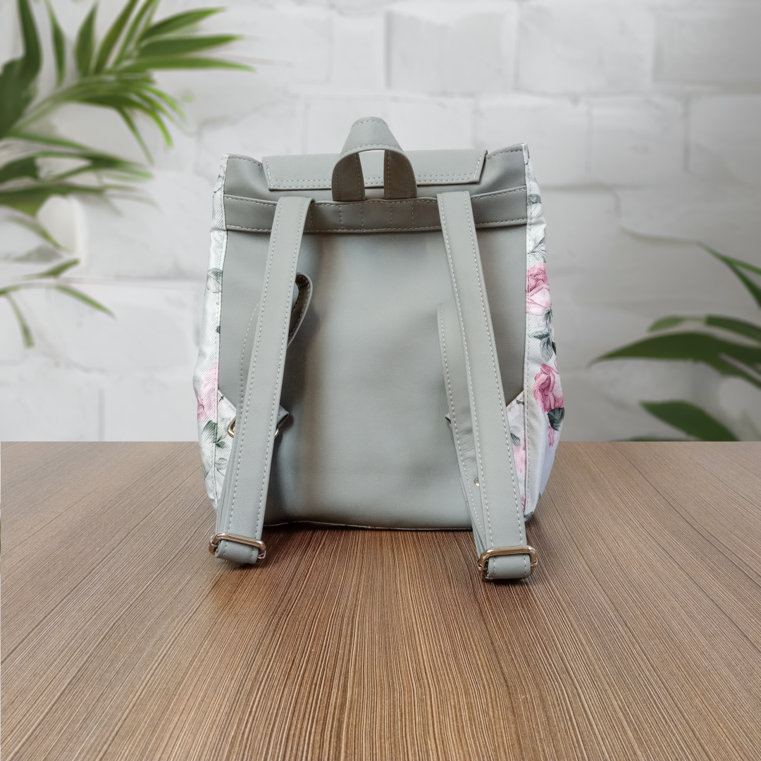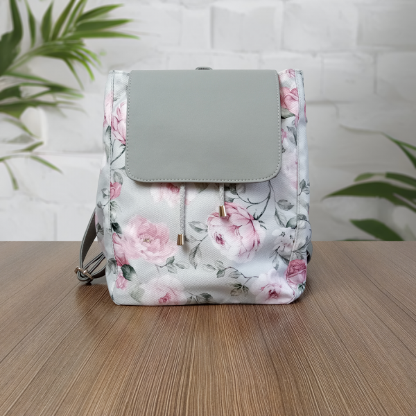 Duży szary plecak w różowe kwiaty, z klapką