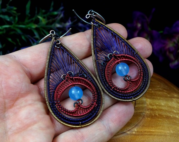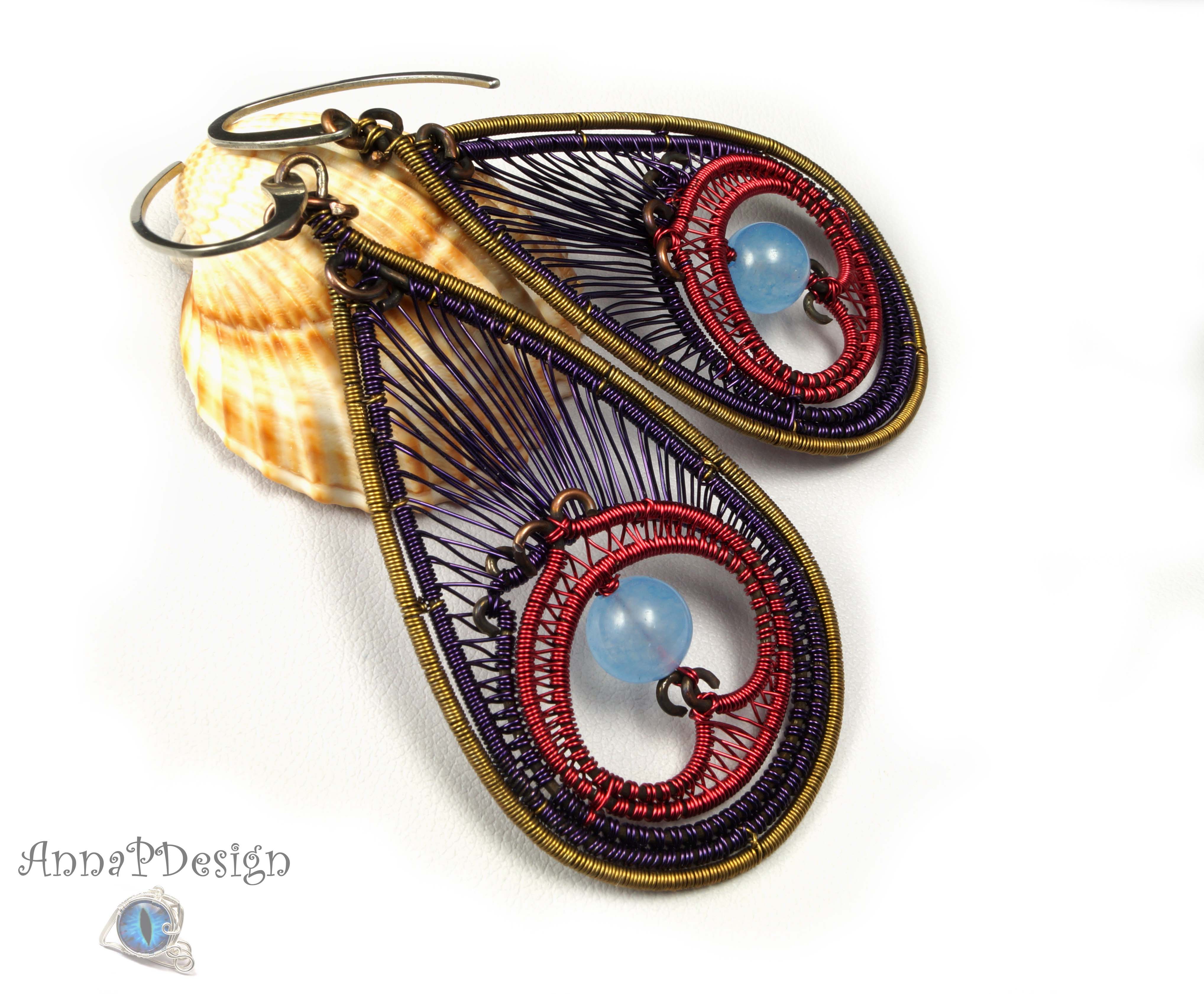 Emaliowane kolczyki z agatem niebieskim pawie oczko, ręcznie wykonane na prezent dla niej