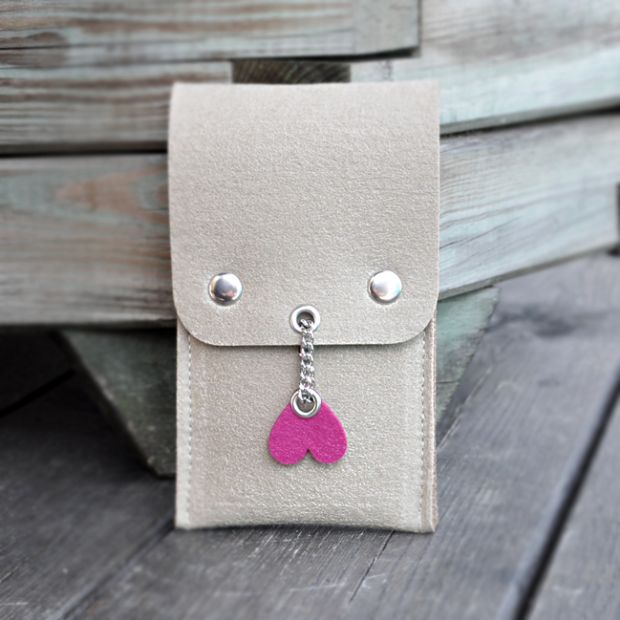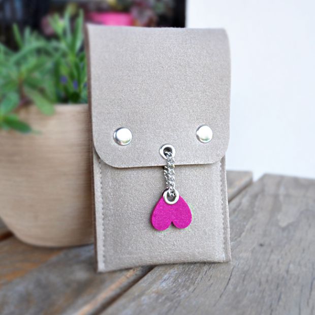 Stylowe etui na długopisy potrafi być nie tylko bardzo przydatnym gadżetem w biurze, lecz również stanowić ozdobę naszego miejsca pracy. Model oferowany przez nas, wykonany został z filcu w kolorze beżu. Z łatwością pomieści wszystkie potrzebne akcesoria do pisania. Posiada klapkę zapinaną na dwa napy. Elementem ozdobnym jest tutaj zawieszka w kształcie serduszka. Na życzenie bardzo chętnie je jednak zmodyfikujemy. Wybrać można również kolor serca.