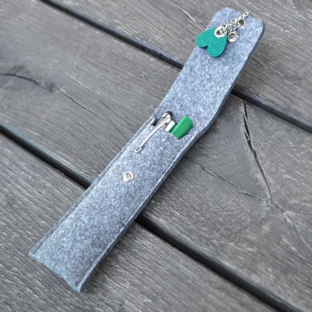 Stylowe etui na długopisy potrafi być nie tylko bardzo przydatnym gadżetem w biurze, lecz również stanowić ozdobę naszego miejsca pracy. Model oferowany przez nas, wykonany został z filcu w kolorze szarym. Pomieści dwa długopisy potrzebne do pisania. Posiada klapkę zapinaną na jeden nap. Elementem ozdobnym jest tutaj zawieszka w kształcie serduszka. Na życzenie bardzo chętnie je jednak zmodyfikujemy. Wybrać można również kolor serca.