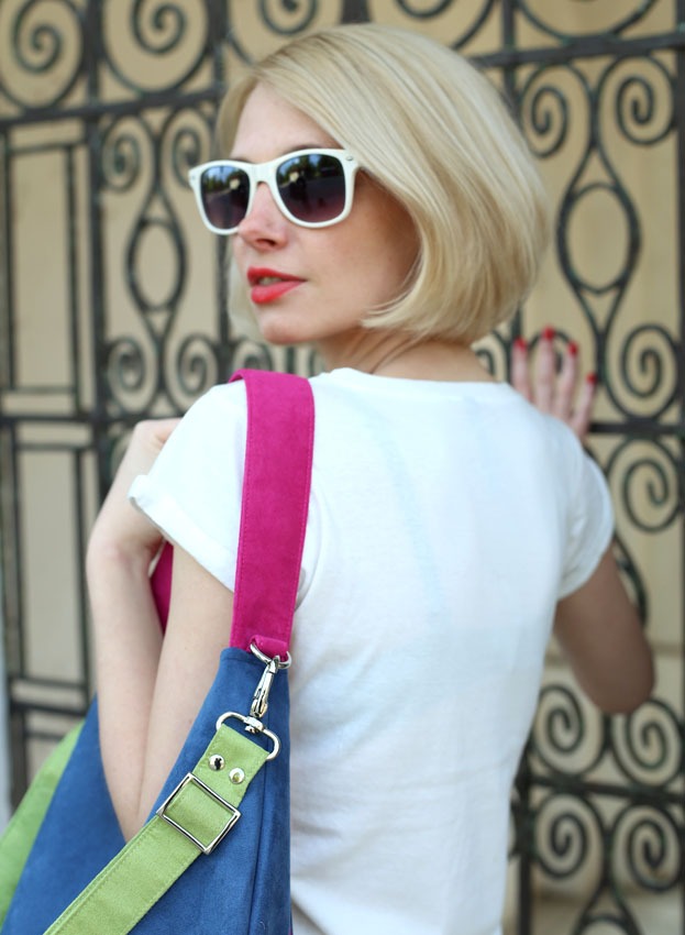 Rączka w kolorze fuksji i limonkowy regulowany pasek przykuwają uwagę i umożliwiają noszenie zamszowej torebki na ramieniu lub na skos jak listonoszkę. Torba worek na pewno sprawdzi się u zabieganych mam, które spokojnie zmieszczą w niej zarówno swoje drobiazgi, jak i rzeczy dla dziecka. Idealna jako torba zakupowa lub podróżna – torba jest bardzo pojemna, wykonana z wysokiej jakości mocnej tkaniny, która gwarantuje jej trwałość.