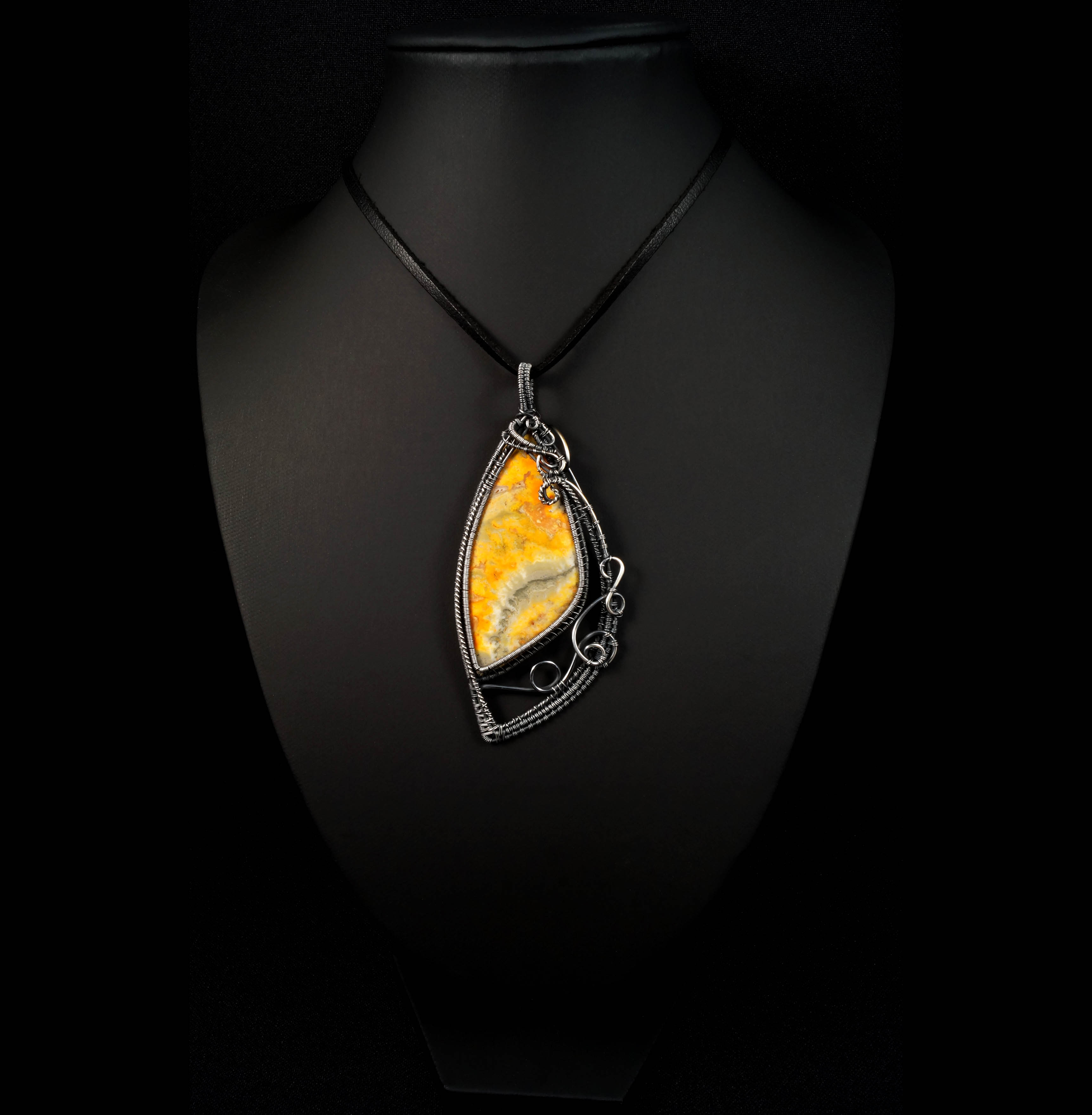 Unikatowy, misternie pleciony wisior z kaboszonem jaspisu bumbelbee w żółto szarym kolorze.