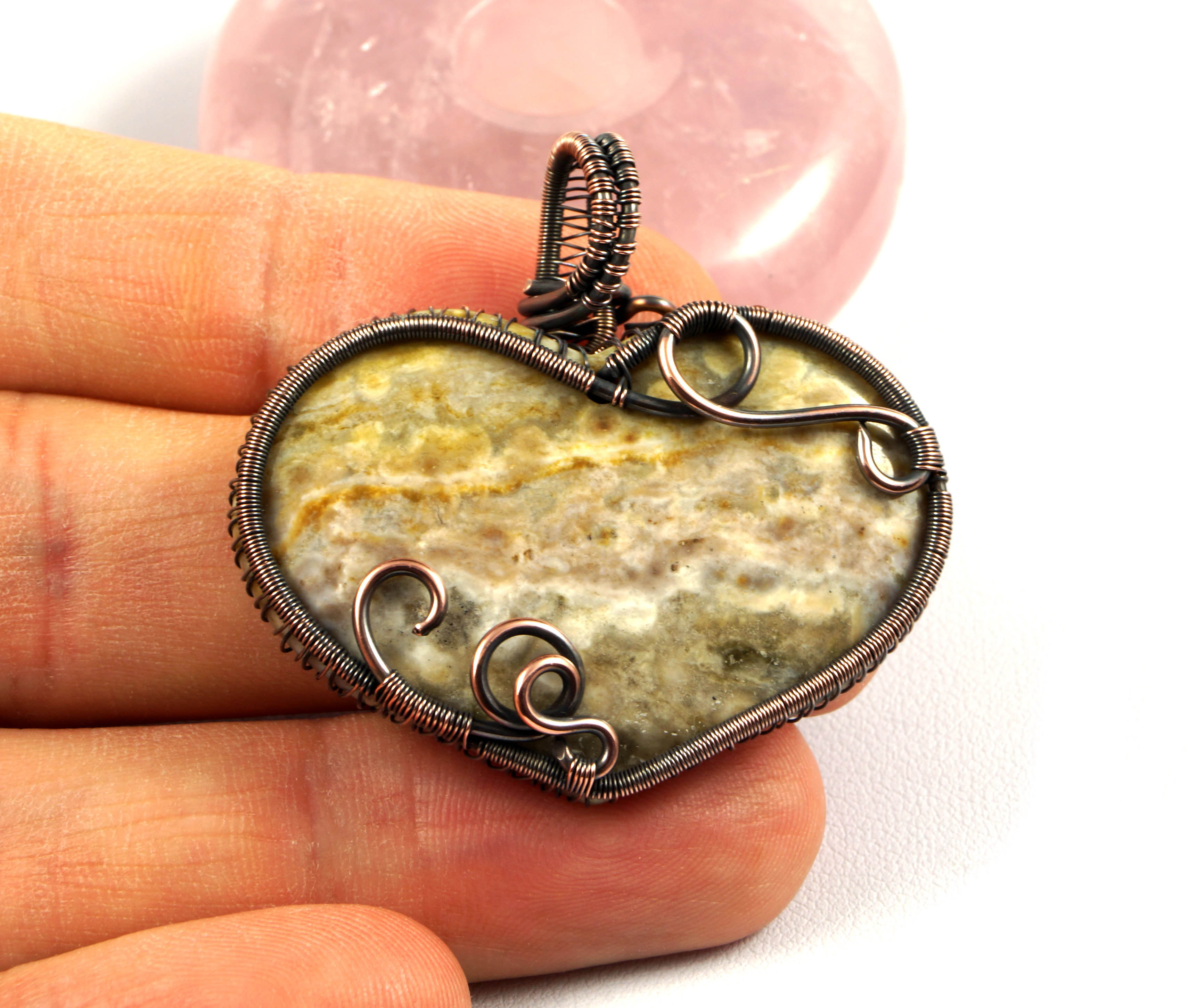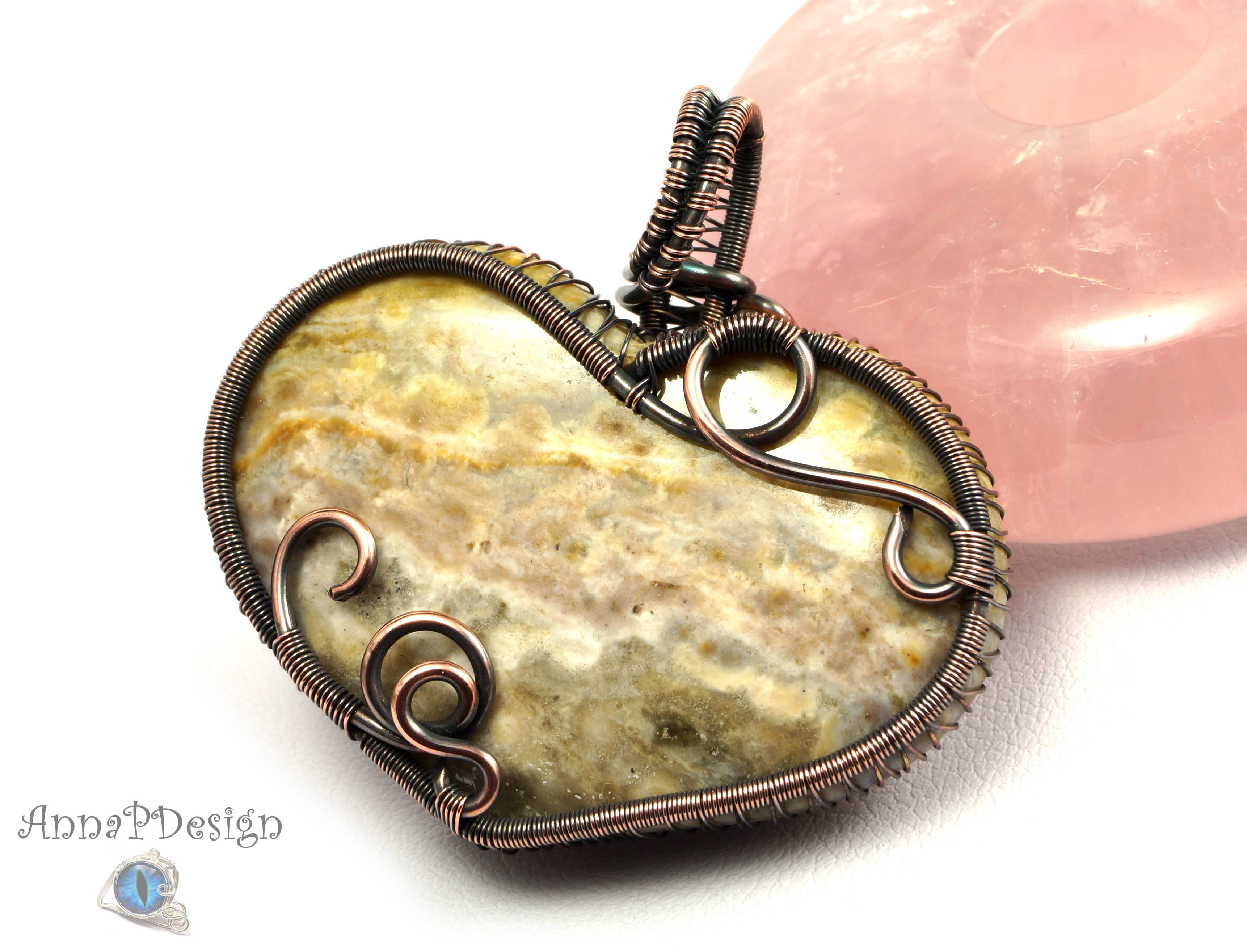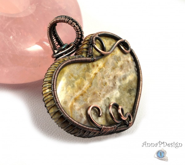 Jaspis, Wisior z miedzi z jaspisem brązowym serce, ręcznie wykonany na niepowtarzalny prezent
