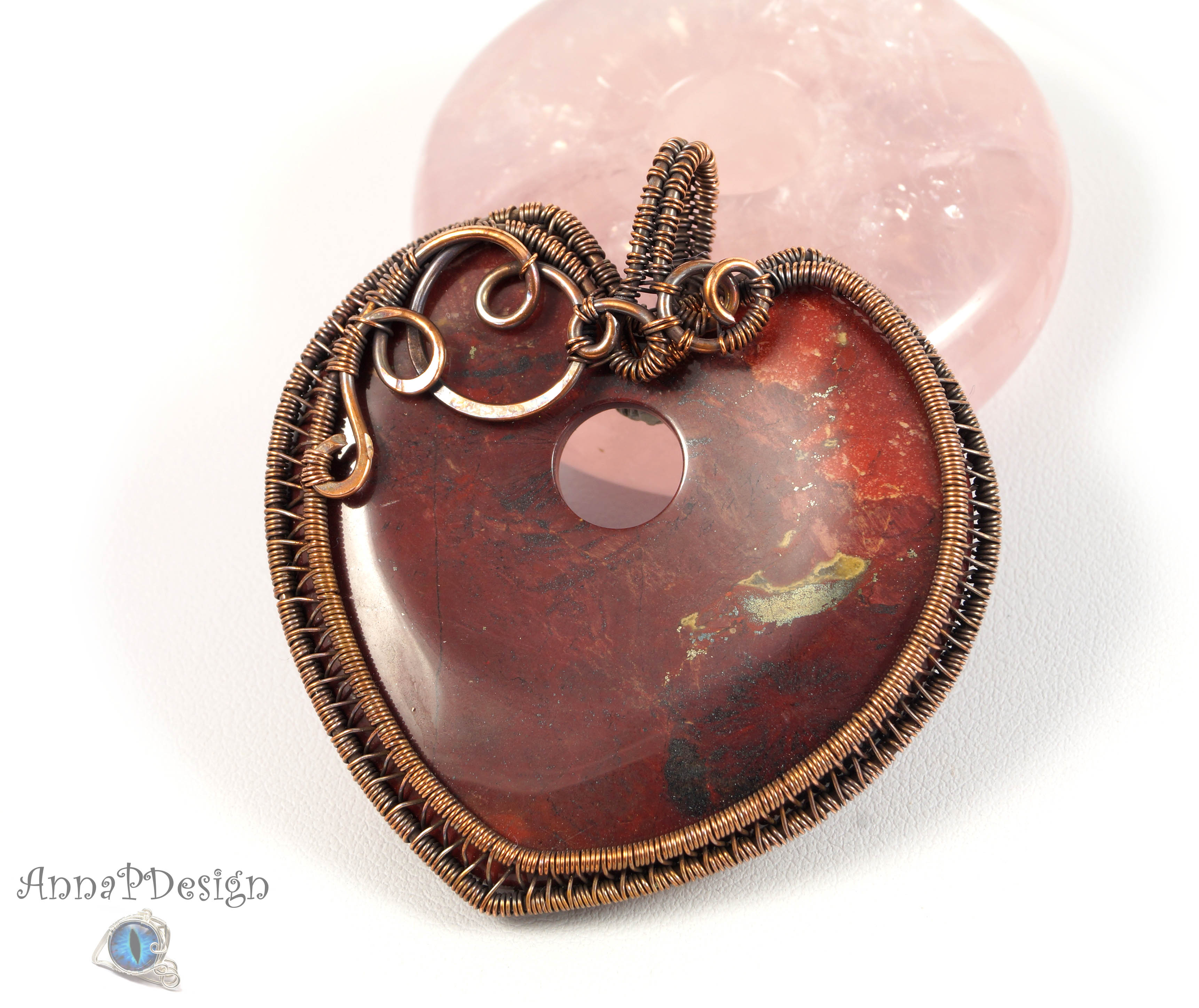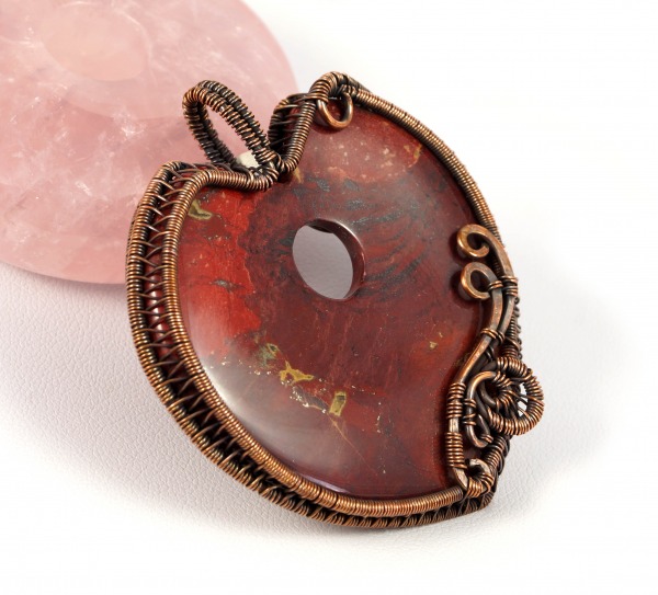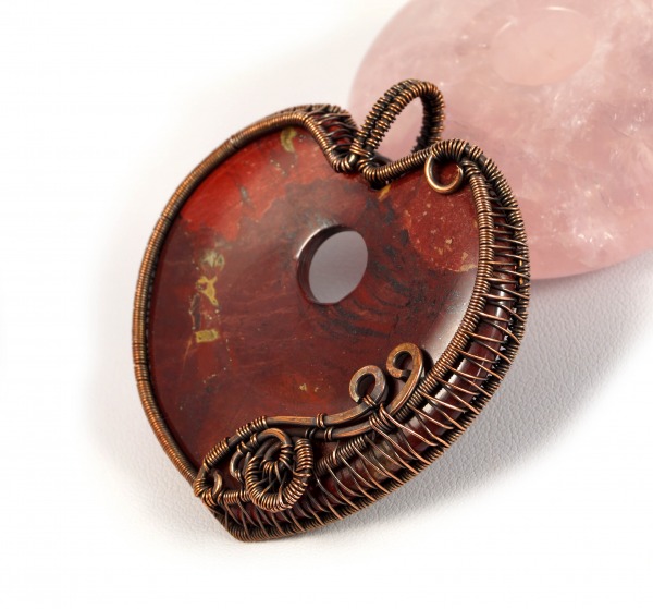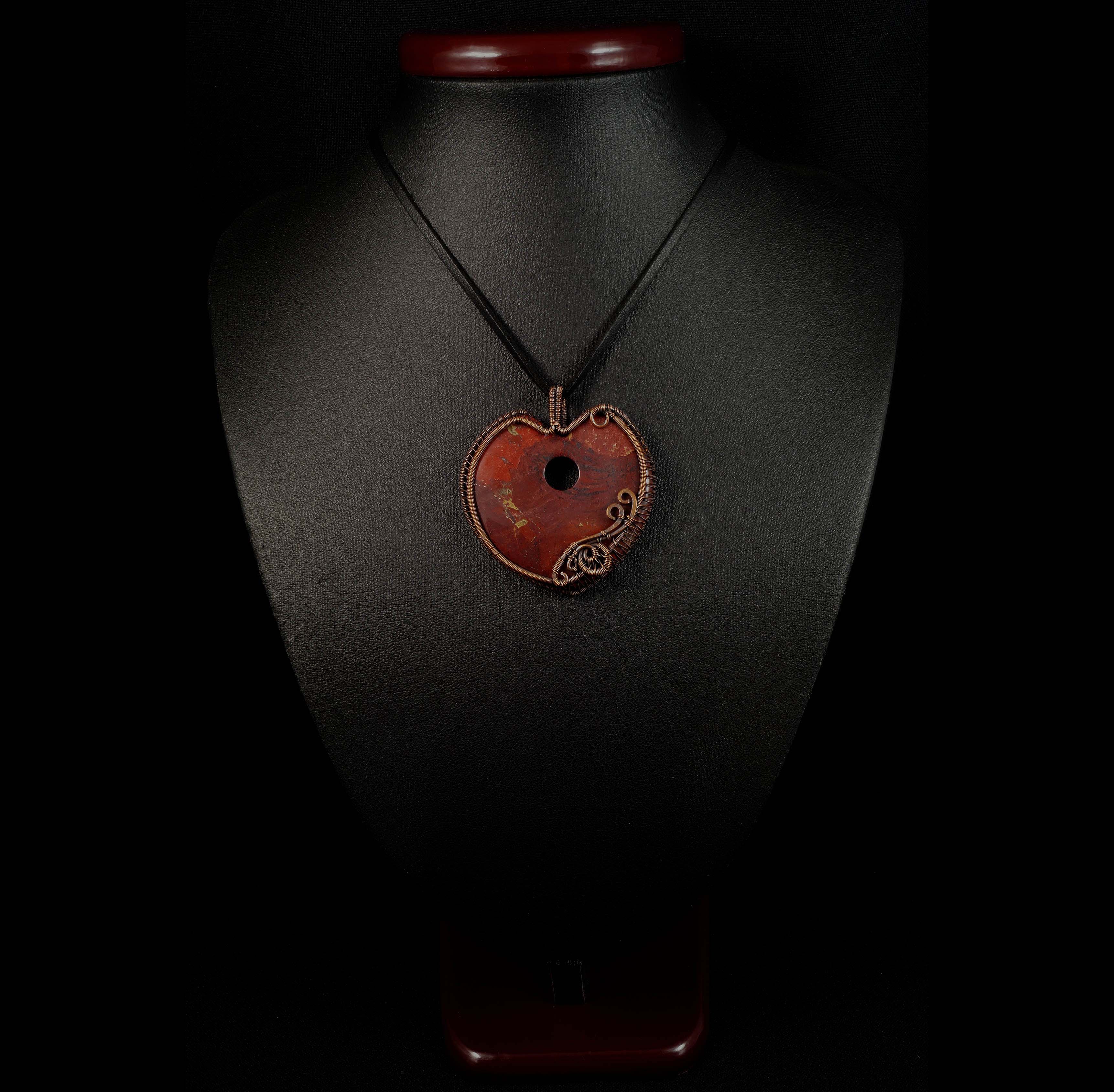 Jaspis, Wisior z miedzi z jaspisem czerwonym serce, dwustrony, niepowtarzalny prezent