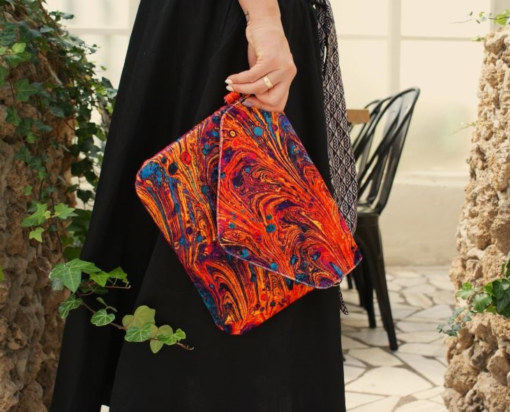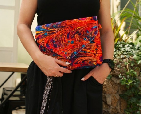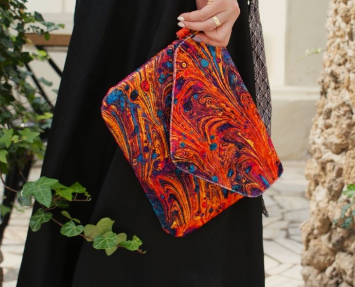 Wykonana z syntetycznego weluru oraz bawełnianej podszewki z kieszonką na zamek i smyczką na klucze.