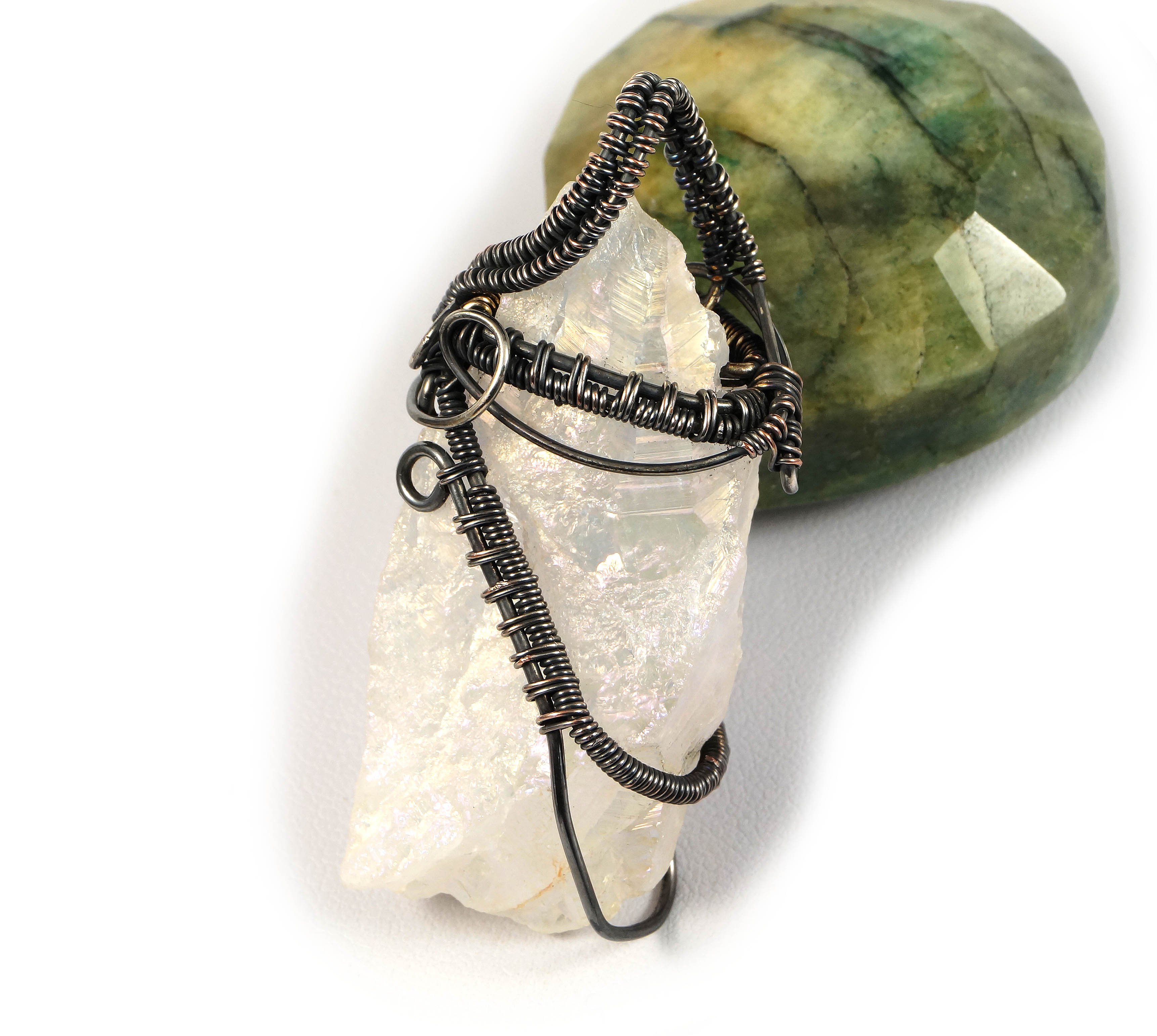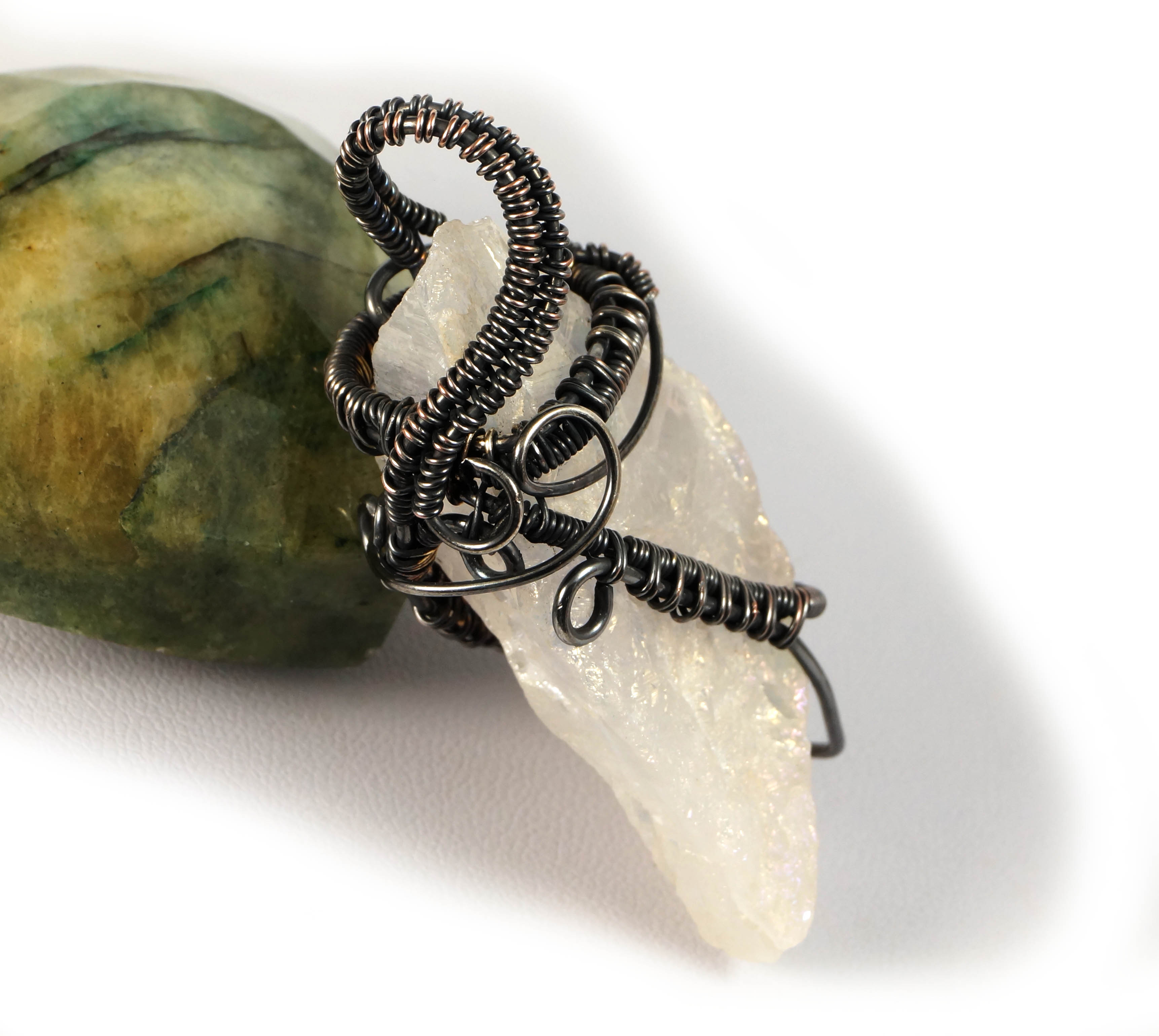Wisior zaprojektowany i wykonany przeze mnie od podstaw bardzo pracochłonną i precyzyjną techniką wire-wrapping z patynowanej miedzi.