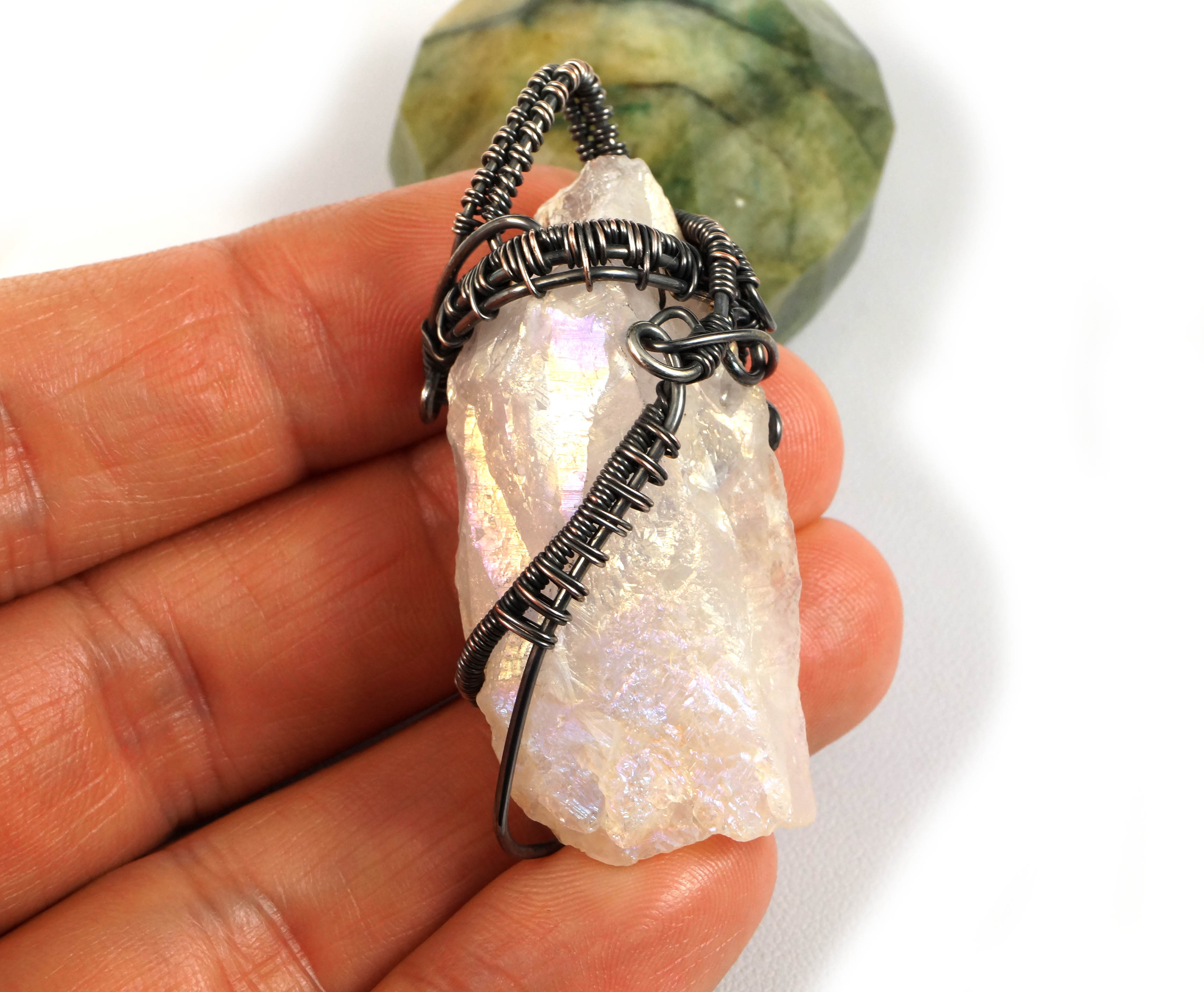 Nietuzinkowy wisior z bryłką kryształu górskiego pokrytego tytanem.
