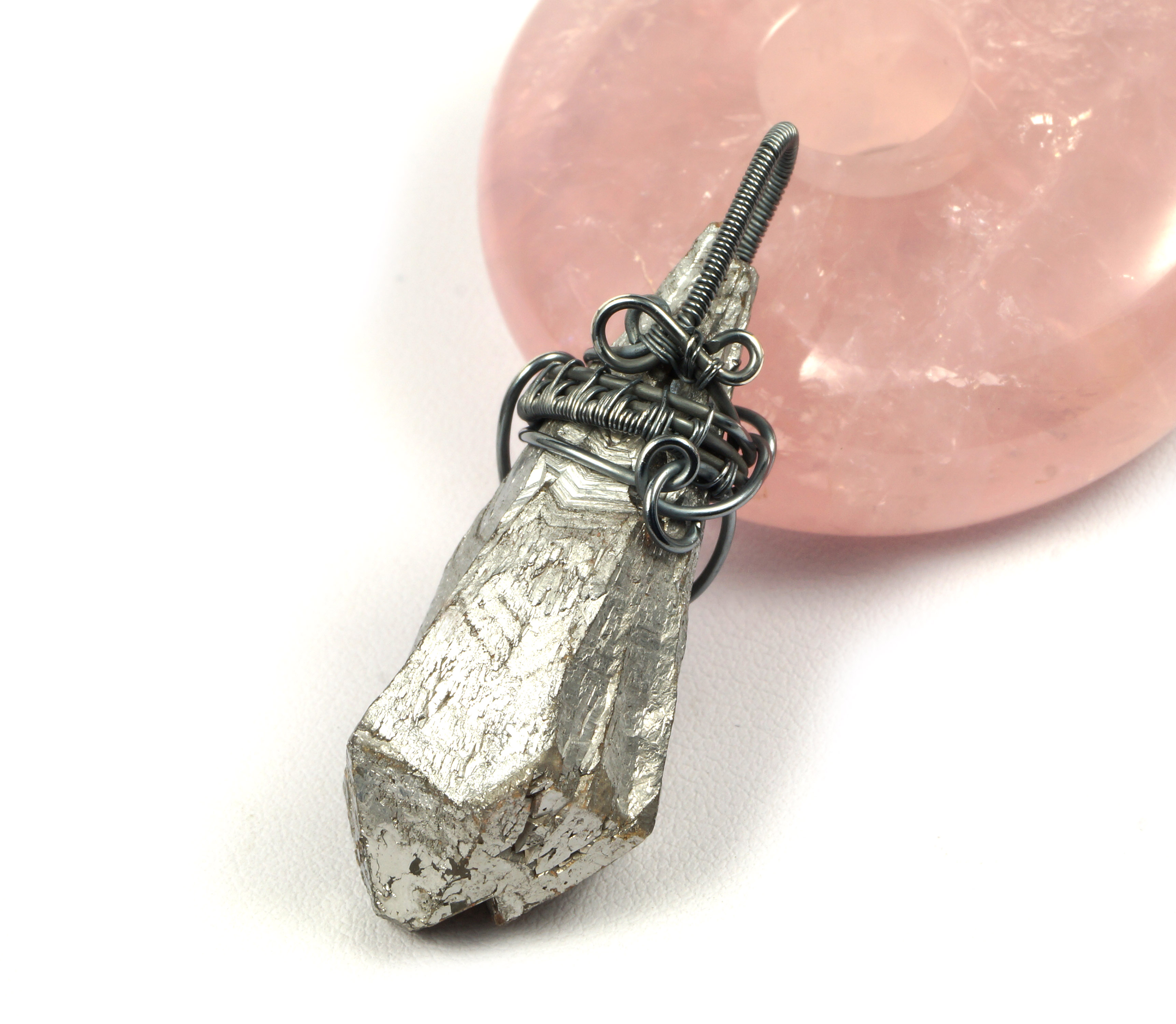 Bajeczny, misternie pleciony wisior z kwarcem tytanowym.