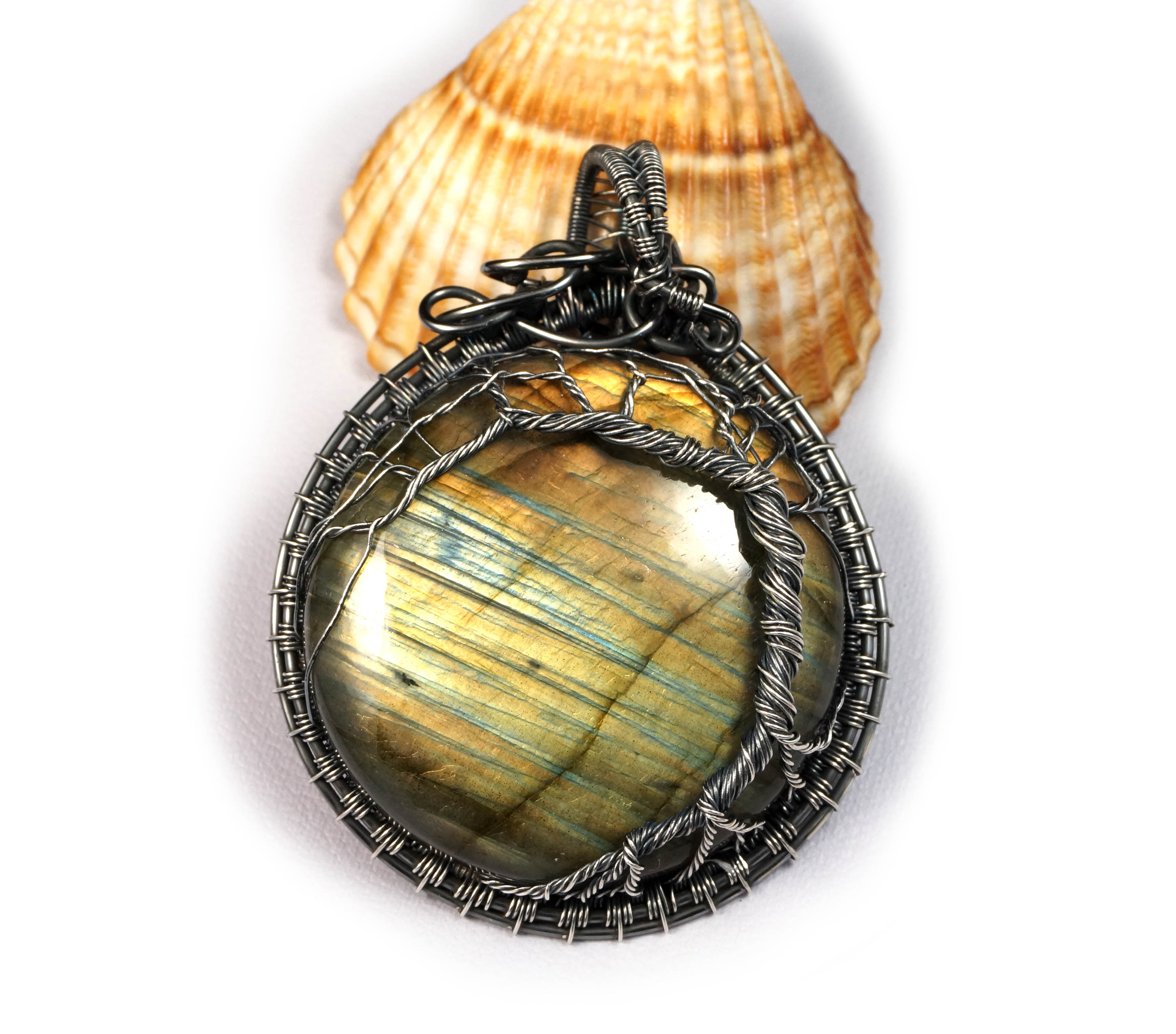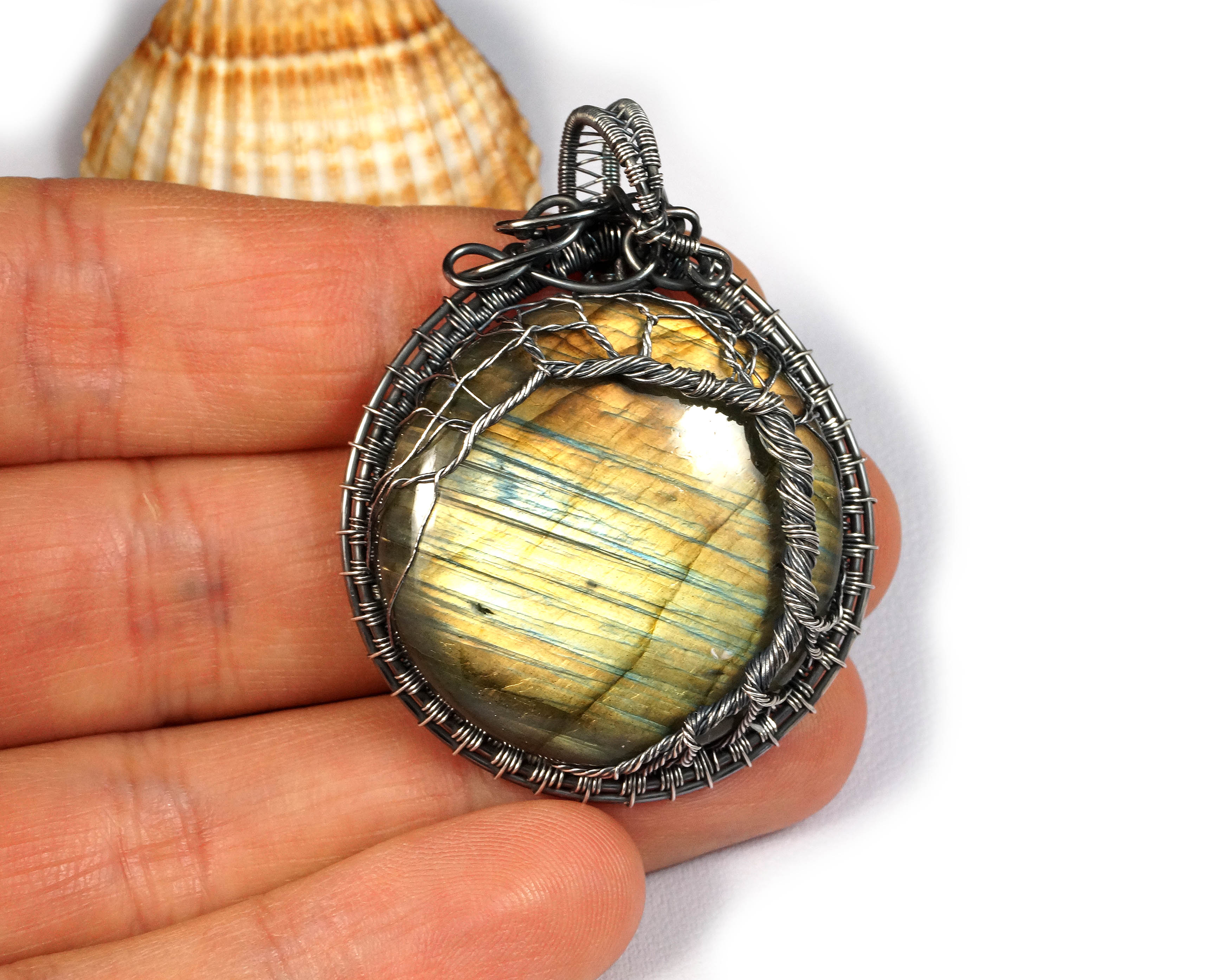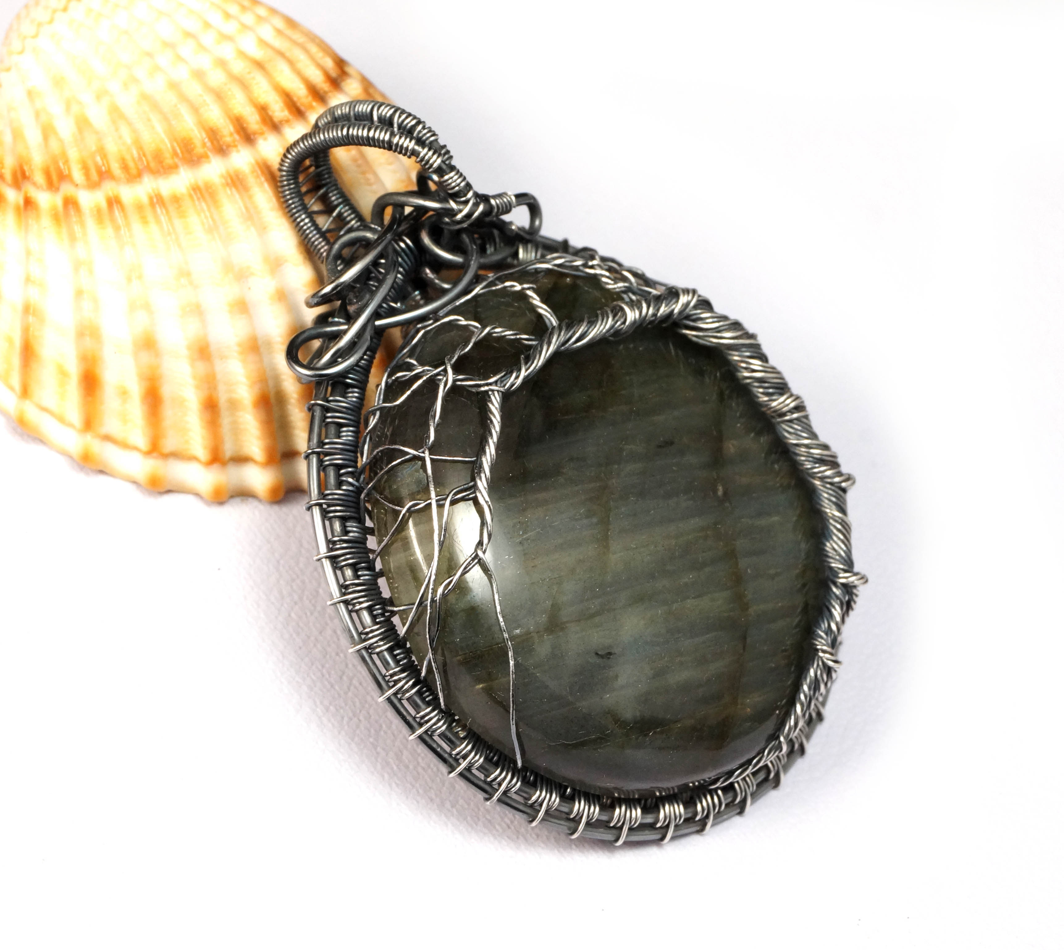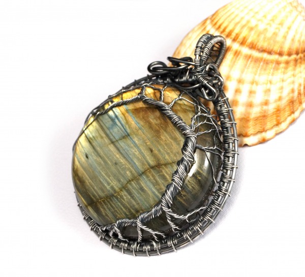 Bajeczny, misternie pleciony wisior z labradorytem drzewko szczęścia. Wisior zaprojektowany i wykonany przeze mnie od podstaw bardzo pracochłonną i precyzyjną techniką wire-wrapping z oksydowanego srebra próby 925 oraz 999.