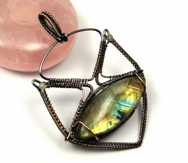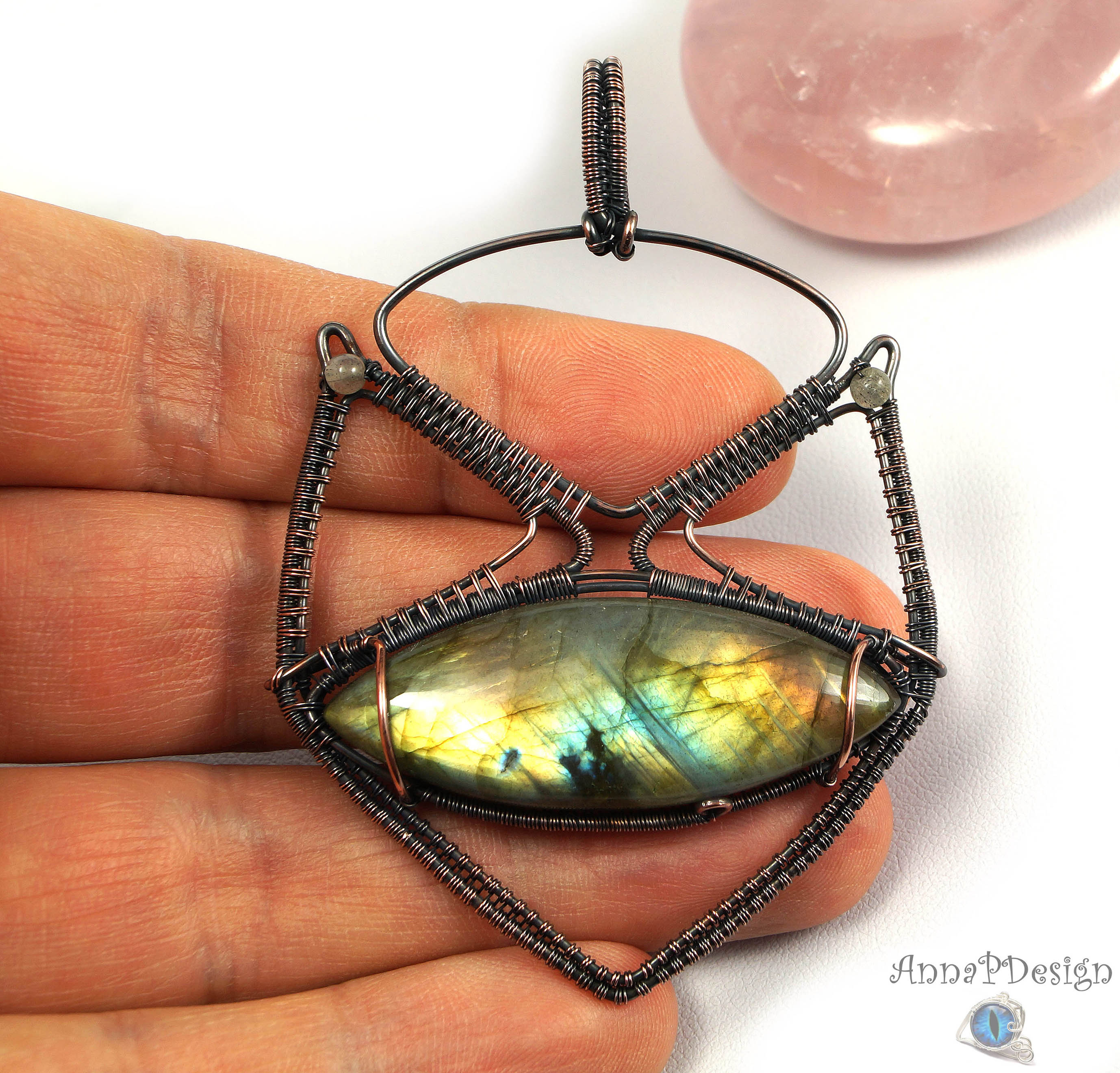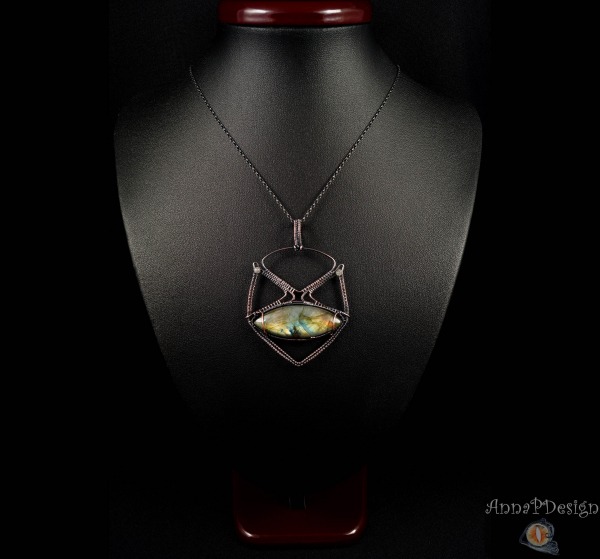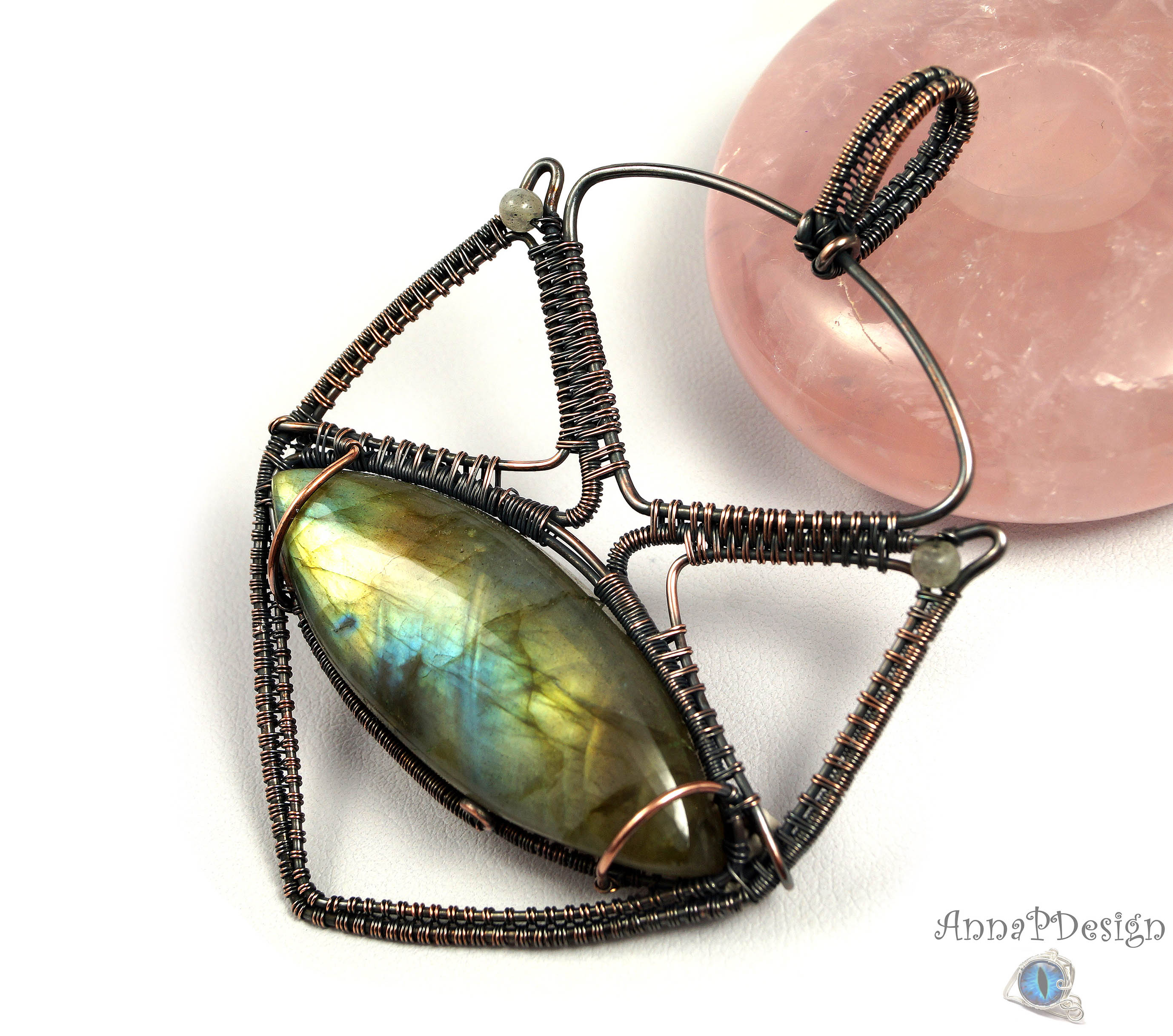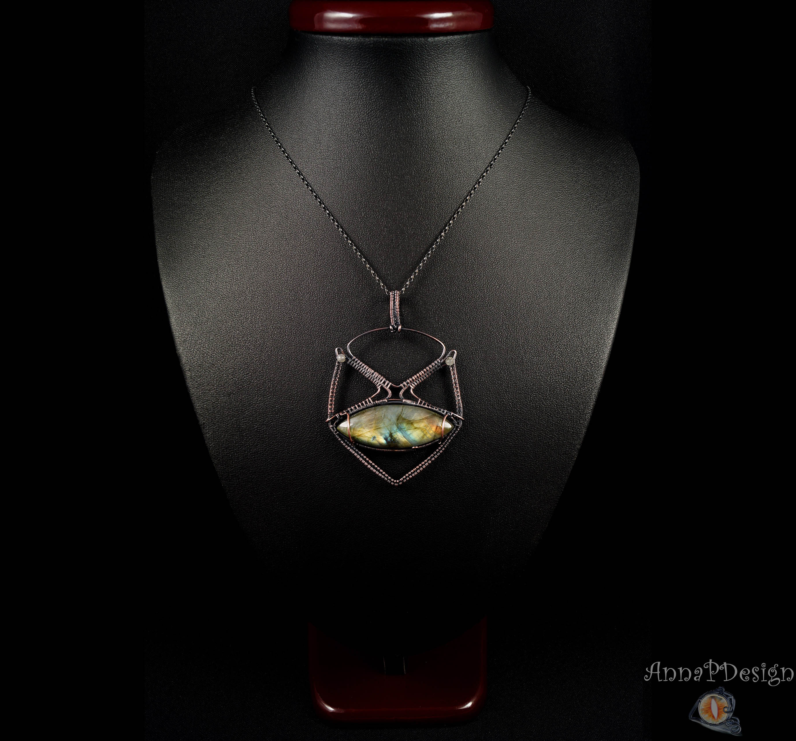 Bajeczny, misternie pleciony wisior z żółto niebieskim kaboszonem labradorytu. Wisior zaprojektowany i wykonany przeze mnie od podstaw bardzo pracochłonną i precyzyjną techniką wire-wrapping z patynowanej miedzi (czernionej). Dzięki procesowi czernienia wszystkie detale są uwypuklone.