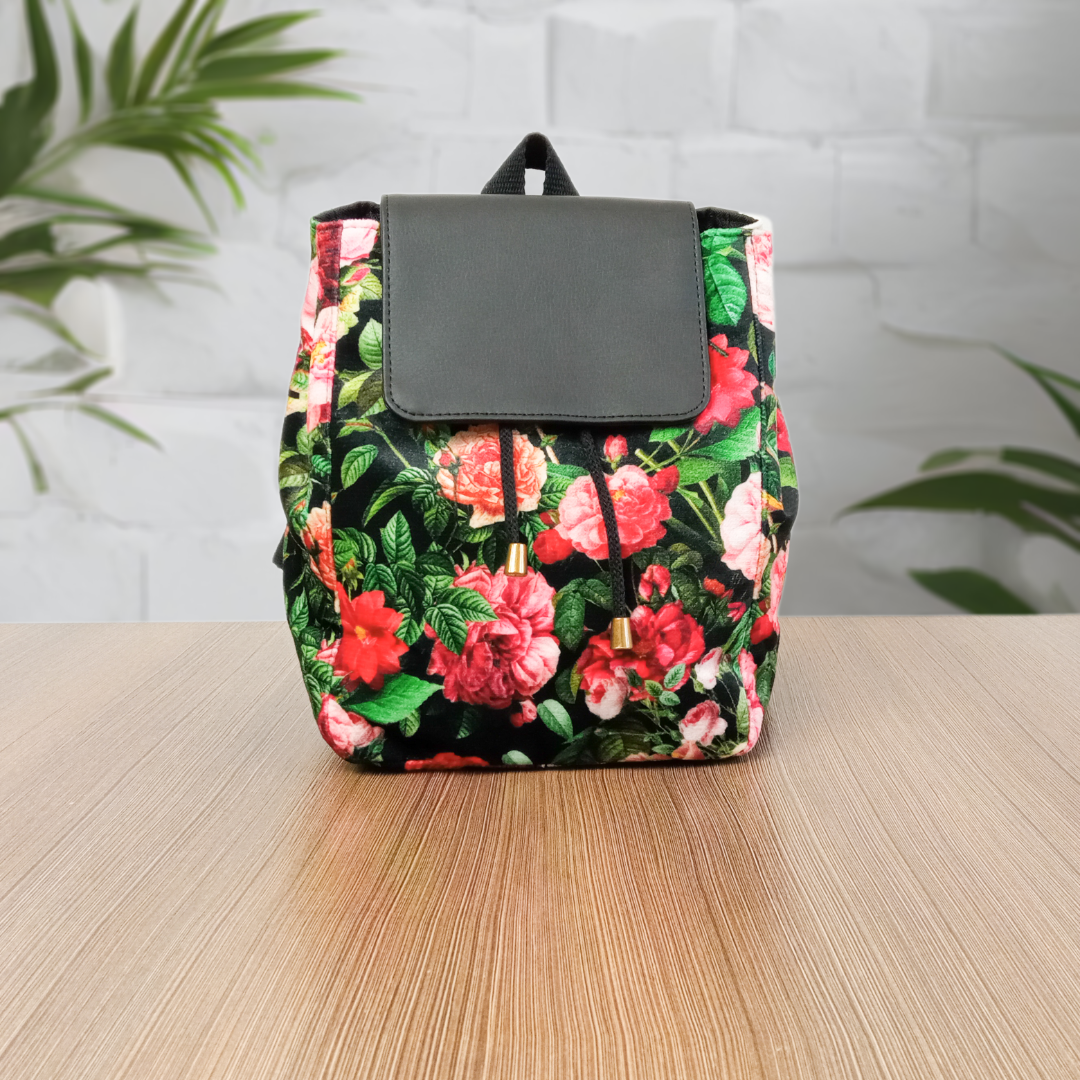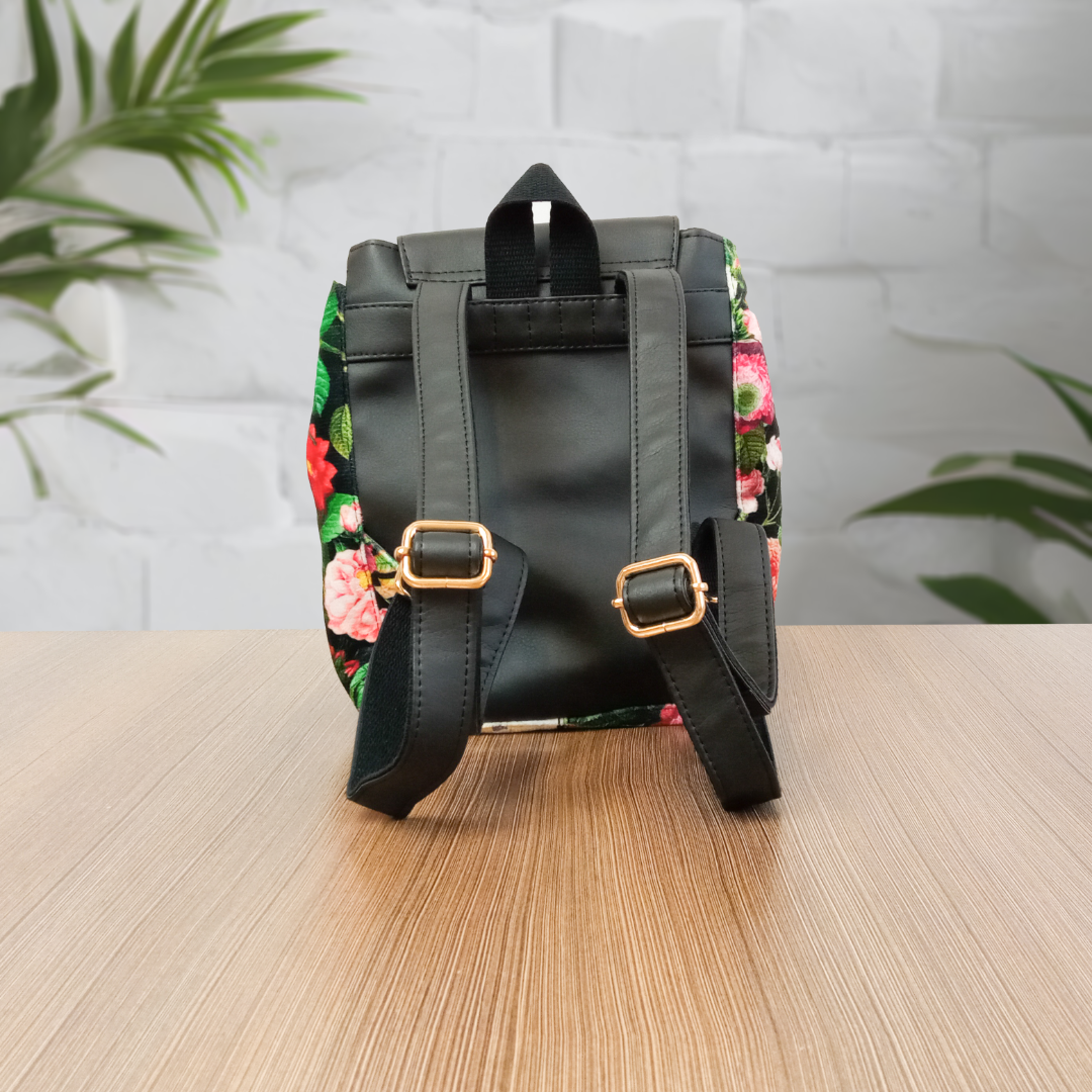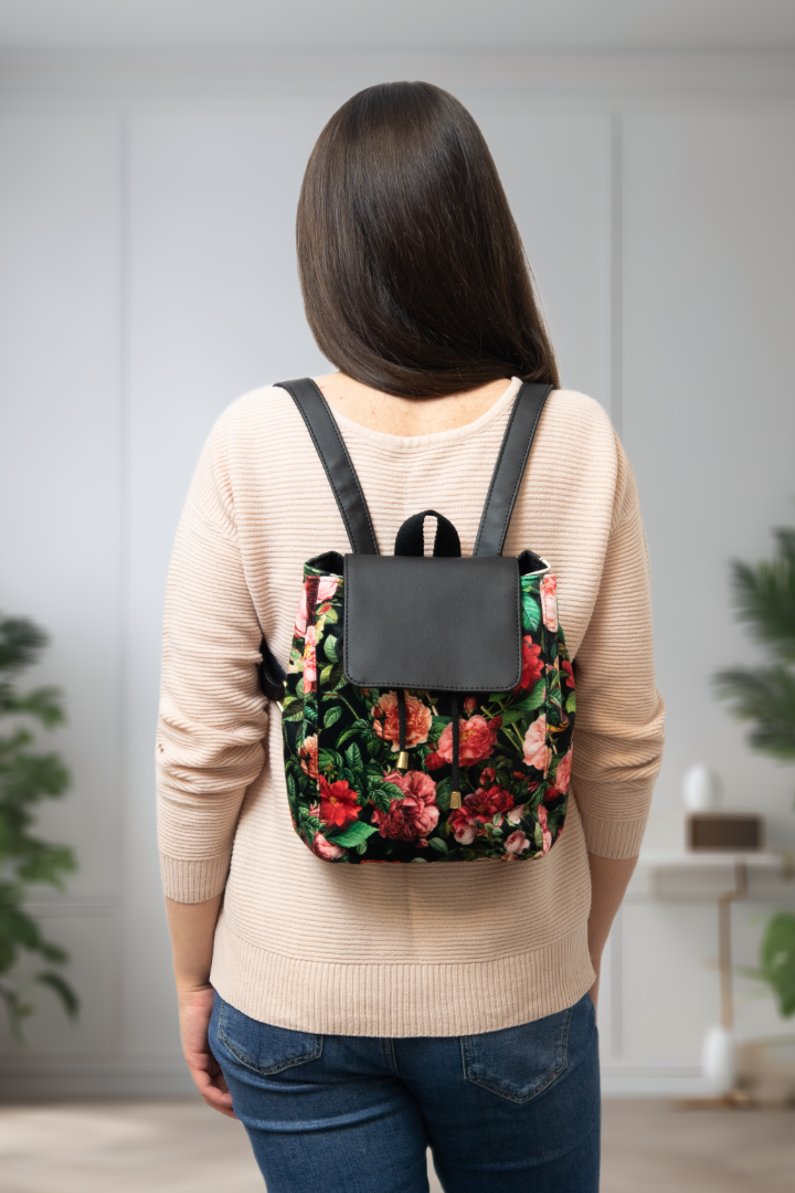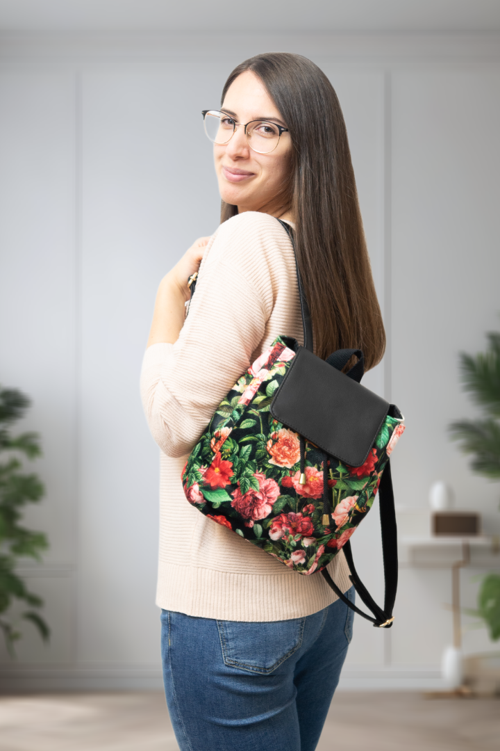 Mały czarny plecak w czerwone kwiaty, z klapką