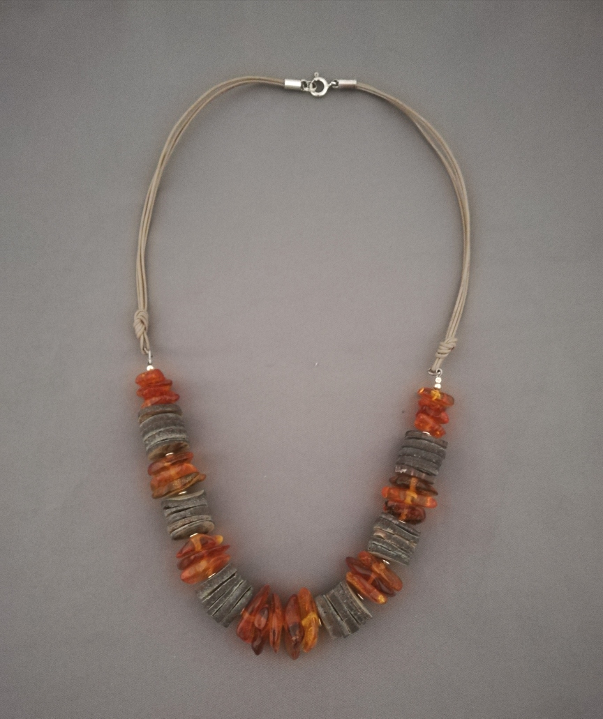 Naszyjnik z muszli tęczowej i bursztynu w kolorze koniakowym .Talarki muszli o średnicy 16 mm, bryłki bursztynu nieregularne nieco wystają.Poszczególne segmenty oddzielane srebrnymi satelitkami 3mm. Wykończenie rzemykiem skórzanym w kolorze beżowo szarym, końcówki i zapięcie ze srebra pr.925. Długość naszyjnika ok. 50 cm. Mogę dodać kilka cm regulacji.