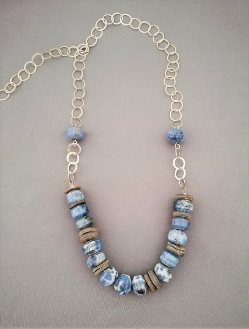 Długi naszyjnik ze srebra i agatu w kolorze niebiesko-szarym, przekładanych krążkami muszli tęczowej. Kamienie wielkości ok 16x10mm, nieco zróżnicowanej. Srebrny łańcuszek z płaskich ogniw wielkości ok 8-9 mm, umożliwia regulację długości . Całkowita długość to 62 cm, środkowa część z kamieni -17 cm.