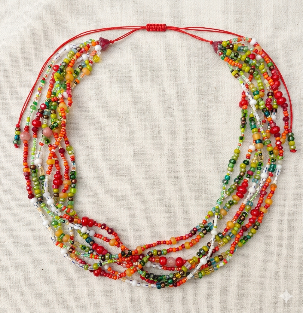 Odkryj energię kolorów z wielowarstwowym naszyjnikiem w stylu boho. To unikalne połączenie setek drobnych koralików w odcieniach soczystej czerwieni, zieleni i bieli, które stworzy efektowny akcent w każdej stylizacji. Dzięki regulowanemu zapięciu sznurkowemu idealnie dopasujesz go do dekoltu, nadając lekkości zarówno casualowym, jak i eleganckim zestawom.