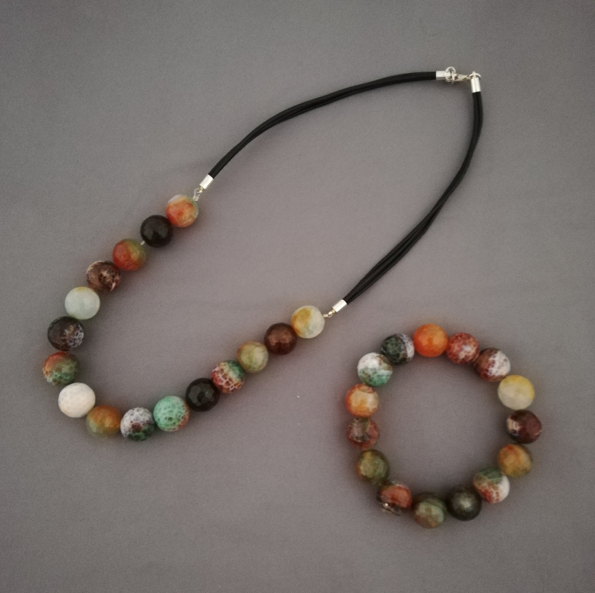 Naszyjnik z kulek agatu wielkości 14 mm, wykończony rzemieniem skórzanym. Kulki, końcówki i zapięcie metalowe, posrebrzane, bez niklu. Kamienie w kolorach ziemi, w tonacji beżu, brązów , zieleni, częściowo mgliste. Bransoletka na gumce, , pasuje na nadgarstek 18-19 cm. Istnieje możliwość dopasowania rozmiaru. Poszczególne zestawy mogą się nieznacznie różnić ze względu na naturalne kamienie.