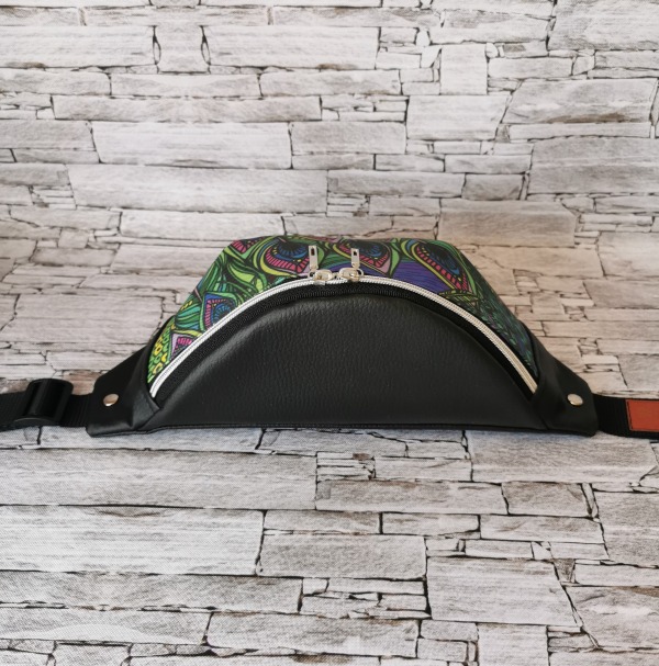 Nerka saszetka biodrowa w rozmiarze L. Przód nerki to tkanina wodoodporna w piękny wzór pawich piór. Tył nerki, boki, klapka wykonane są z czarnej ekoskóry. Nerka usztywniona, pasek z regulacją. Podszewka w kolorze zielonym Wewnątrz kieszonka zamykana na zamek
