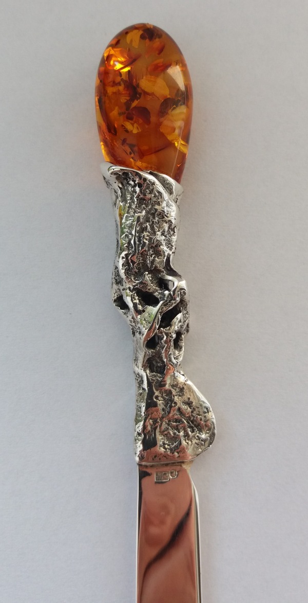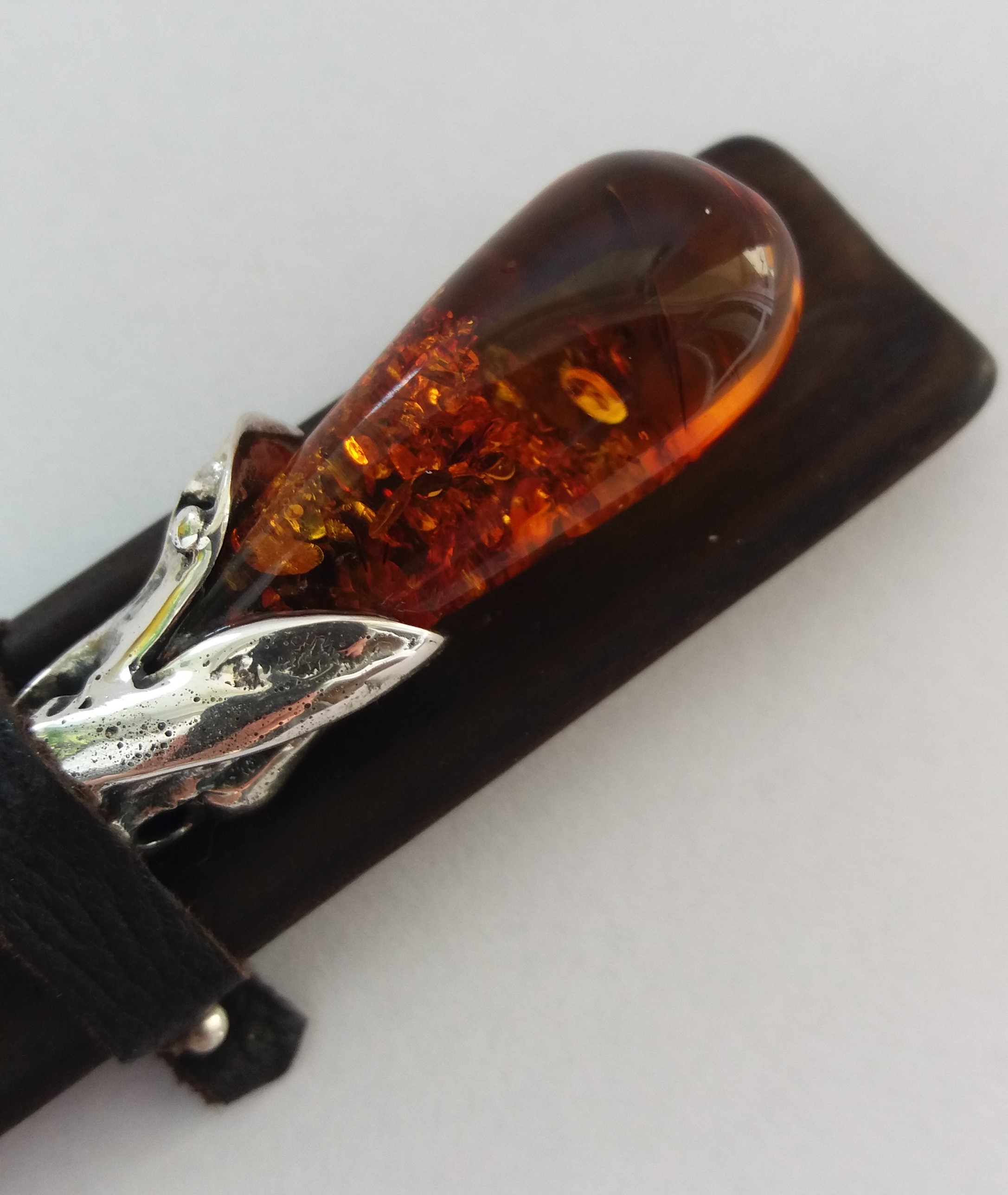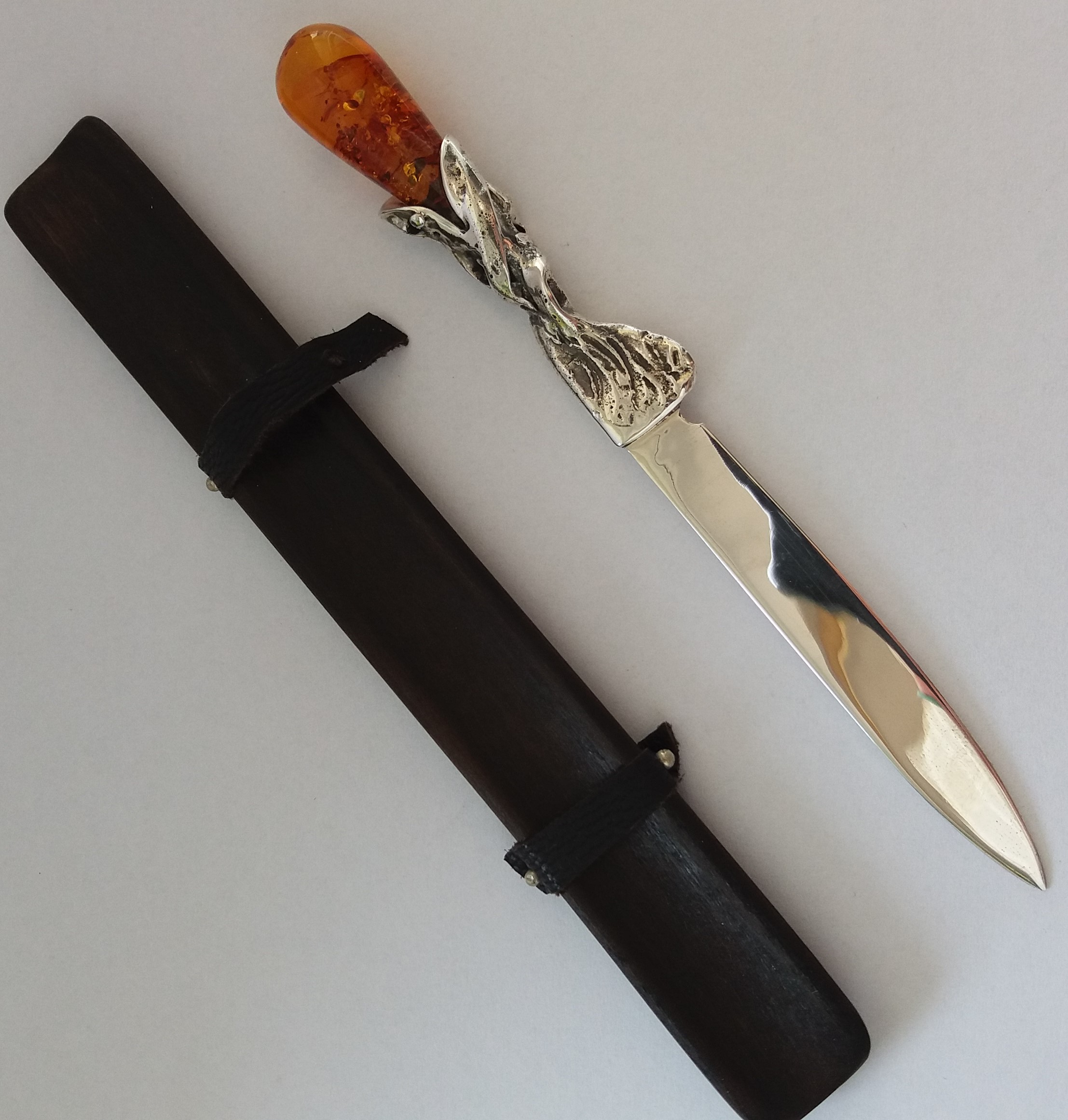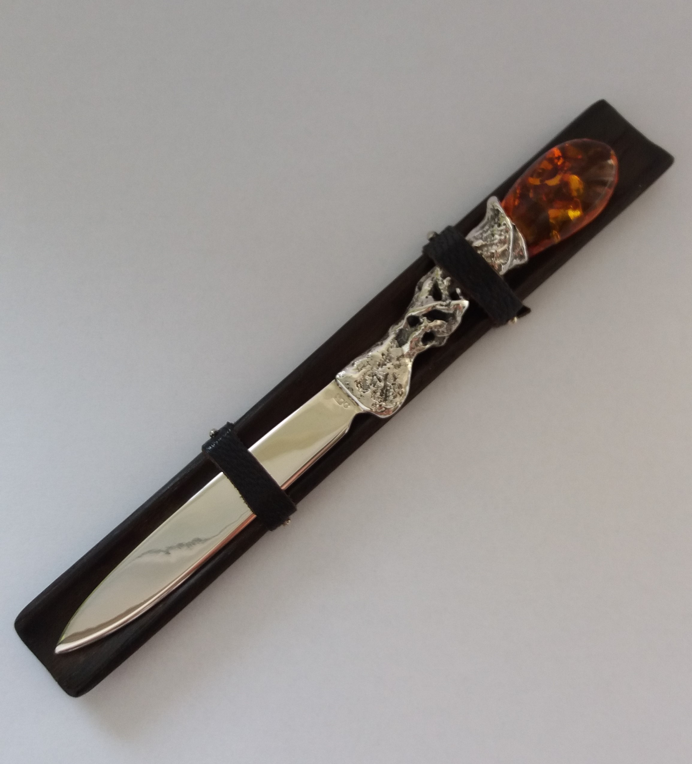 NÓŻ DO PAPIERU - srebro pr. 875 z bursztynem w odcieniu koniaku w drewnianym korytku przypięty skórzanymi paskami to elegancki prezent dla prezesa, dyrektora, szefa, szefowej i dla każdego miłośnika ekskluzywnych przedmiotów użytkowych.