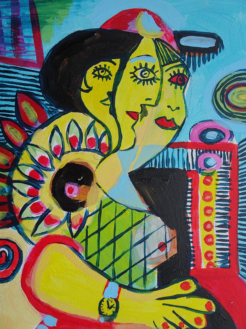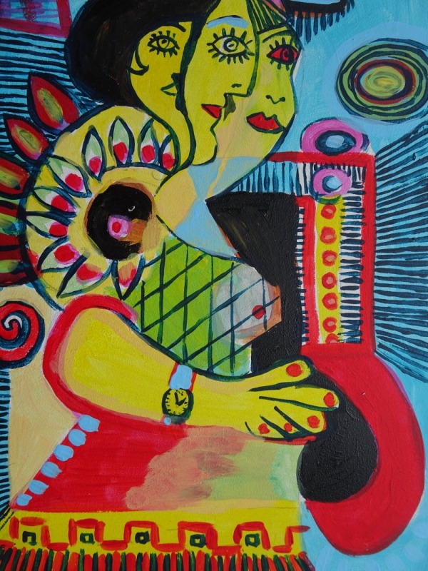 Obraz namalowany akrylami na płycie o wymiarach: a4, 21/29,7 cm, sygnowany z przodu. Jest to moja autorska kompozycja. Świetnie może być eksponowany w nowoczesnych wnętrzach o stonowanej kolorystyce. Swoimi barwami może rozjaśnić takie wnętrza, w oświetleniu dziennym, jak i sztucznym.